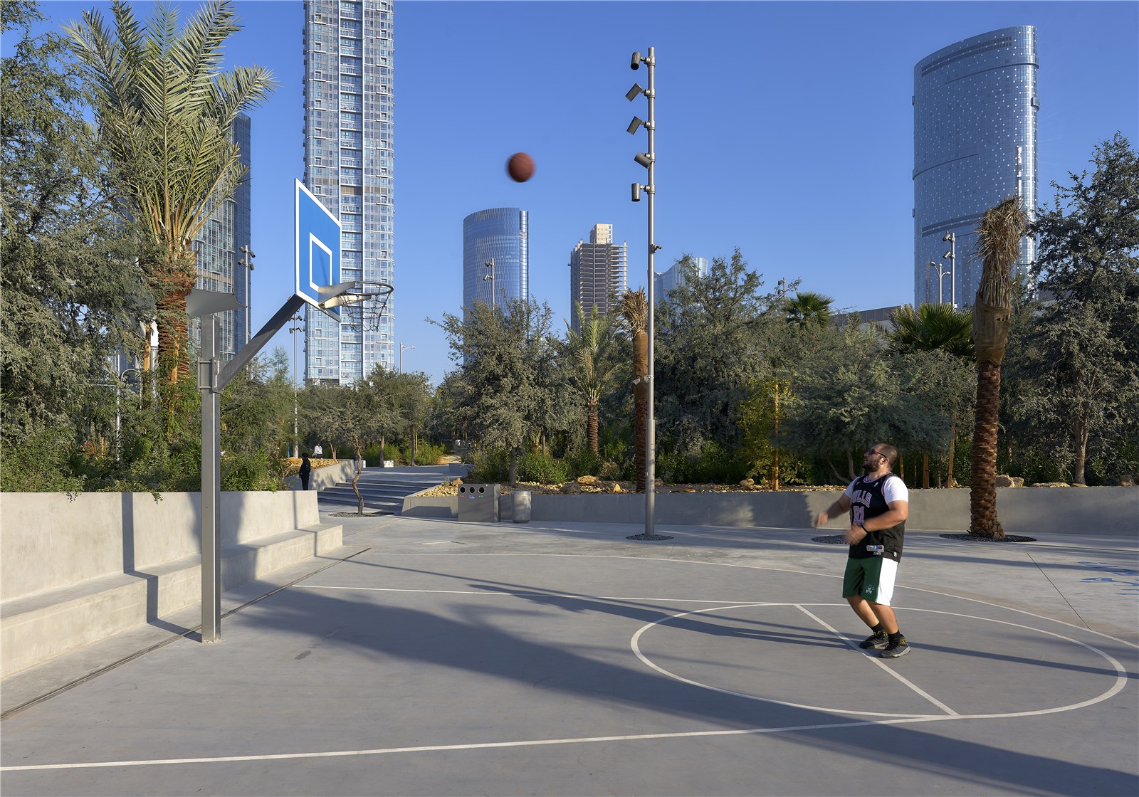 As the first biodiversity park in the UAE, Al Fay Park contains more than 2,000 native trees and bushes – including the national Ghaf trees that have been replanted from desert nurseries into the park – all specifically chosen to strengthen biodiversity for both plants and wildlife and to maximize natural cooling throughout the park. The resulting microclimate reduces traffic noise and temperature and creates a distinct forest-like environment. The specifically designed sloping entrances funnels the cooler southern breeze down into the park while local grasses and bushes reduce sand infiltration.