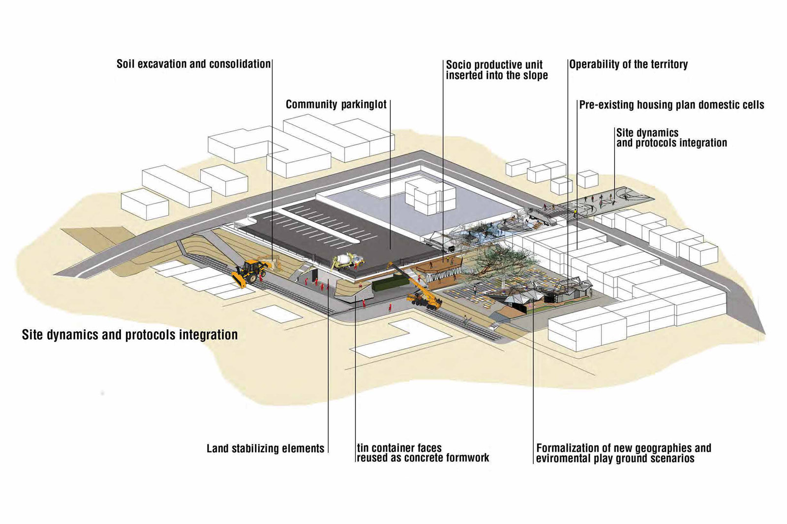 在80年代初期制定的大規(guī)模網(wǎng)格狀住房規(guī)劃與圍繞在其邊緣的非正式居住地——棚戶區(qū)之間的對(duì)抗關(guān)系中,改造提案由此而生。在過(guò)去十年里,這種情況不斷加劇,在市民之間建立了無(wú)法逾越的封閉障礙和心理邊界。社會(huì)對(duì)這類邊緣空間的排斥與放棄,使得這一過(guò)渡區(qū)域成為違法與犯罪的溫床。