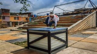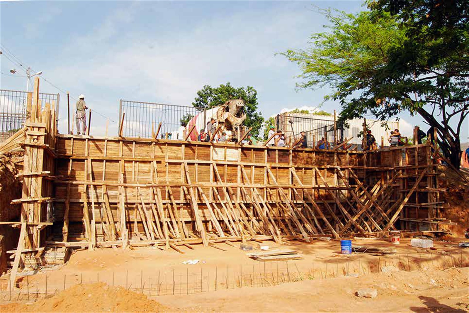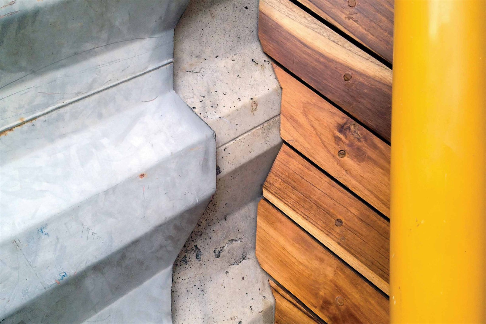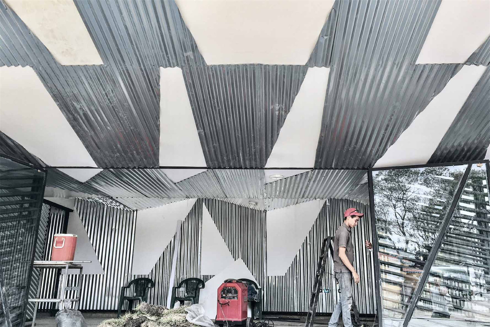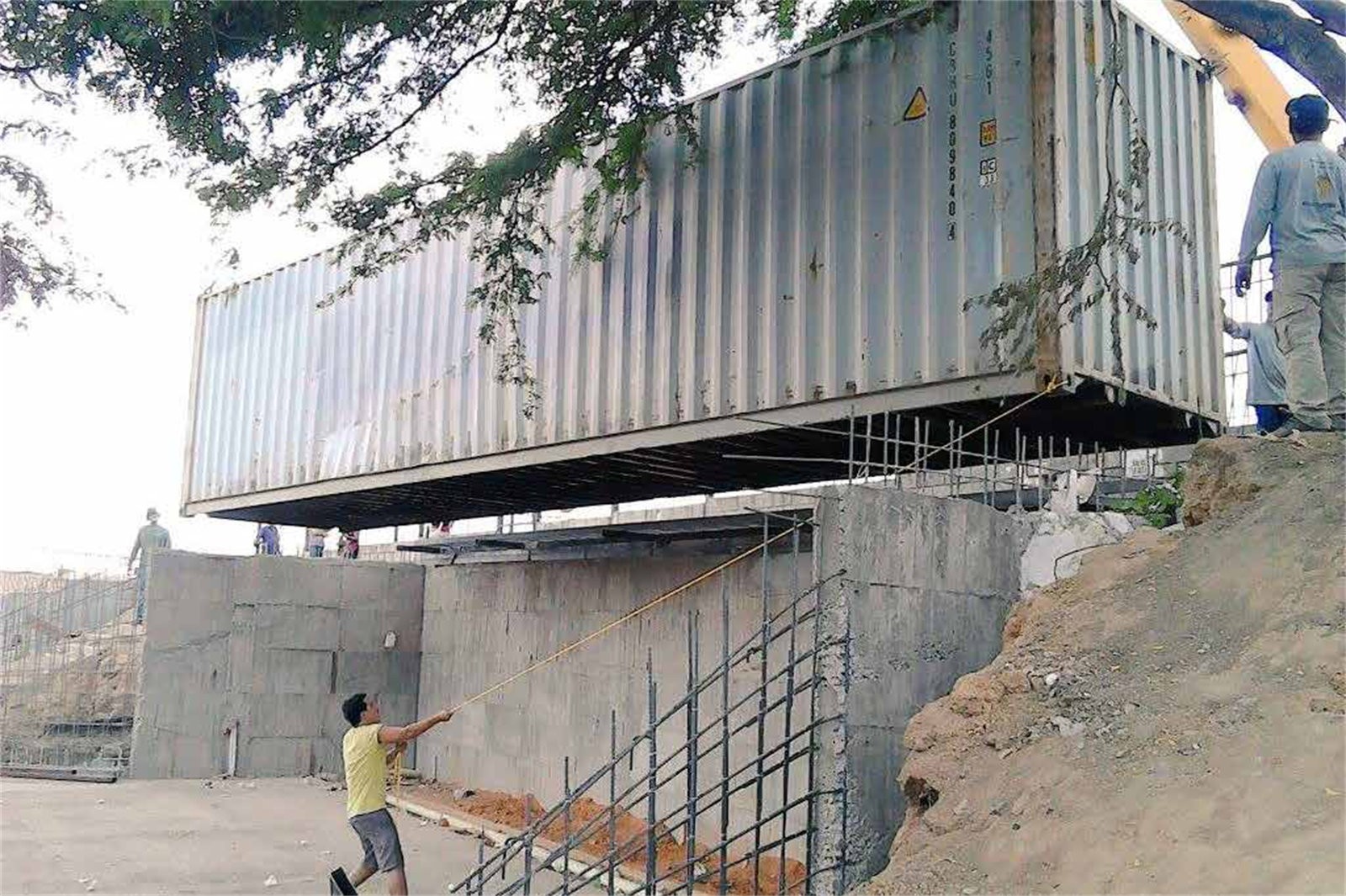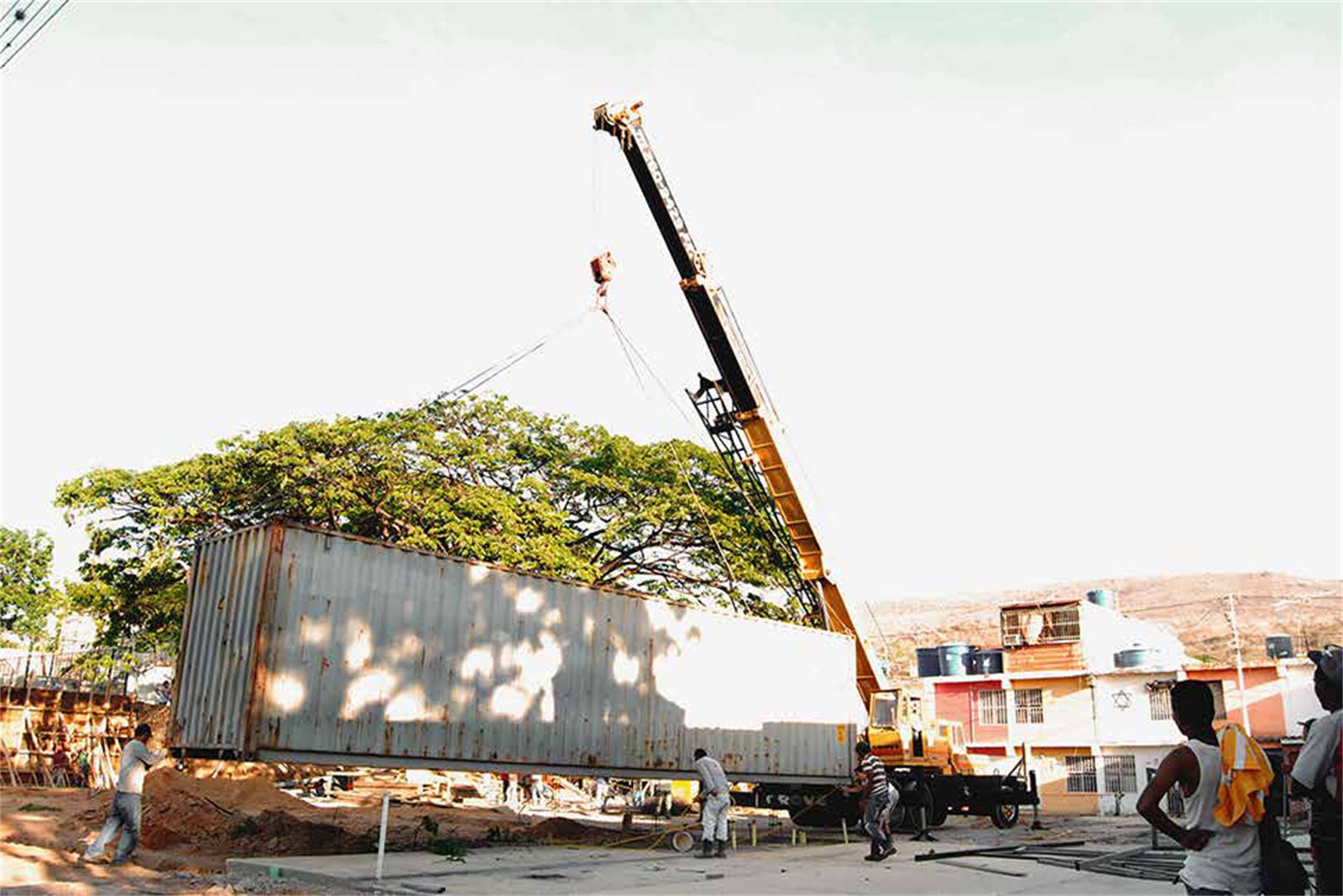 場(chǎng)地坡度是空間內(nèi)亟需解決的一大問(wèn)題,由于頂部缺乏排水裝置,積水給園區(qū)和周邊住宅帶來(lái)了不便,現(xiàn)有植物的根部也因水流裸露出來(lái)。通過(guò)挖掘土方、置入捐贈(zèng)的預(yù)制裝置和建造擋土墻等措施,斜坡得以保持穩(wěn)定。這些單元構(gòu)件按社會(huì)生產(chǎn)需求來(lái)布置,其主要表面被移除,以便于通行,同時(shí)也是承重墻的構(gòu)配件。景觀的施工操作和新地形的創(chuàng)建,使得找平后的地面為第二組生產(chǎn)裝置的置入打開(kāi)了方便之門。這些集裝箱成為多樣化項(xiàng)目規(guī)劃的生產(chǎn)場(chǎng)地單元:信息中心、家具制造車間、舞臺(tái)設(shè)備存放和專為節(jié)日制作禮服的紡織車間,確保了社區(qū)的逐步穩(wěn)定發(fā)展。