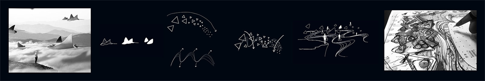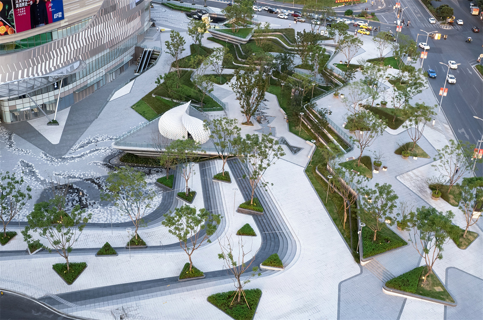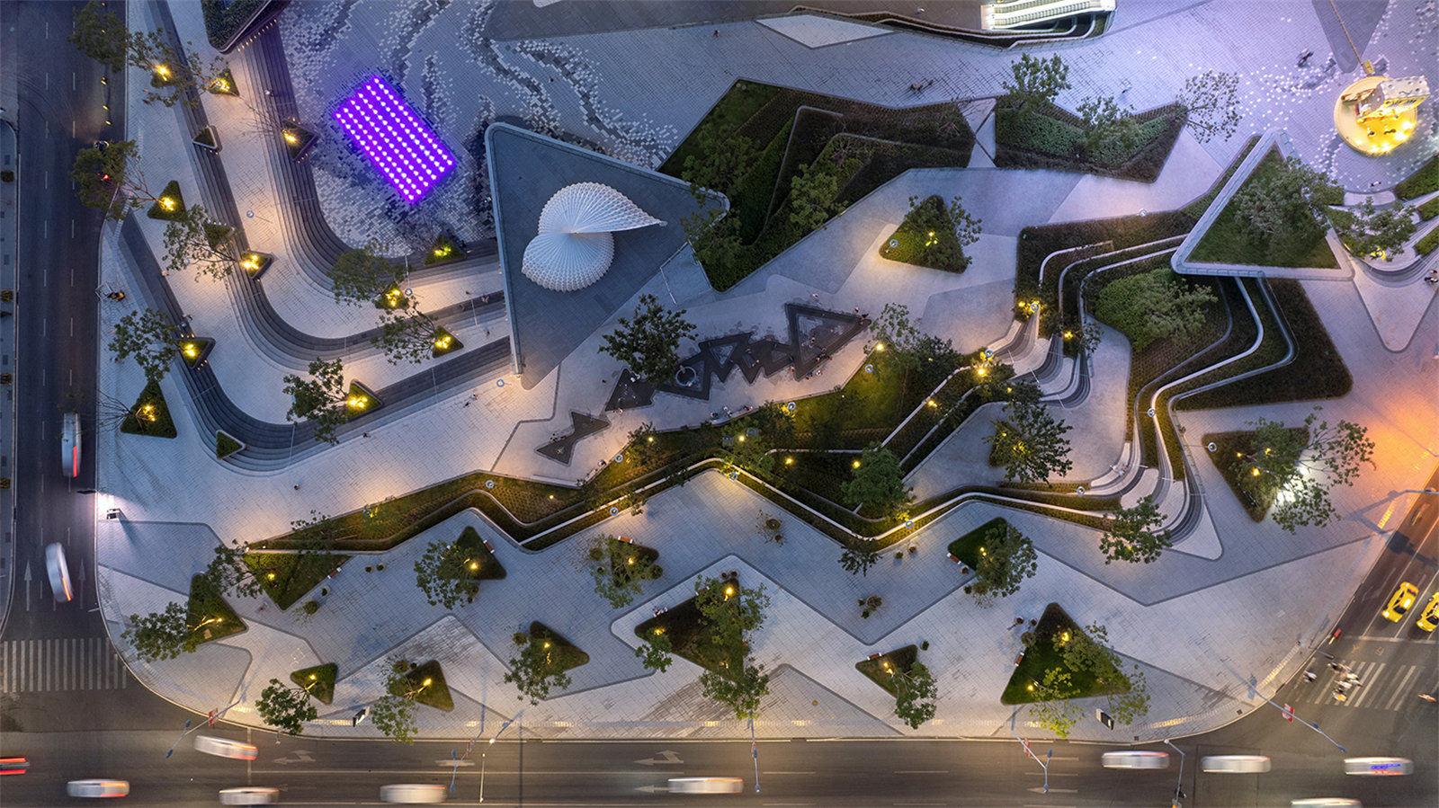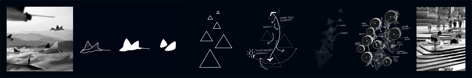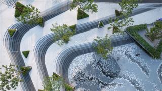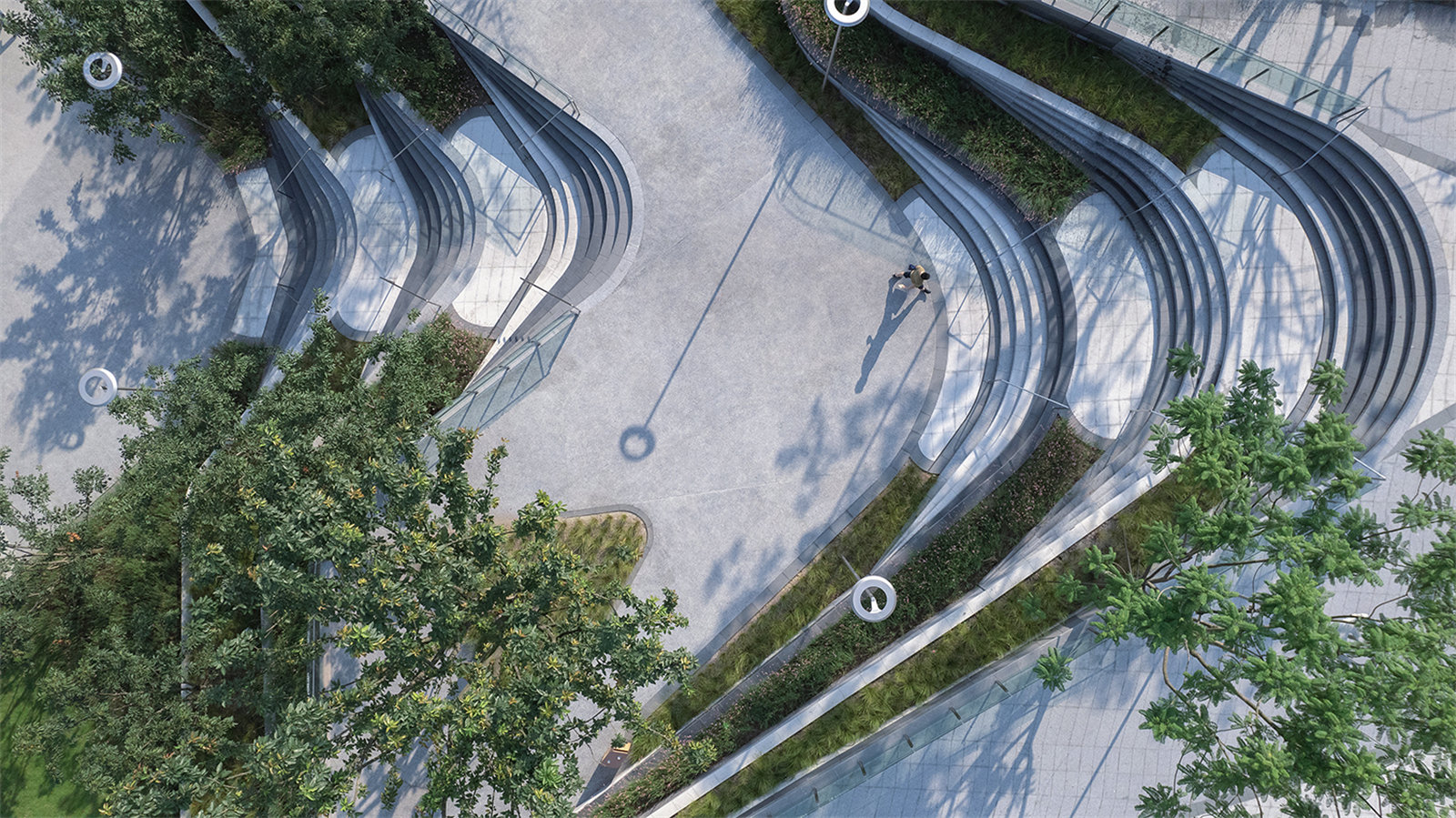 項目都市到達廣場成為周圍社區(qū)和購物公園之間的天然過渡區(qū),通過一系列起伏變化的空間,和層次豐富的綠植設(shè)置,營造出夢幻般的海底世界,結(jié)合從魔鬼魚(manta ray)中提取的抽象元素,吸引人們進入這里,仿佛置身真實的海底世界,這里有一群“魔鬼魚”在這一片海洋空間中自由暢游。