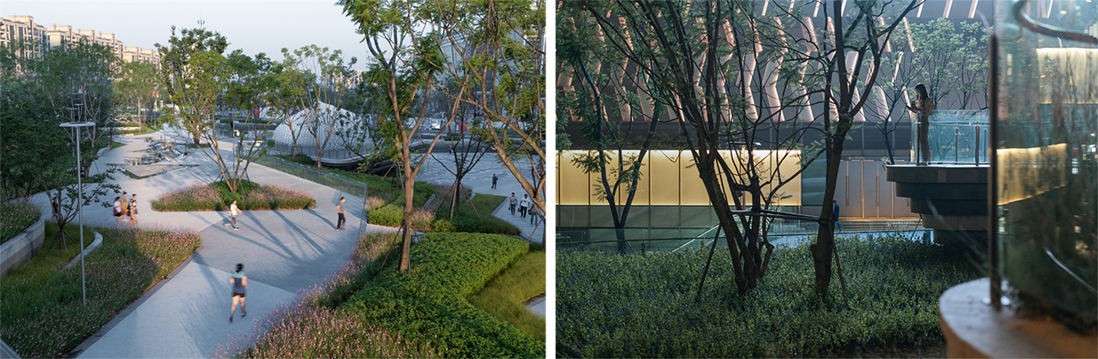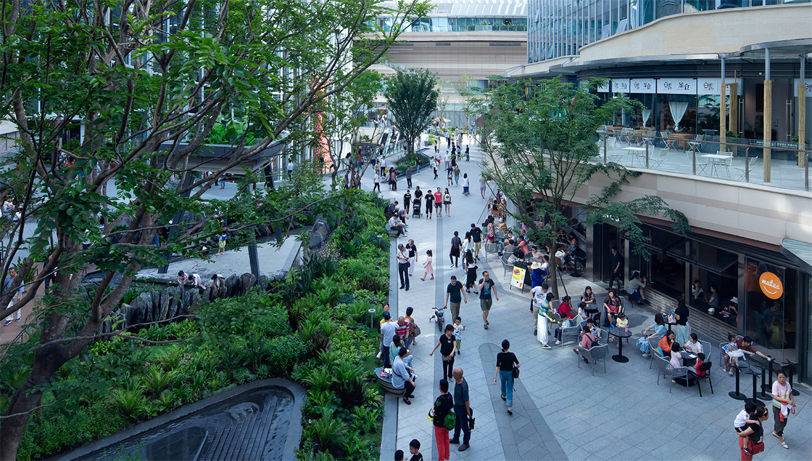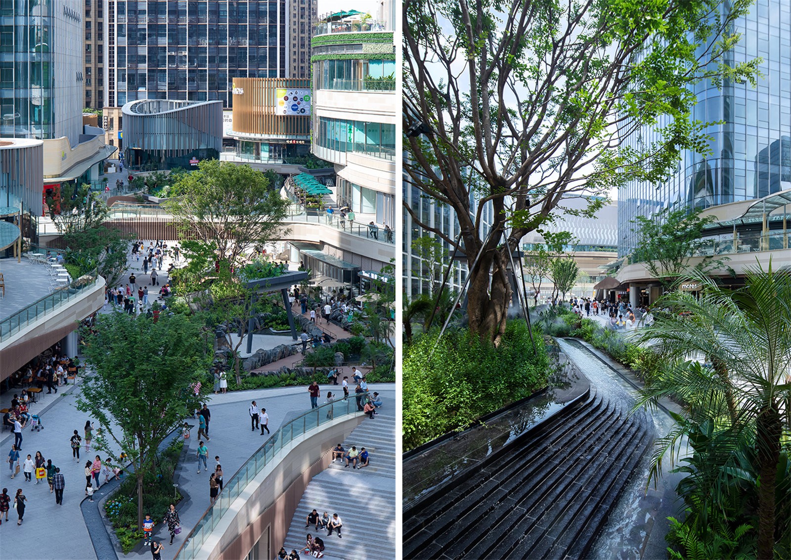 人們身處互聯(lián)網(wǎng)的迅速發(fā)展、全球氣候惡化、疫情頻發(fā)的當(dāng)代,對于新空間的訴求也不斷產(chǎn)生變化。香港置地和設(shè)計師們開始重新審視公共商業(yè)零售空間的定位和作用。光環(huán)購物公園重新定義了公共商業(yè)空間模式,即是將自然、社會文化帶入商業(yè)空間使其轉(zhuǎn)變?yōu)榫哂猩缃粚傩?、自然屬性的綜合空間,為在城市中生活的人們創(chuàng)造更多美好瞬間和體驗,并在實際景觀設(shè)計策略上緩解城市生態(tài)環(huán)境的壓力。