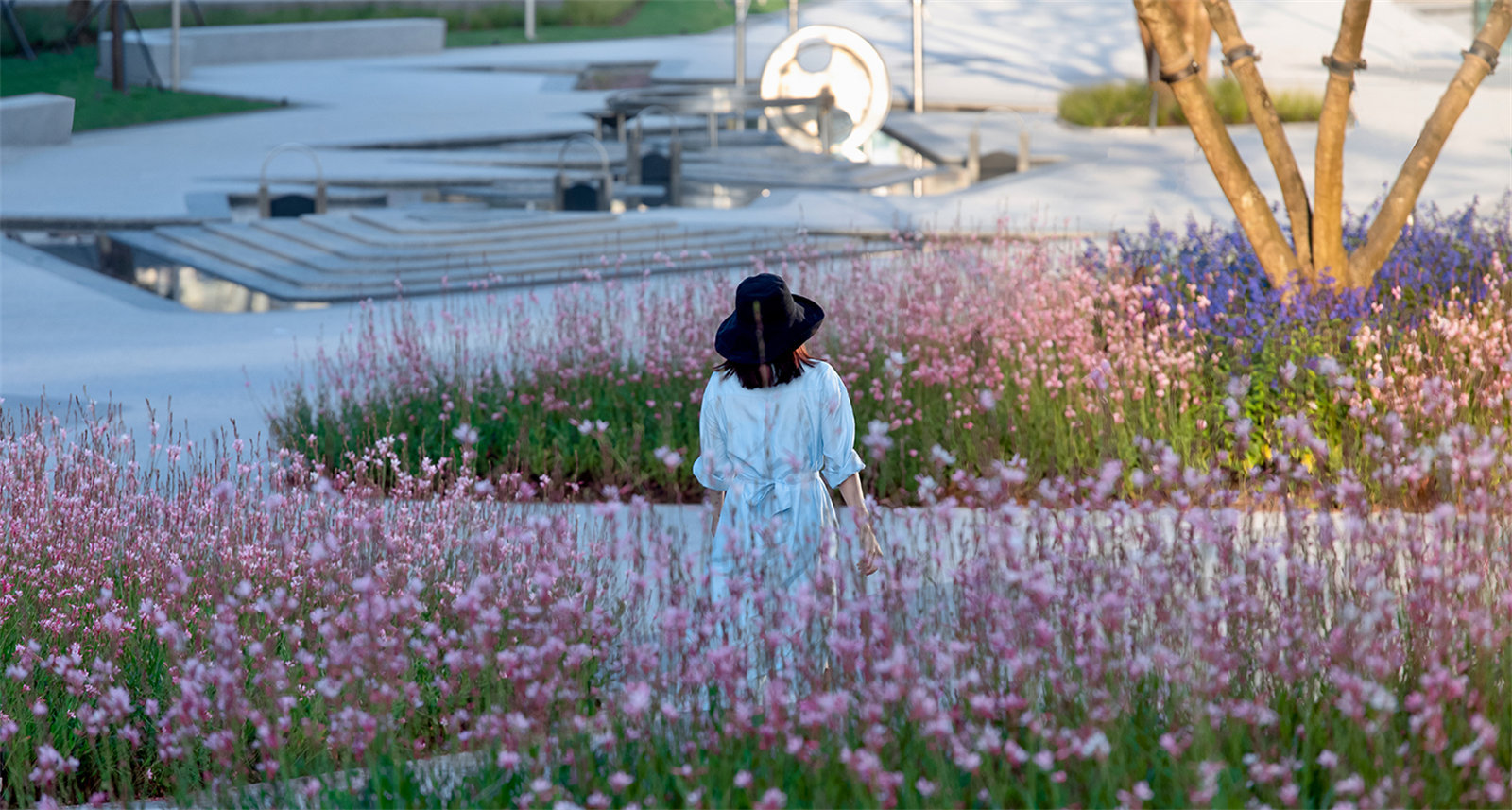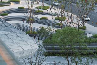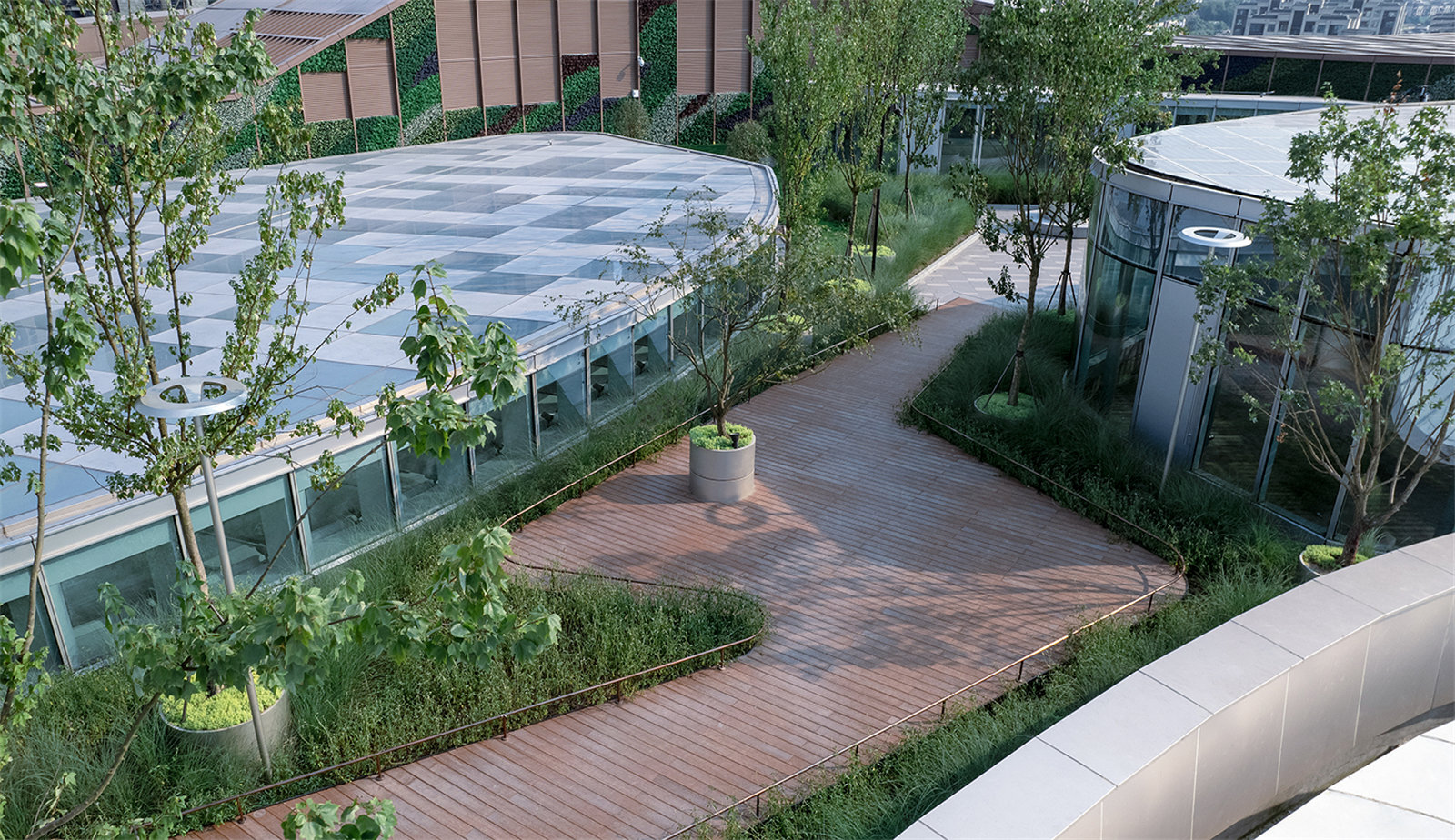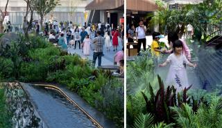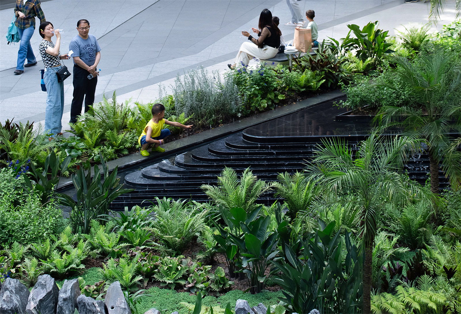 人們身處互聯(lián)網(wǎng)的迅速發(fā)展、全球氣候惡化、疫情頻發(fā)的當(dāng)代,對于新空間的訴求也不斷產(chǎn)生變化。香港置地和設(shè)計師們開始重新審視公共商業(yè)零售空間的定位和作用。光環(huán)購物公園重新定義了公共商業(yè)空間模式,即是將自然、社會文化帶入商業(yè)空間使其轉(zhuǎn)變?yōu)榫哂猩缃粚傩?、自然屬性的綜合空間,為在城市中生活的人們創(chuàng)造更多美好瞬間和體驗,并在實際景觀設(shè)計策略上緩解城市生態(tài)環(huán)境的壓力。