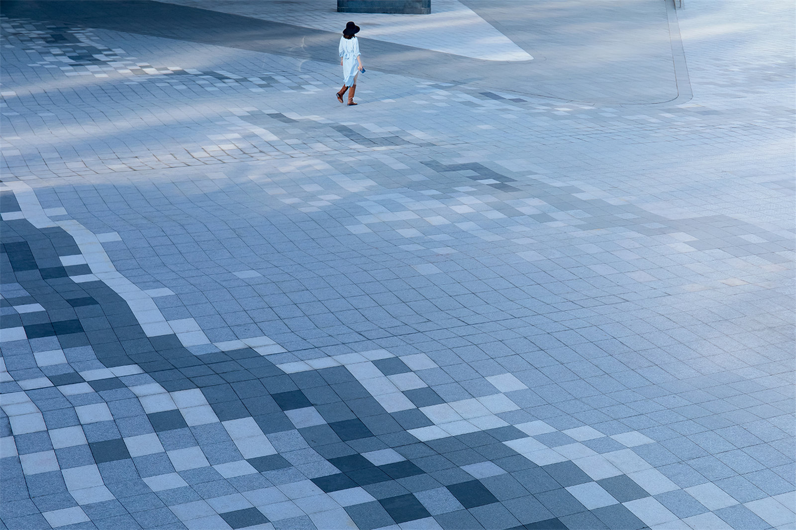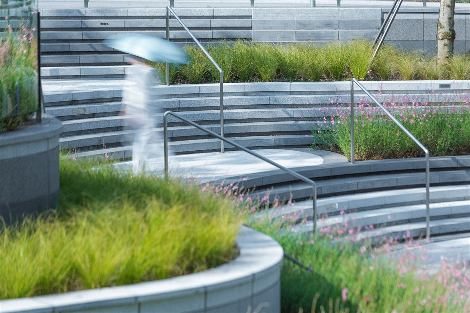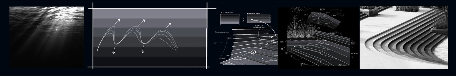 The impression of light fading into the depths of the ocean is represented in the tonal transitions of terraces, steps and level changes, which also allow the urban park to mitigate the significant site levels. This also creates a series of usable and accessible community spaces, including areas for art, exhibitions, community gathering, shaded relaxation and active water play.
