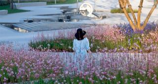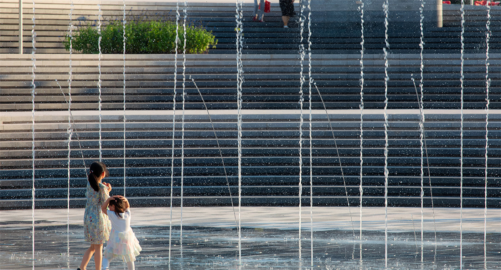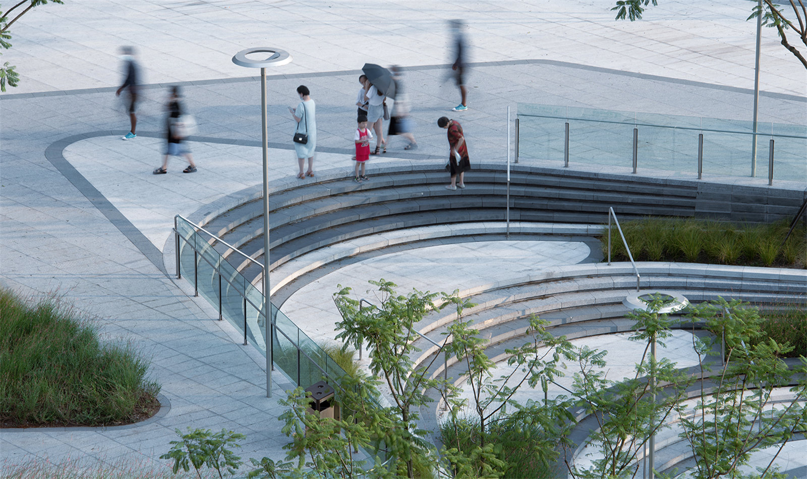 From the urban park visitors travel to the community plaza, an event and gathering space framed on either side by elevated lookouts and sculptural art works and enclosed by terrace seating. The interactive sculptural artwork mimics the form of a seashell, allowing visitors to explore as they traverse a cave-like space to reach the lower level and take in the delightful view of a 20-metre-high dancing fountain. As a major gathering community events space, the urban arrival park serve for having local community of over 50,000 residents a place meet and celebrate holidays and festive events. The northern edge of the plaza contains a lookout space which floats out of the terrace, allowing people to explore the planting which acts as a refuge in the shade of the trees.