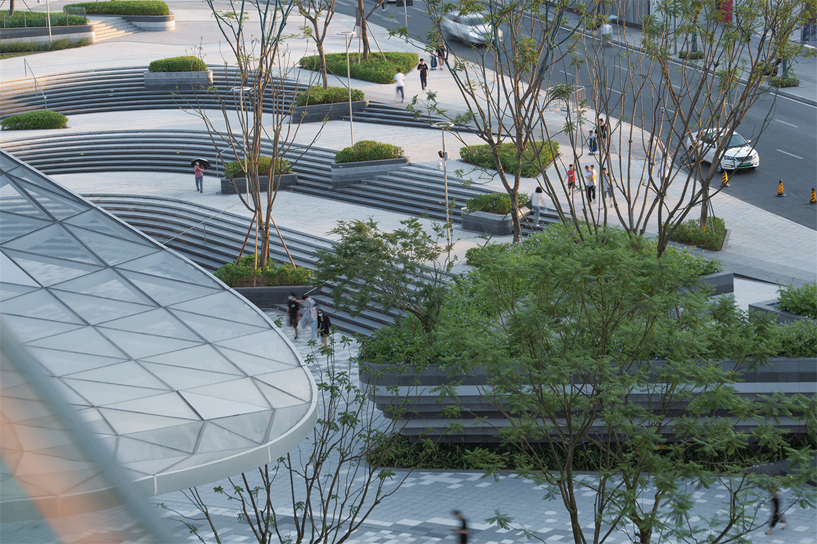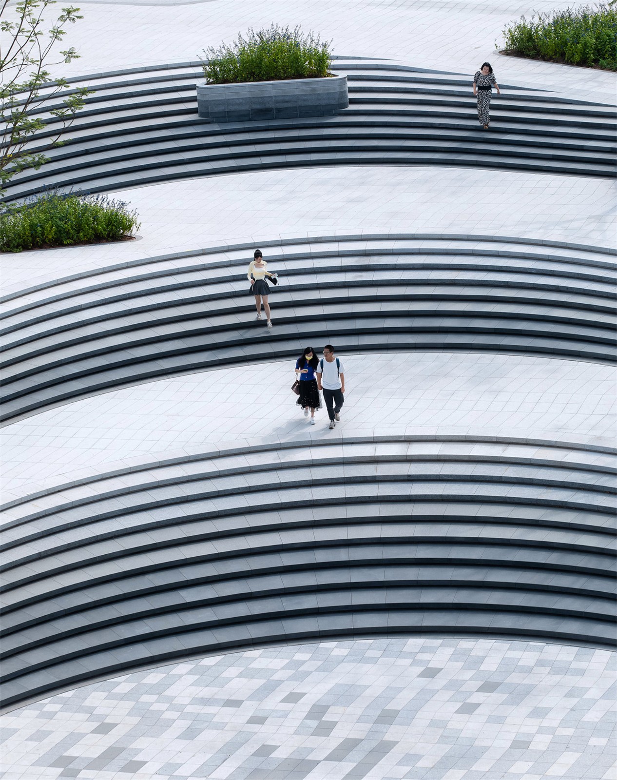 前廣場臺階模擬海洋生態(tài)地形的有機曲線,臺階和鋪地選擇了天然的石材,顏色由潛至深隨之發(fā)生變化,模擬海底的光影變化,仿佛引導(dǎo)著人們在一步步的探索下潛到“海洋”深處。鋪裝的設(shè)計方式則采用了矩形與平行四邊形穿插搭配的方式,遠遠看去創(chuàng)造出一種海水折射的3D錯視效果。這一系列尺度友好的空間組合和充滿想象力的多維度空間敘事將城市中的人們吸引至此。大人們帶著孩子們在這里玩耍和休憩。空間變?yōu)槿伺c他人、與空間、與自然互動的場所。