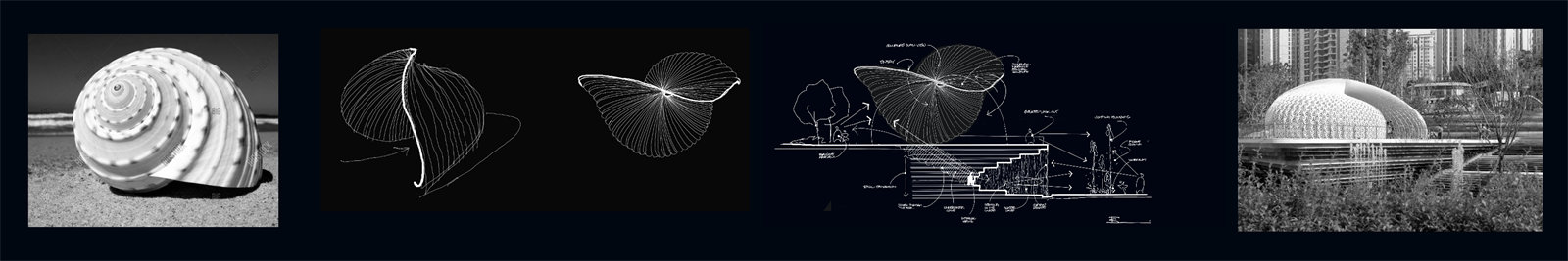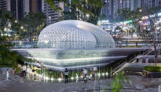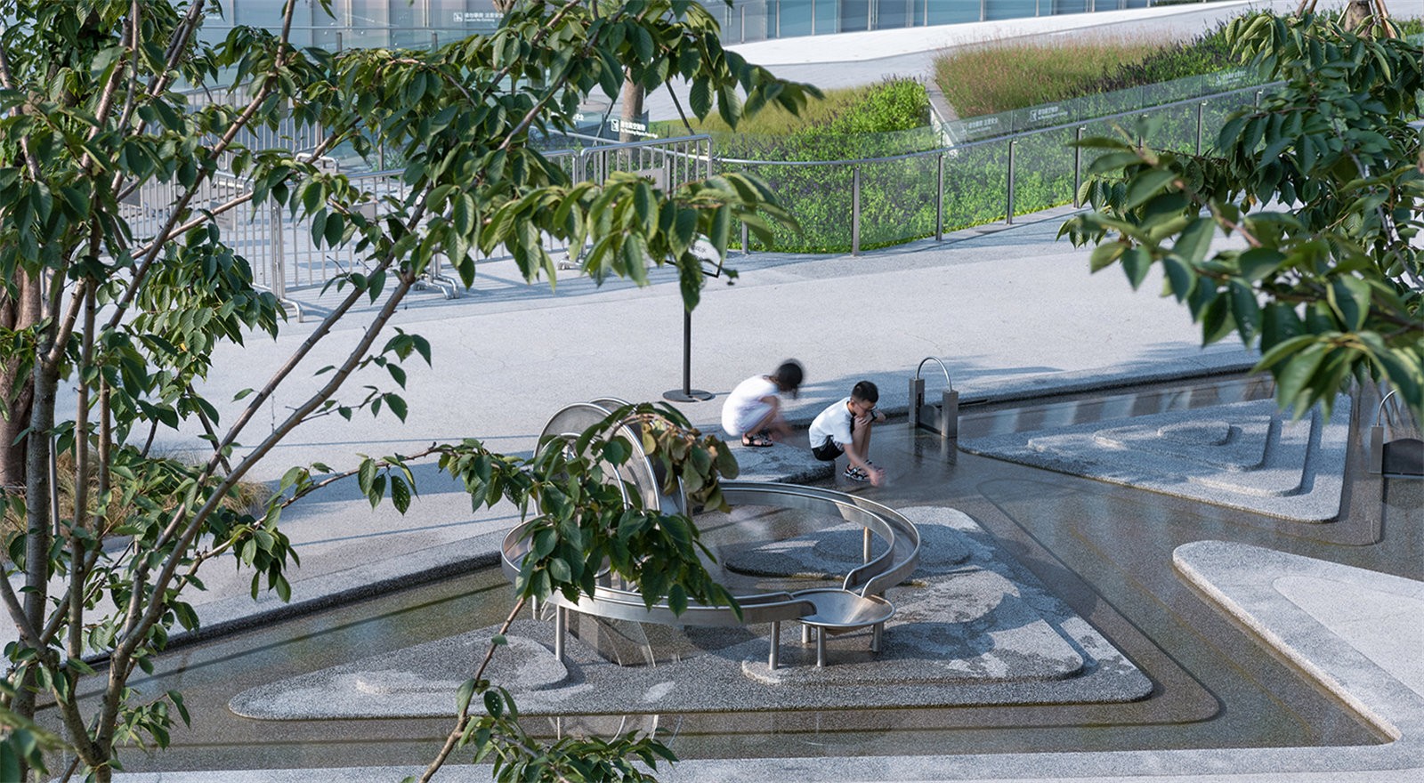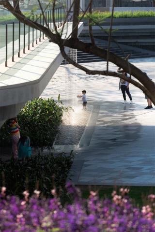 穿越層疊神秘的廣場入口部分,繼續(xù)向前探索,來到廣場的“社交空間”,這是一個利用復(fù)雜地形高差打造的多層次社交空間,包含了中央景觀眺望平臺貝殼狀互動雕塑多樣化種植區(qū)、兒童玩水區(qū)、互動裝置設(shè)計、高達20米的躍動噴泉等。這個場所作為需要承載超過5萬人次的區(qū)域商業(yè)公共空間,滿足日常休閑、聚會、節(jié)慶活動的功能,位于中心部分的是高于場地的景觀平臺以及上面的貝殼狀雕塑。設(shè)計團隊將場地復(fù)雜的地形轉(zhuǎn)變?yōu)樵O(shè)計優(yōu)勢,通過景觀平臺和貝殼雕塑完美的串聯(lián)了不同地勢平面,模擬出海洋多層次空間。人們從貝殼入口進入探索,穿梭在不同的地形層次中。景觀平臺四周還設(shè)置了水簾,結(jié)合植物形成趣味空間,提供給孩子們在這里停留玩耍的機會,廣場上的噴泉則在炎熱的夏季也起到了降溫的效果,從視覺、觸覺、聽覺等多樣化感官上喚起了人們在海底探索的感覺。