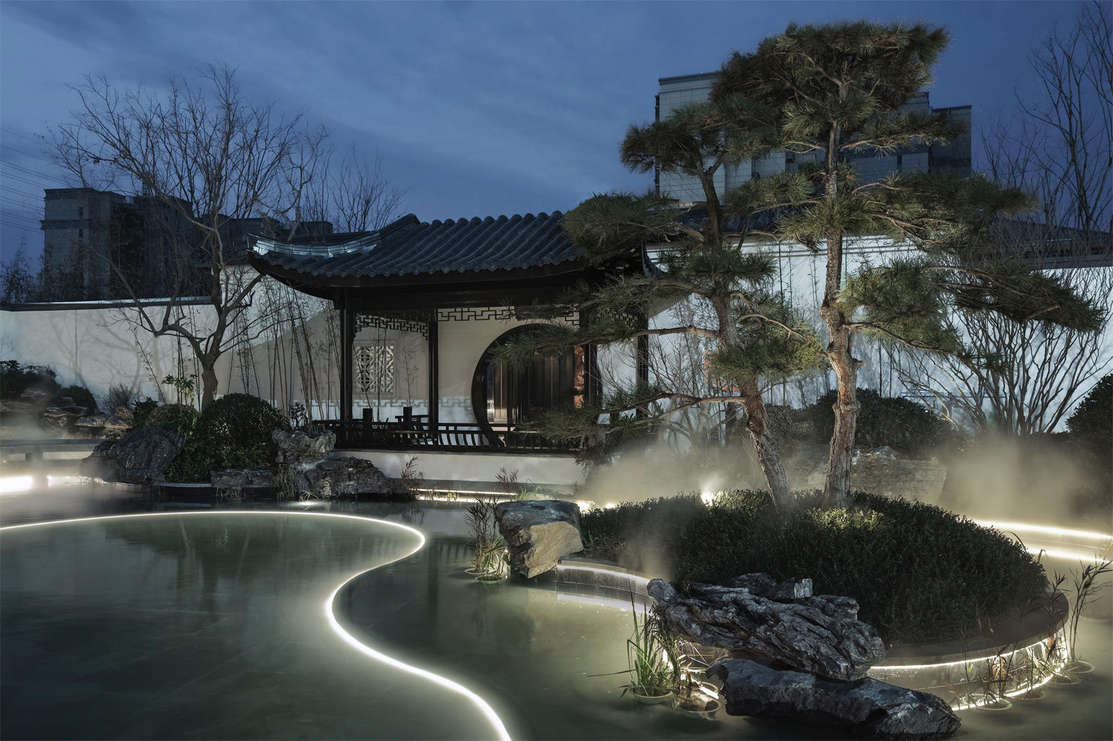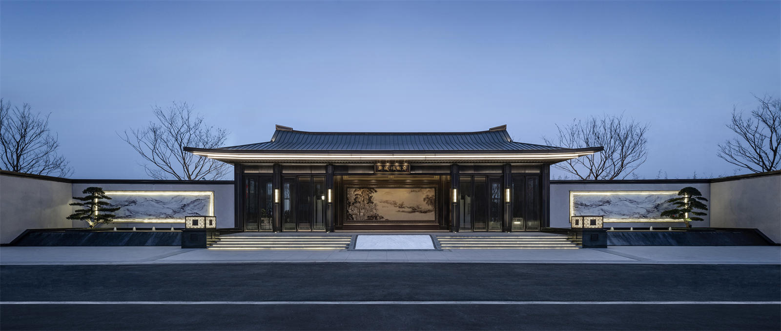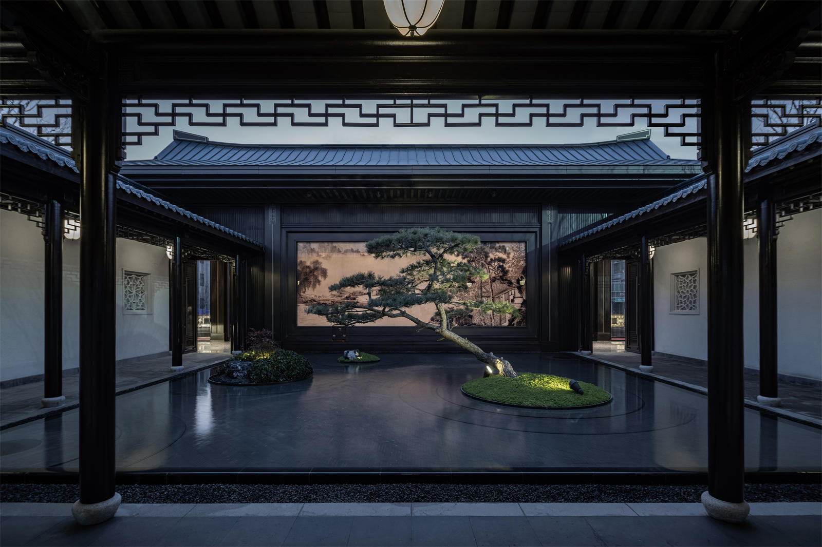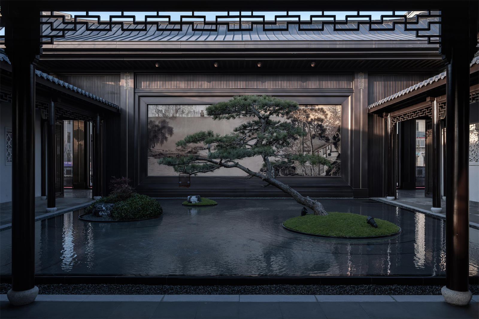 門殿匠心規(guī)制,取法皇家王府格局;禮制式門庭,權重威嚴,中軸對稱布局,東方美學氣韻;兩側藝術水景景墻鐫刻山川松柏,紋路靈動;造景水池,微波蕩漾,流水汩汩,僅方畝之地,亦有山水蓄氣;空間組合,層層進階;文脈之韻,瀛洲之史;營造軸進有序的景觀層次,周游天地,天人合一。