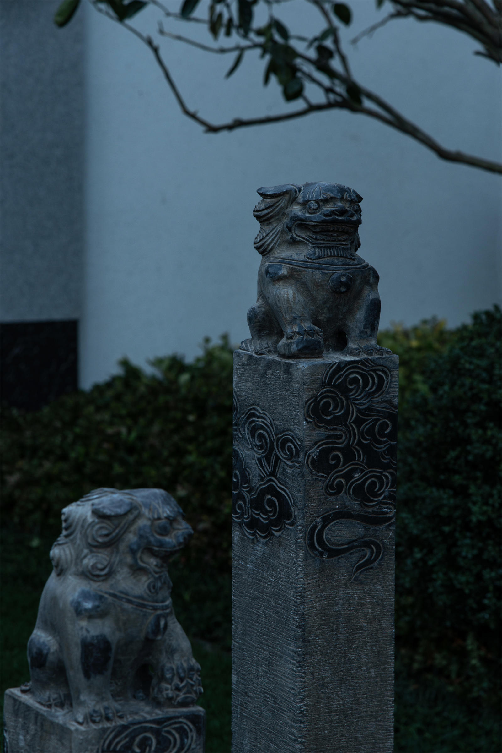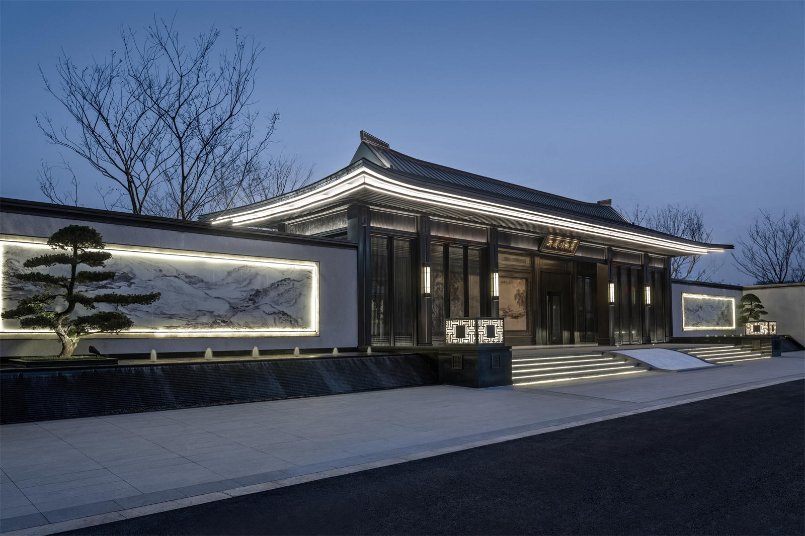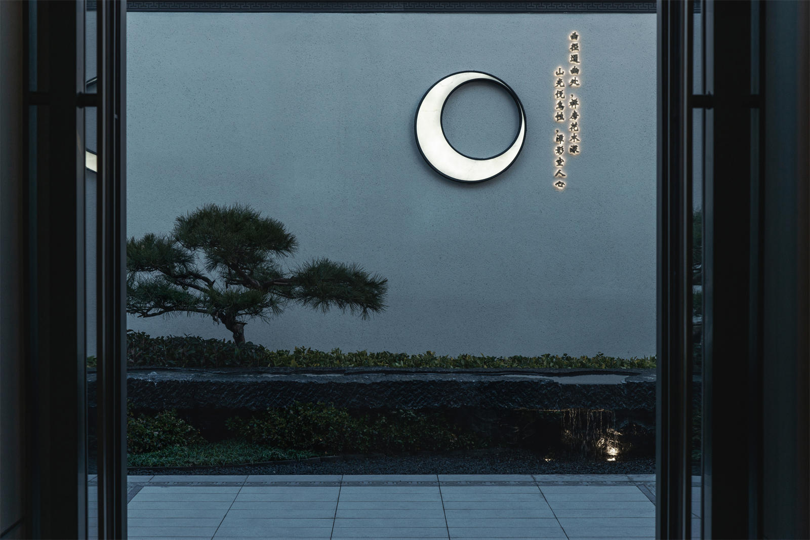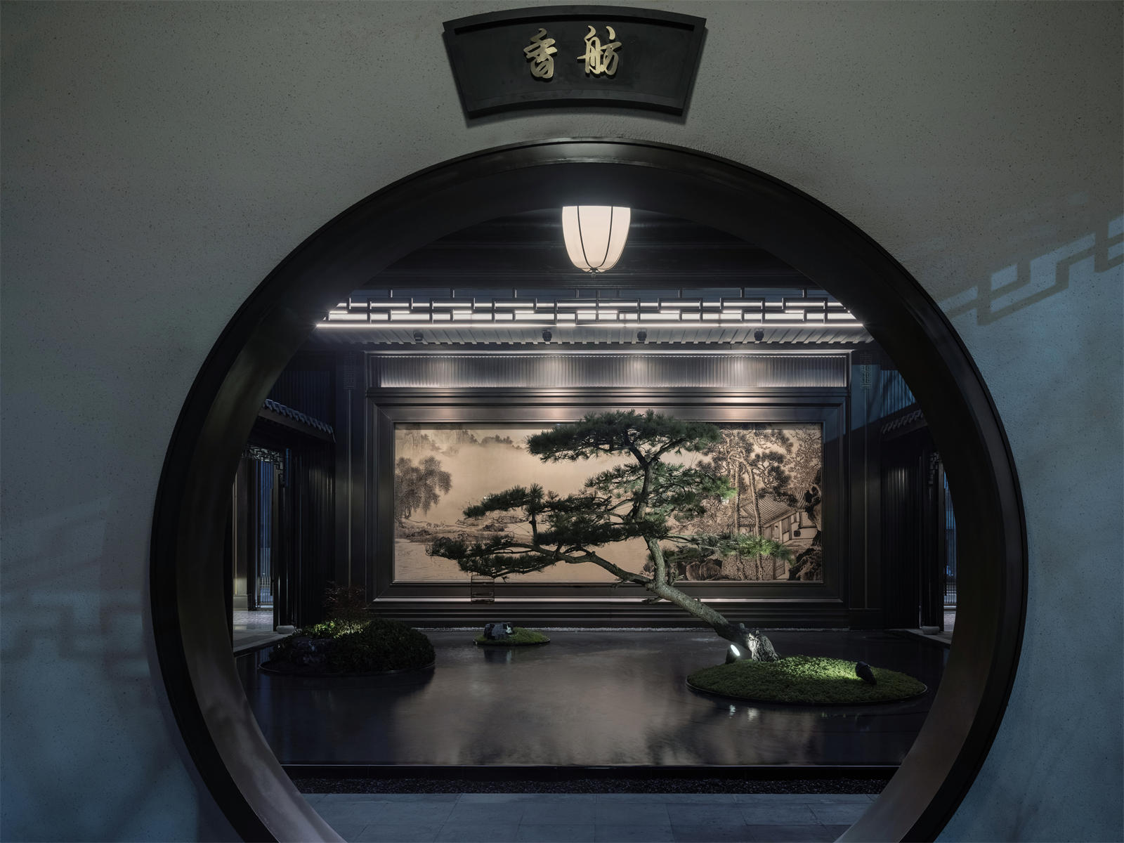 門殿匠心規(guī)制,取法皇家王府格局;禮制式門庭,權重威嚴,中軸對稱布局,東方美學氣韻;兩側藝術水景景墻鐫刻山川松柏,紋路靈動;造景水池,微波蕩漾,流水汩汩,僅方畝之地,亦有山水蓄氣;空間組合,層層進階;文脈之韻,瀛洲之史;營造軸進有序的景觀層次,周游天地,天人合一。