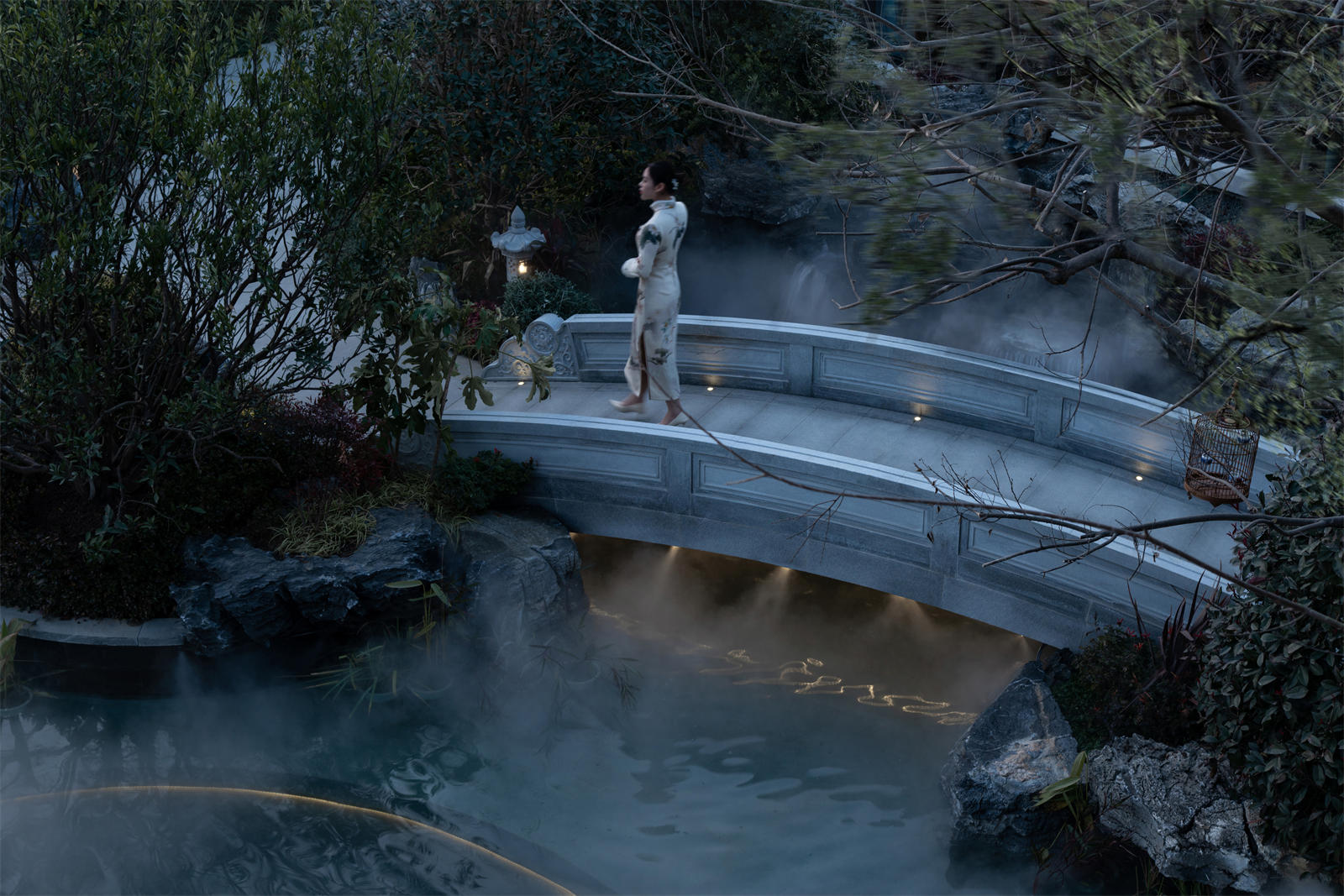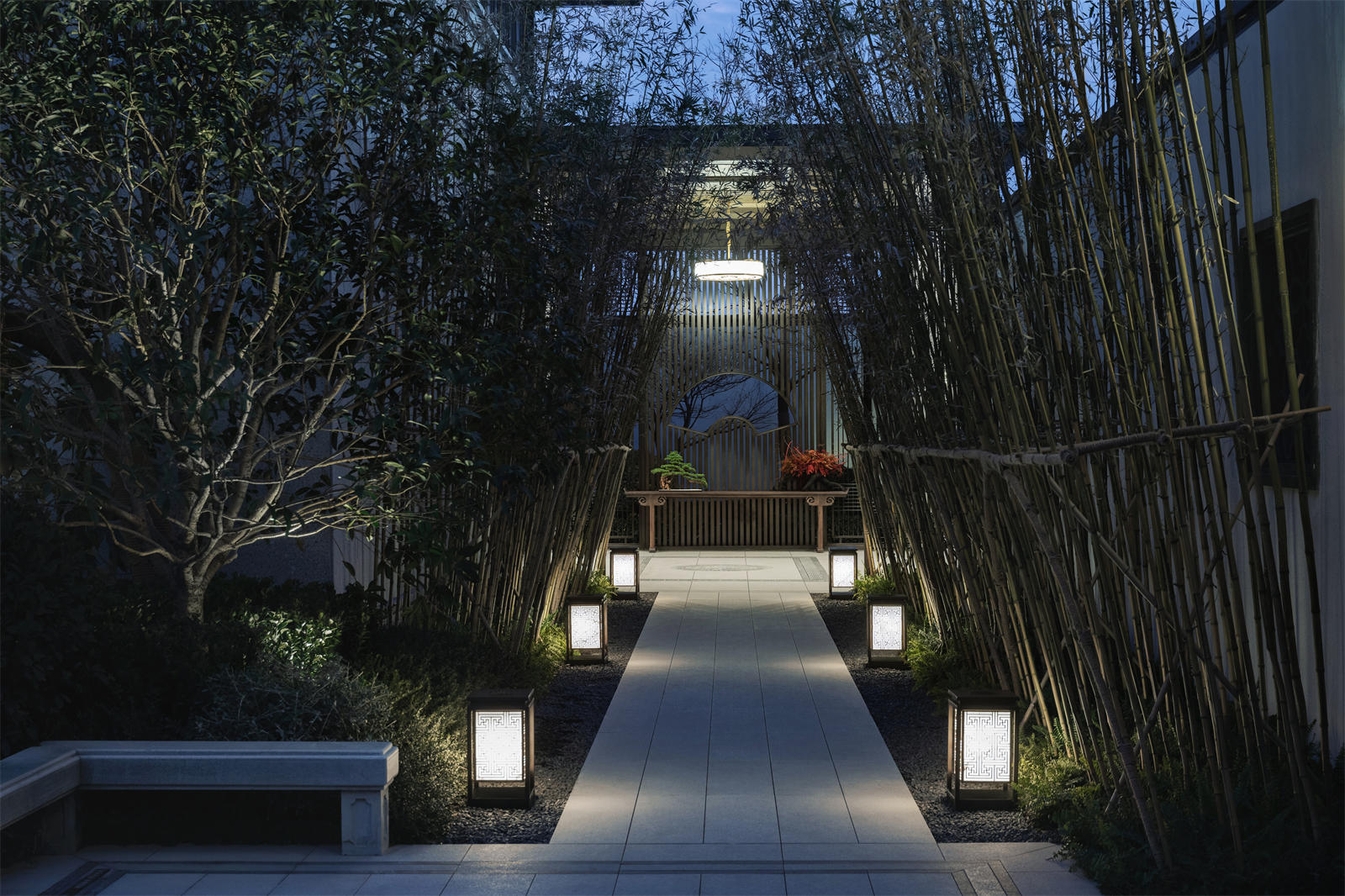行走間邂逅一片清幽竹林,汲取東方美學深韻,借水、竹、石、花交融的幽深意境,打造詩情畫意等禪意小景,構思深邃,宛自天成。