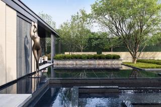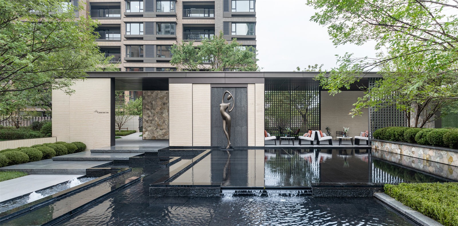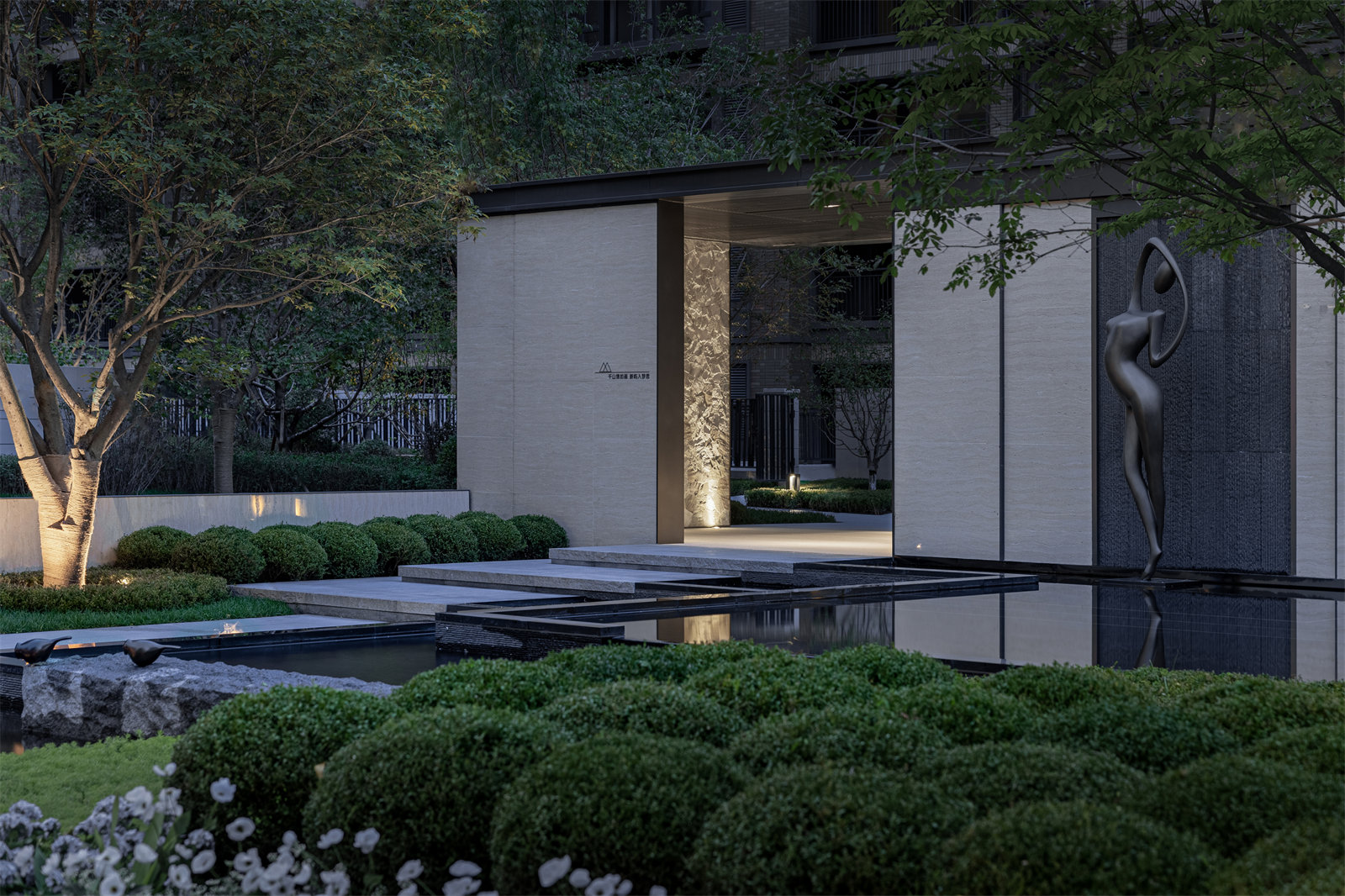 景觀與藝術(shù)相結(jié)合,主景雕塑與水中倒影提升了環(huán)境的美學(xué)高度。以純粹的立面為背景,點(diǎn)綴精致的雕塑和線條,實(shí)現(xiàn)藝術(shù)生活的高級(jí)感。