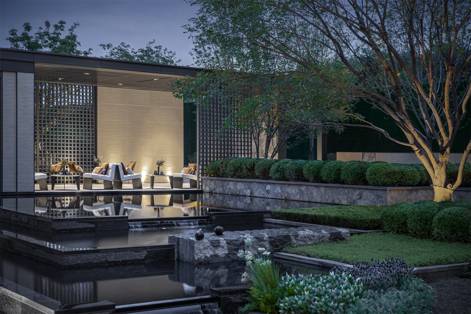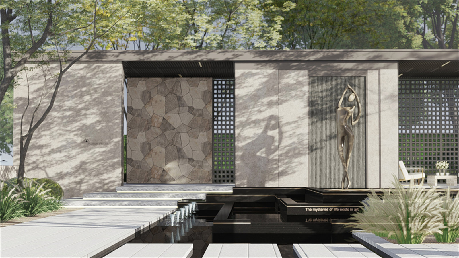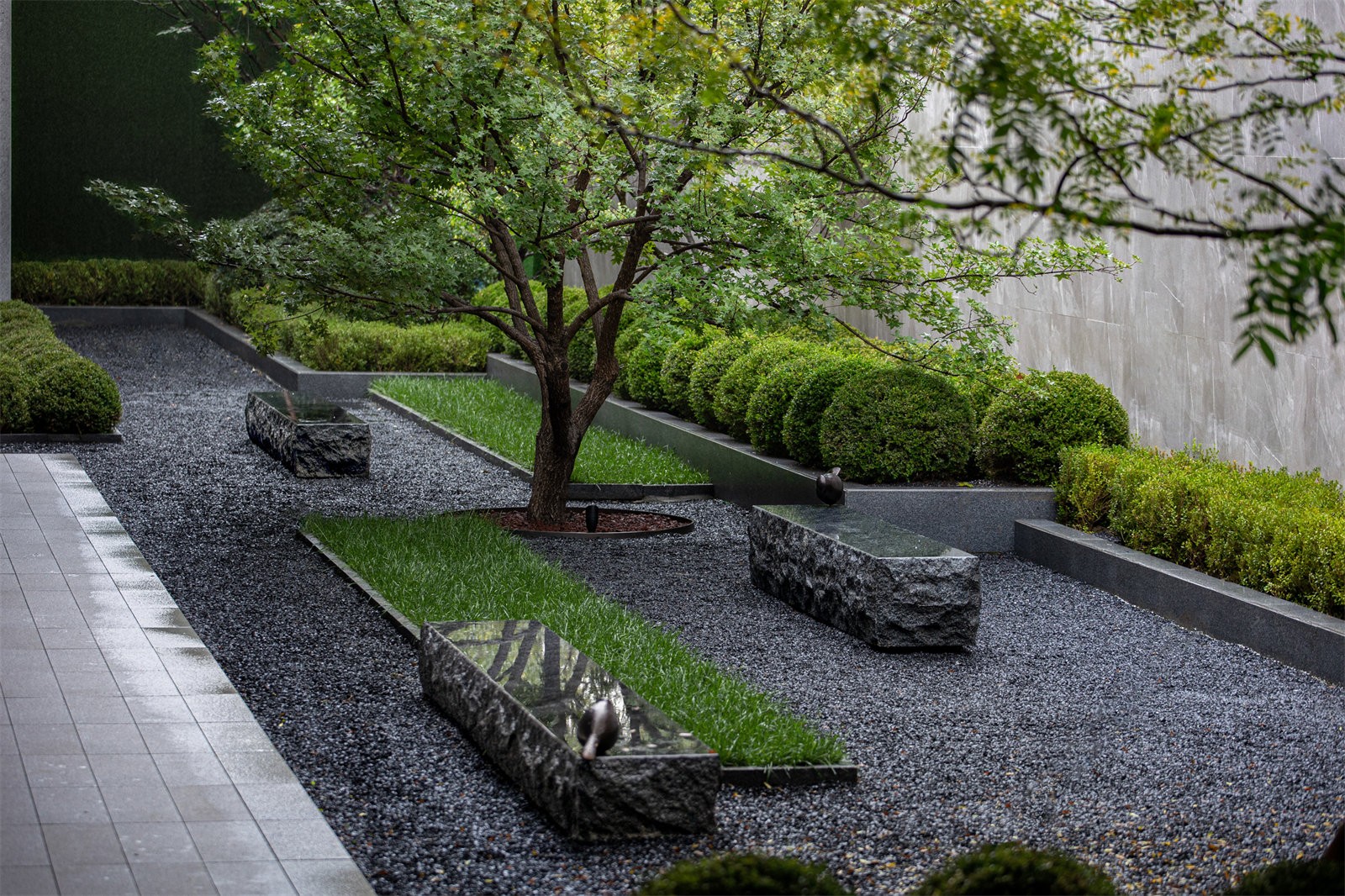 注重自然元素的表達(dá),將材質(zhì)和光影輸入場(chǎng)景中,石材的永恒感、植物的婀娜感與光線的變化感成為環(huán)境的主體要素,融合成歸心自然的景觀效果和情感體驗(yàn)。