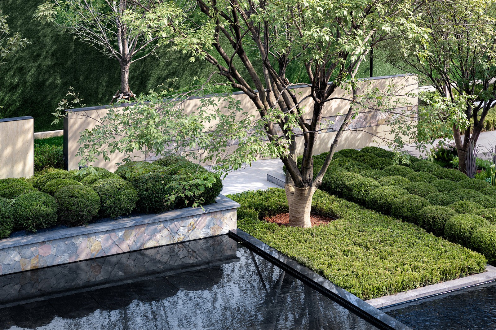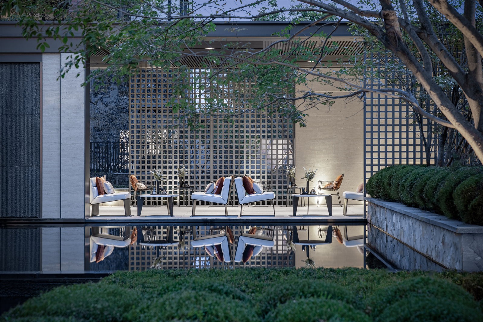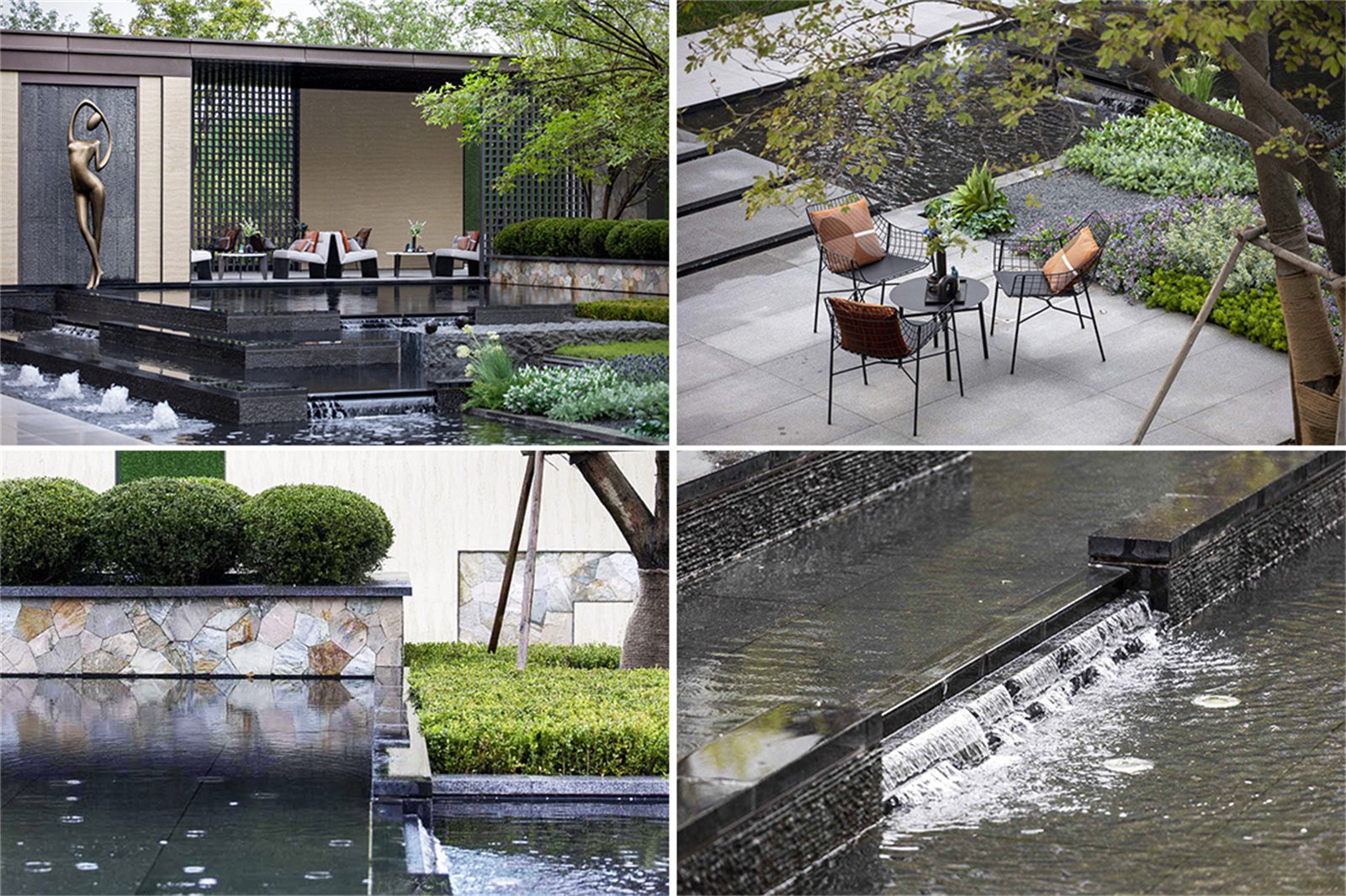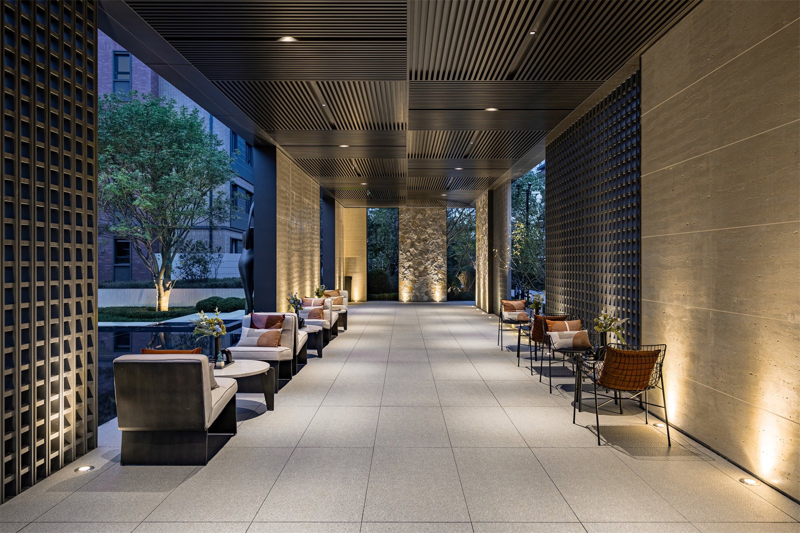 注重自然元素的表達(dá),將材質(zhì)和光影輸入場(chǎng)景中,石材的永恒感、植物的婀娜感與光線的變化感成為環(huán)境的主體要素,融合成歸心自然的景觀效果和情感體驗(yàn)。