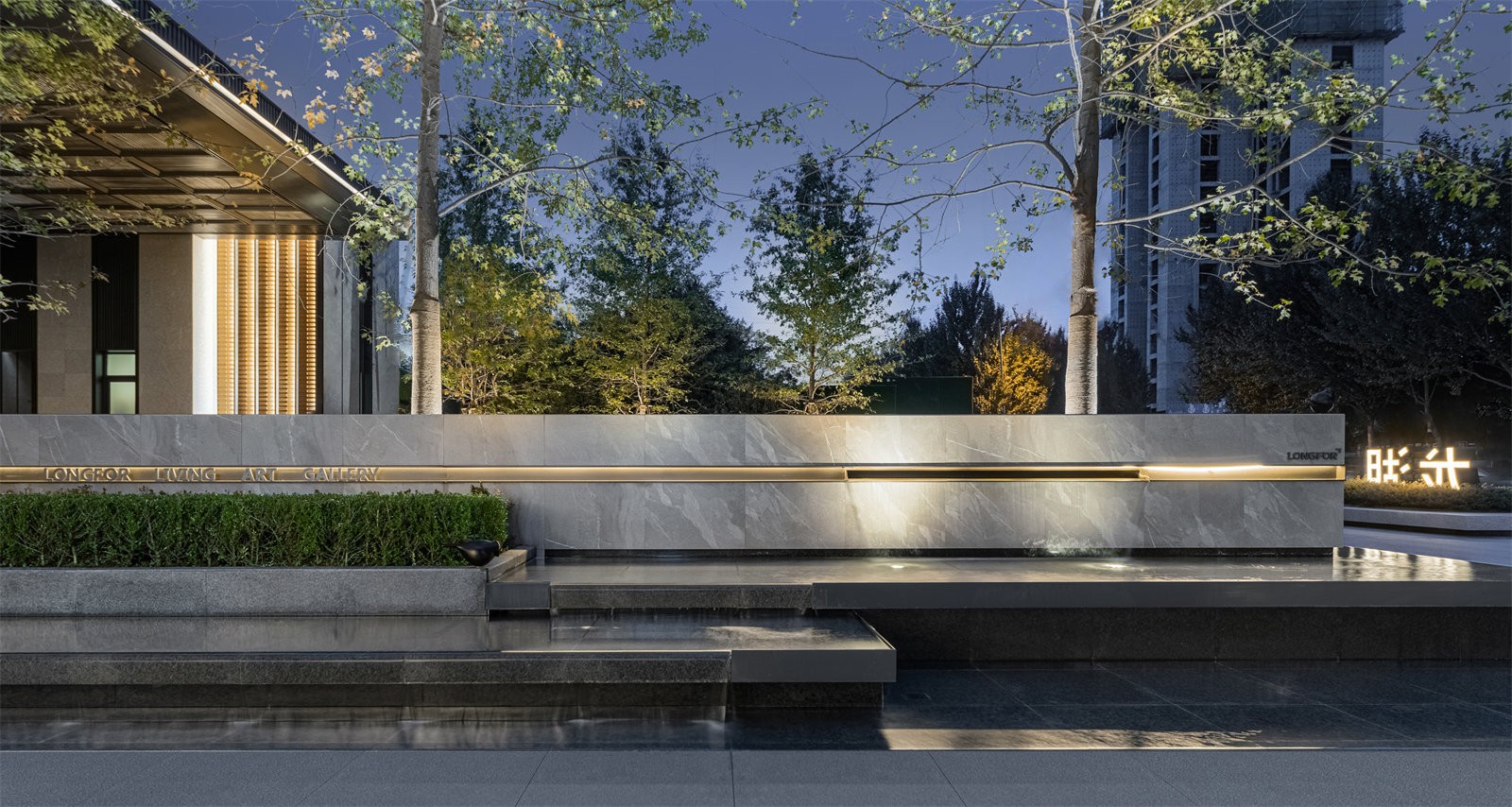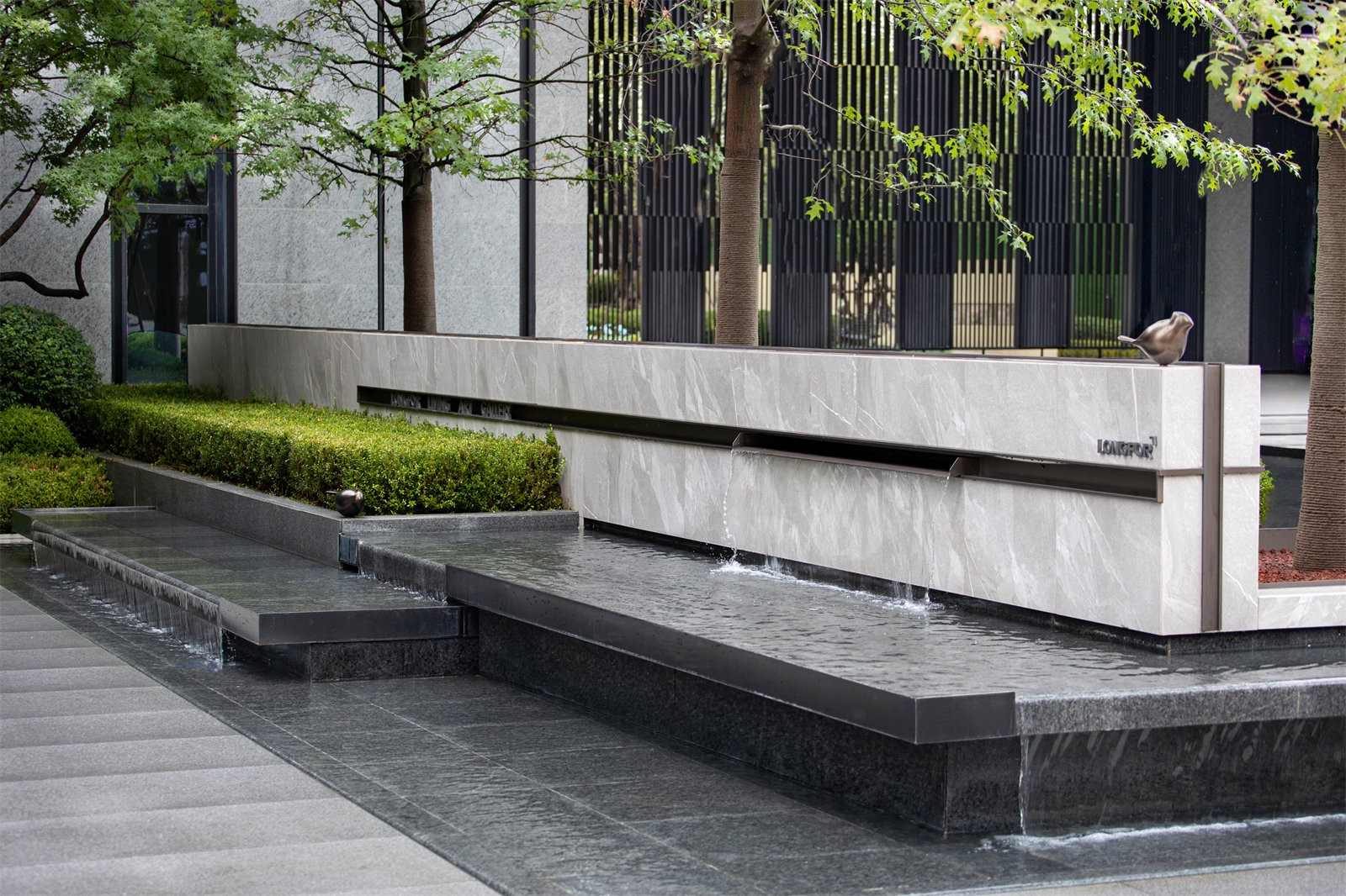 流水景墻橫向展開,中和了大門立面強(qiáng)烈的節(jié)奏感。作為售樓處出入口對(duì)景的同時(shí),兼具分隔未來(lái)商業(yè)與歸家區(qū)域的功能。水面從大門前軸線鏡面水延展過來(lái),層級(jí)而下,形成互相連通又動(dòng)靜結(jié)合的水景景觀系統(tǒng)。