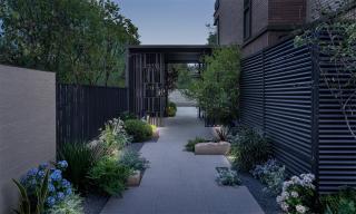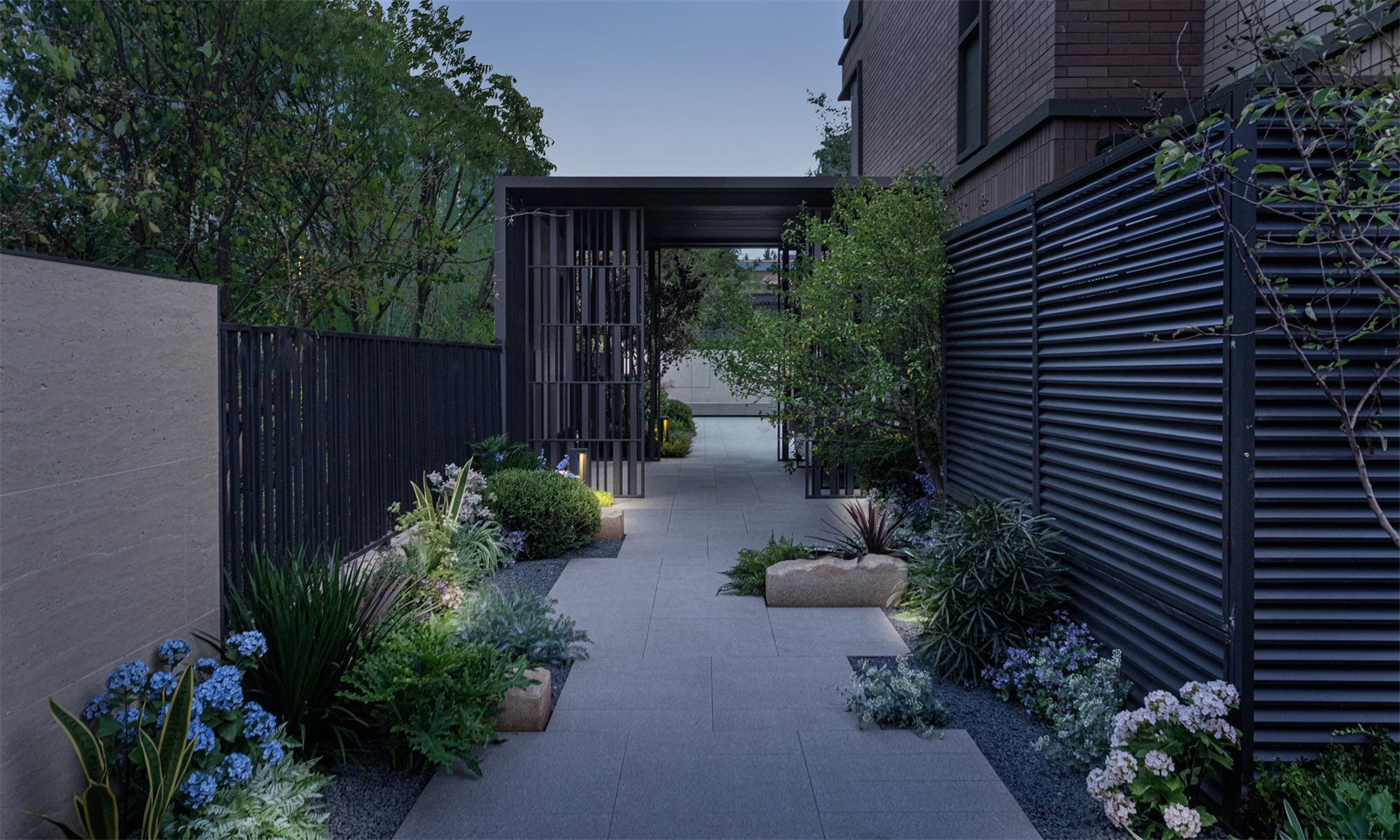 廊架格柵的設(shè)計(jì)打破地產(chǎn)景觀以往的裝飾化風(fēng)格,將常規(guī)的金屬材料進(jìn)行單元式重組,推敲空隙大小達(dá)到最佳疏密。低調(diào)的表層質(zhì)感與自然石材結(jié)合,形成不張揚(yáng)但卻充滿力量的工業(yè)氣質(zhì)。