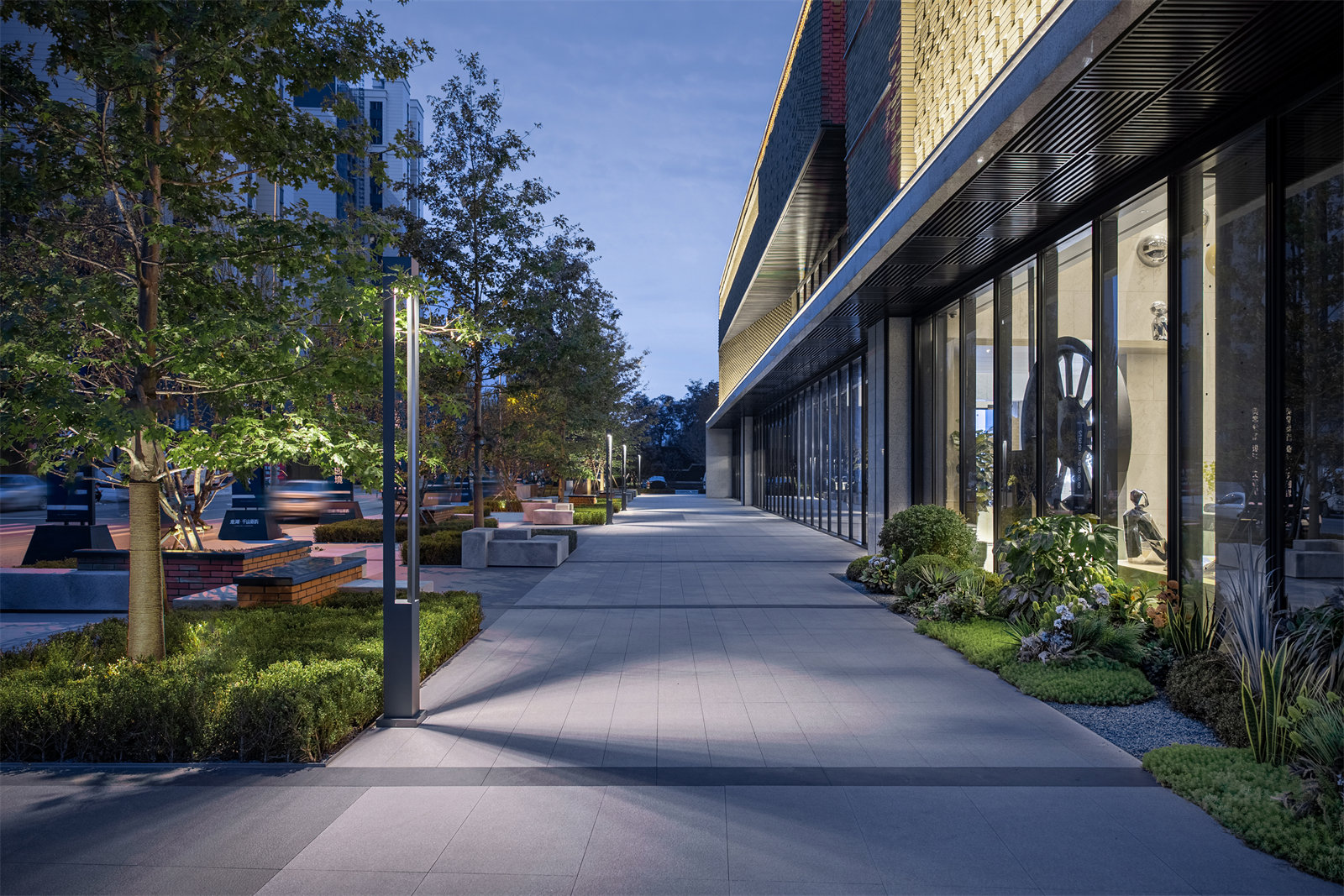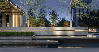社區(qū)入口兩側(cè)打造鏡面水景觀,水面與燈光交相輝映,軸線的序列感將大門的莊嚴(yán)與厚重感烘托出來(lái),形成具有儀式感的歸家氛圍。水上列植美國(guó)紅櫟,軟化了環(huán)境材料的冰冷,葉色隨著四季變化,使歸家的過程增添了對(duì)自然之美的感受。