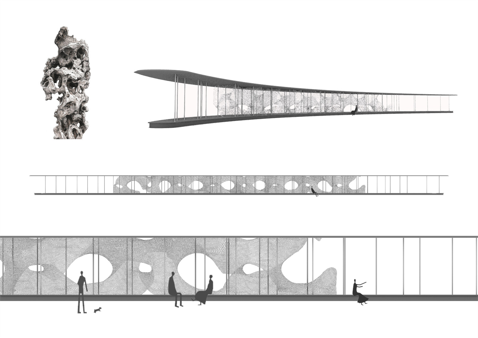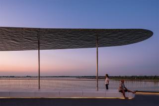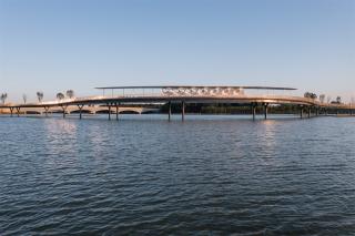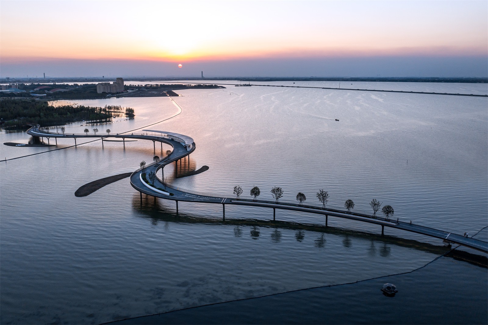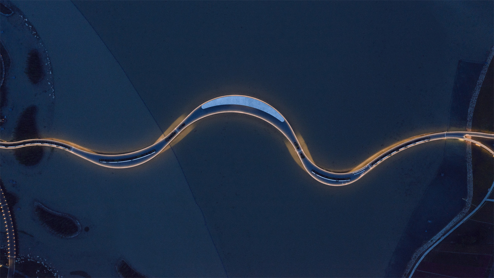 元蕩橋全長586米,整體設(shè)計以“同心結(jié)”為理念,體現(xiàn)青吳兩地同心共治的發(fā)展愿景。橋身如同一條緞帶,連同揉入湖水柔波元素的橋上欄桿,與元蕩湖上的水波交相呼應(yīng)。景亭中的太湖石小品,靈感源自當(dāng)?shù)貍鹘y(tǒng)雕塑,設(shè)計上探索了當(dāng)代數(shù)字建模及制作,創(chuàng)造了既是雕塑又是游樂場的多孔墻。