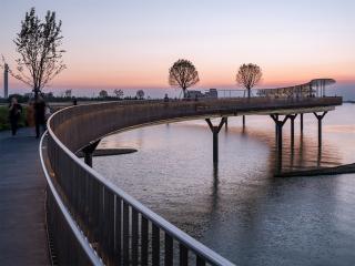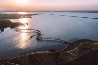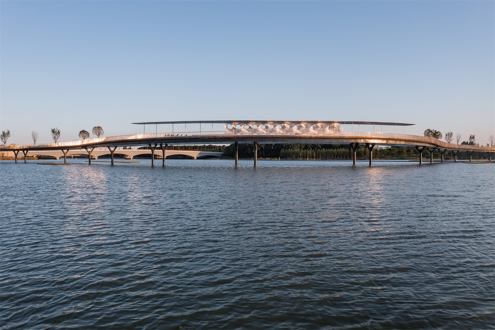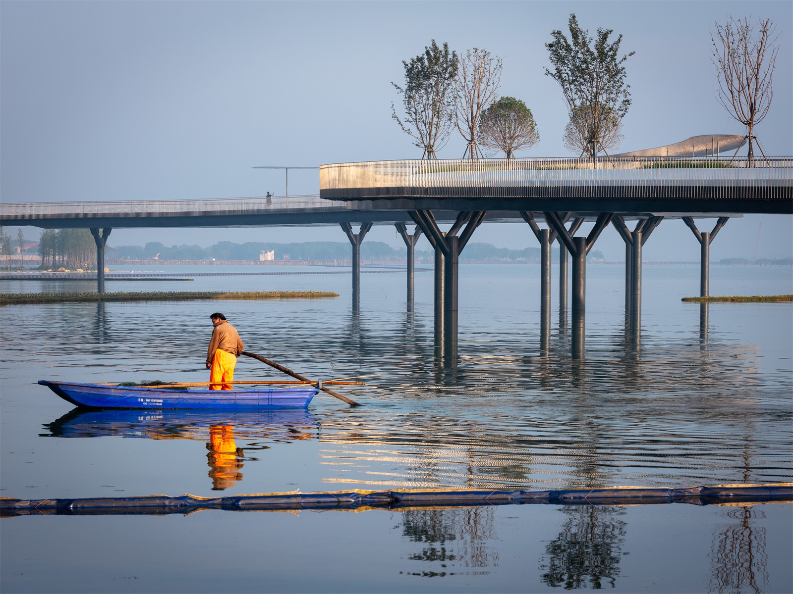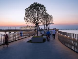 橋上橋下的綠化種植延續(xù)了兩岸生態(tài)公園的原生態(tài)種植理念,結(jié)合對本土植物及動物的思考。將樹木和灌木融入到橋中,構(gòu)建了一座連接兩岸的浮動花園。這些融入本土環(huán)境的巧妙設(shè)計,使整座橋梁成為元蕩湖上的一道別致景觀。與此同時,元蕩橋也串聯(lián)了周邊千帆歸渡、閑夢云臺、汾湖之眼等旅游資源,形成一段連續(xù)的生態(tài)之旅。