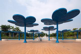 UFO區(qū)是兒童活動(dòng)場(chǎng),它的地形結(jié)構(gòu)模仿了月球、火星等行星表面地質(zhì)構(gòu)造中或突出或凹陷的“空間網(wǎng)格”,營(yíng)造出一種重力感。游樂(lè)活動(dòng)的設(shè)計(jì)基于太空與天文學(xué)的奇特事物,旨在為兒童創(chuàng)造寓教于樂(lè)的戶外活動(dòng)。它的旁邊是“國(guó)際空間站”,即親子陪護(hù)休息區(qū),家長(zhǎng)們可以邊休息邊照看孩子們。“空間站”不僅僅是普通的廊架構(gòu)筑物,屋頂太陽(yáng)能電池板的應(yīng)用賦予其新技術(shù)與新材料的融合創(chuàng)新。