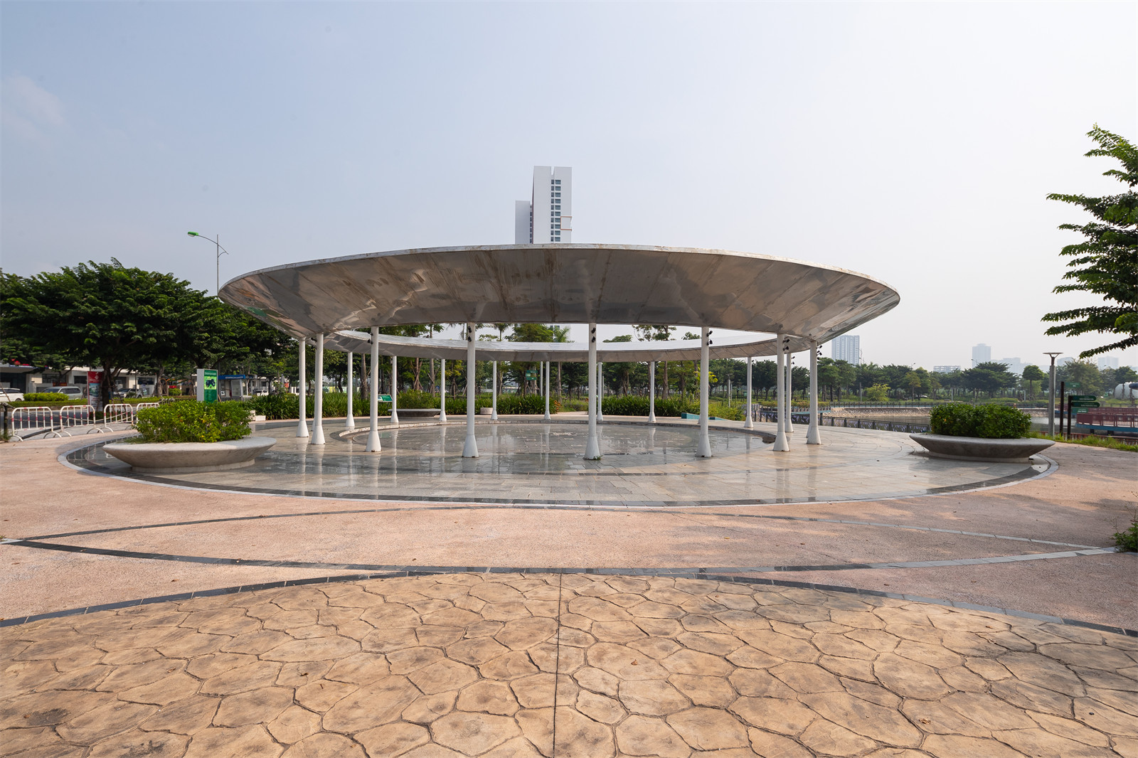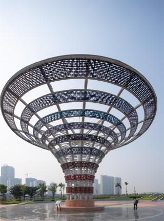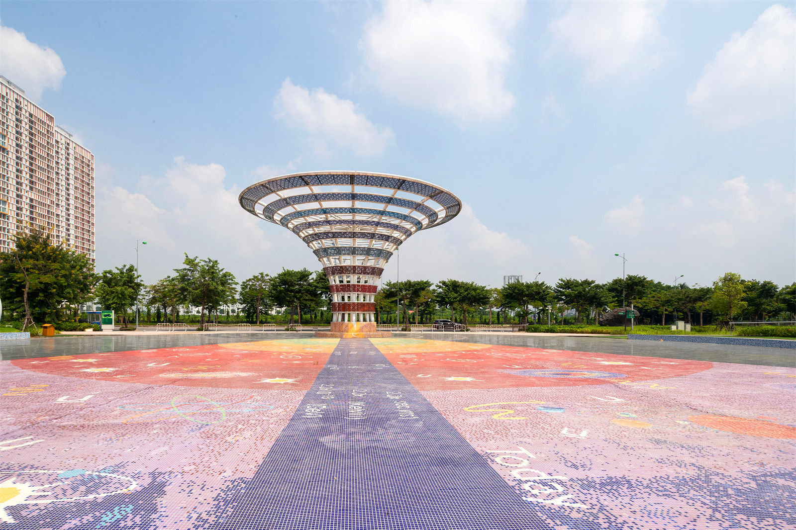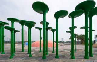 游覽線路的起點(diǎn)始于宇宙大爆炸廣場(chǎng)。受到宇宙誕生之源大爆炸理論的啟發(fā),廣場(chǎng)被設(shè)計(jì)為圓形的戶外劇場(chǎng),大爆炸塔成為廣場(chǎng)的視覺(jué)焦點(diǎn)。塔的基座很小,隨著高度上升,幾何造型逐漸膨大,詮釋了宇宙大爆炸的學(xué)說(shuō):爆炸始于宇宙內(nèi)的一個(gè)微小基點(diǎn),然后不斷地?cái)U(kuò)散并無(wú)限地膨脹。這里是園區(qū)的一個(gè)主要出入口,矗立有地標(biāo)性的塔樓,廣場(chǎng)四周鋪設(shè)了本地著名的Bat Trang瓷磚,磚上刻畫(huà)了宇宙大爆炸彩繪。這座廣場(chǎng)平時(shí)用于舉辦音樂(lè)節(jié)、市集等活動(dòng)。