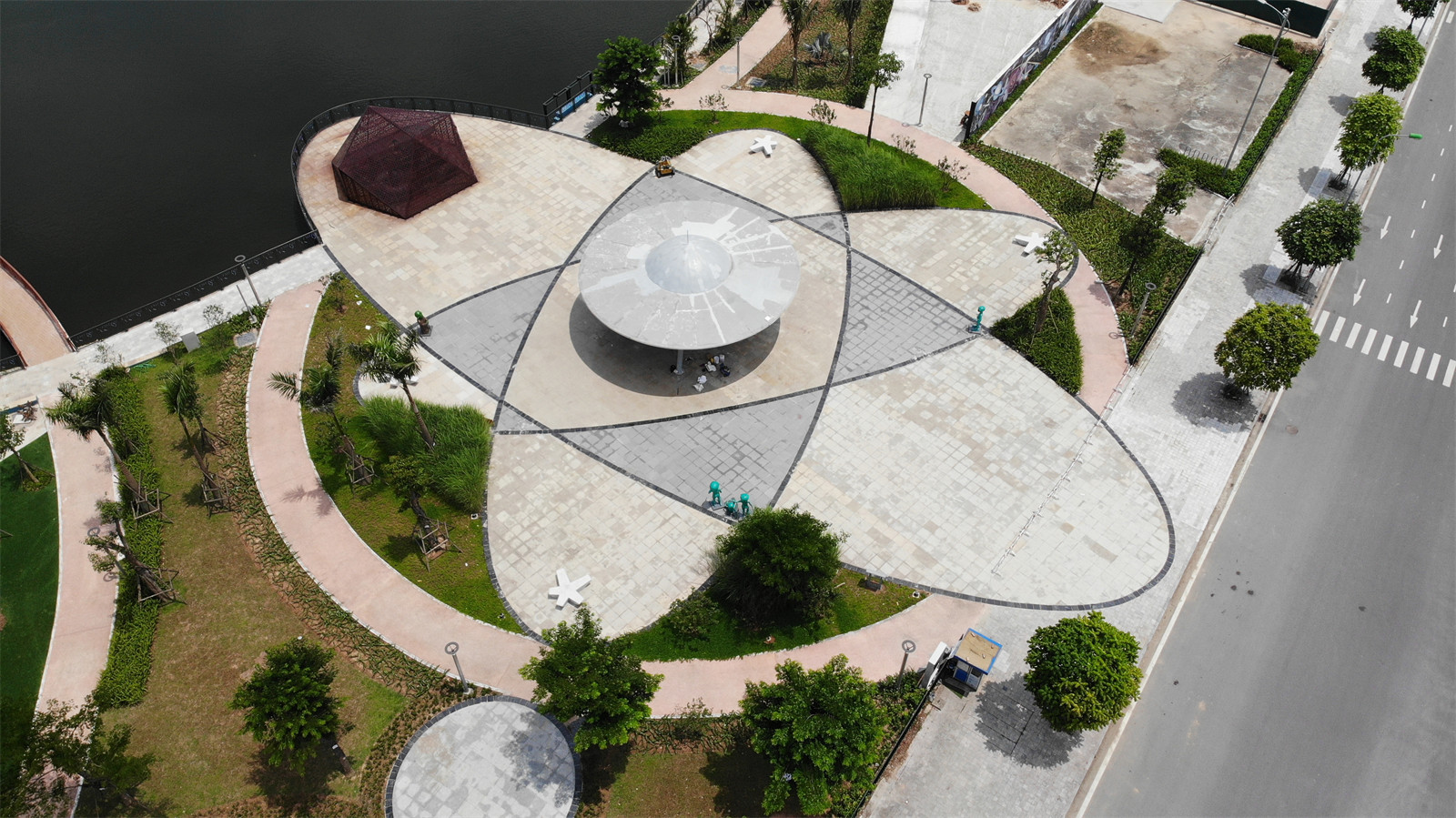 Alien Square simulates the orbital orbits of planets in the Solar System. At the center of the square is a UFO shaped UFO and sculpture system of aliens around the square. Other funny figurines of aliens are a big attraction for everyone, especially young children. Right next to it are sports fields and exercise equipment which will be expanded in phase 2 of the project.