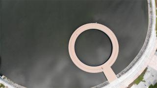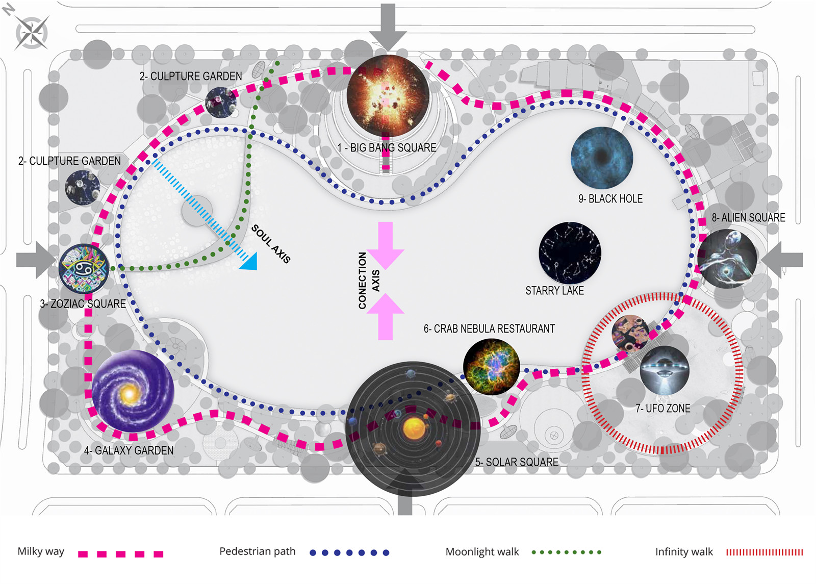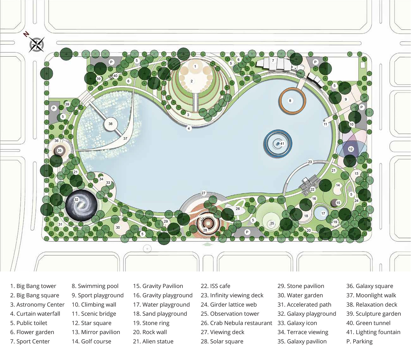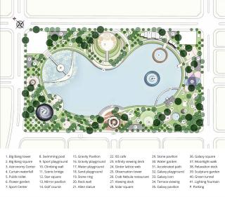在天文公園探索宇宙的旅程由兩條閉合的環(huán)形線路連接首尾,公園外環(huán)線命名為“銀河路”,靈感來(lái)自于蜿蜒在天空中的銀河。在這條路徑中布置有裝飾性節(jié)點(diǎn),象征著銀河中散落的星座。不同的燈光效果和色彩在夜間為公園營(yíng)造出戲劇性的氛圍。公園設(shè)置了四個(gè)出入口,對(duì)應(yīng)著四大廣場(chǎng),分別是宇宙大爆炸廣場(chǎng)、黃道十二宮廣場(chǎng)、太陽(yáng)系廣場(chǎng)和外星人廣場(chǎng)。內(nèi)環(huán)線是一條濱湖步行長(zhǎng)廊,曲折內(nèi)凸向湖面,游人可以通過(guò)碼頭親近水面,享受寧?kù)o平和的氛圍。