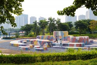 The UFO Zone is a playground for children with a topographic structure that mimics the “space grid” with protrusions, depressions like geological tectonics on the surface of planets like the Moon, Mars ... create a sense of gravity, the games are based on strange objects about space and astronomy, designed and arranged to create interesting and rewarding fun activities for children. Next to it is the ISS station where there are refreshments so parents can sit and look after their children, it is not just an ordinary pavilion structure, it is also an integration of new technology and materials with rooftop solar panels.