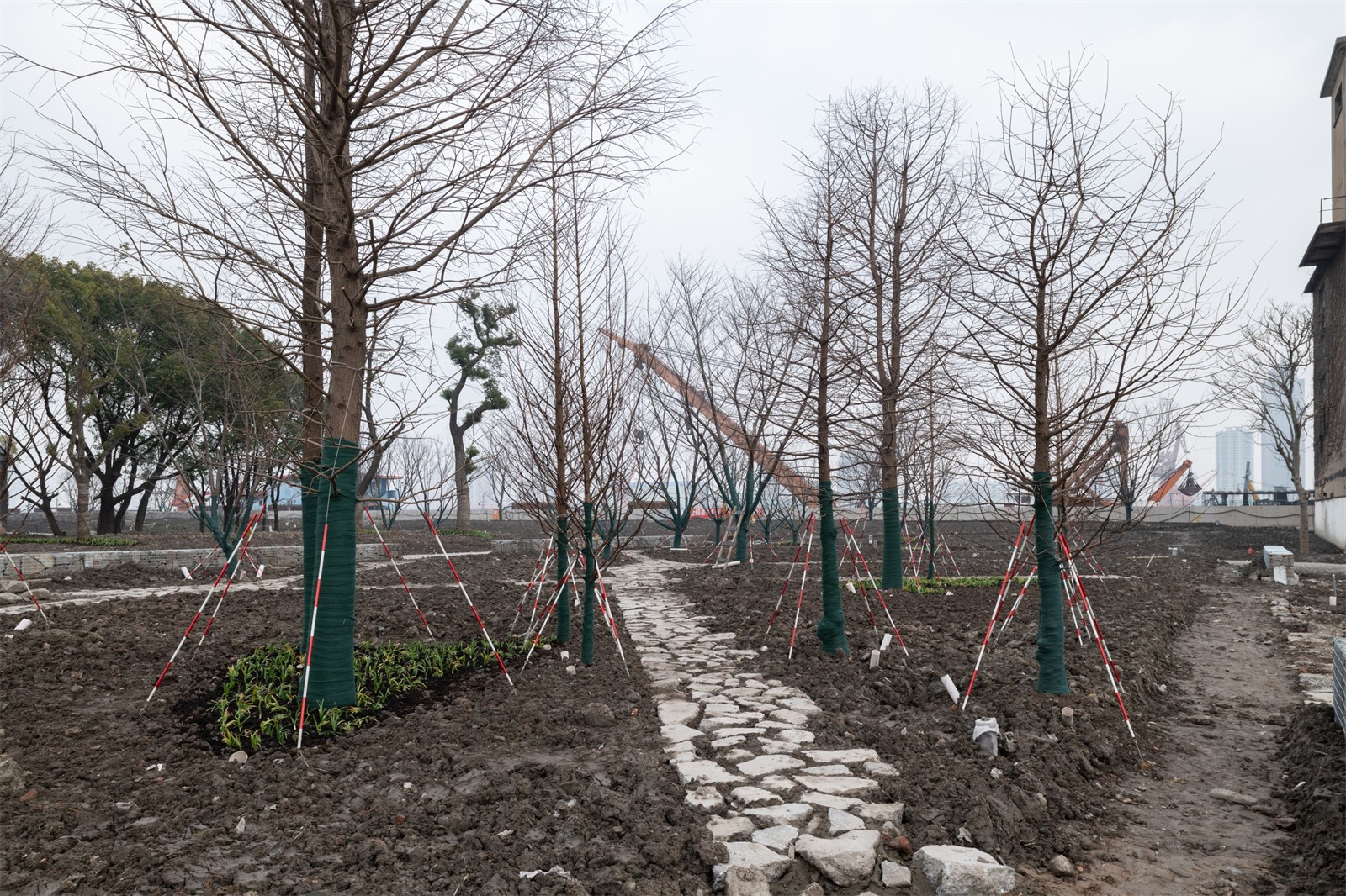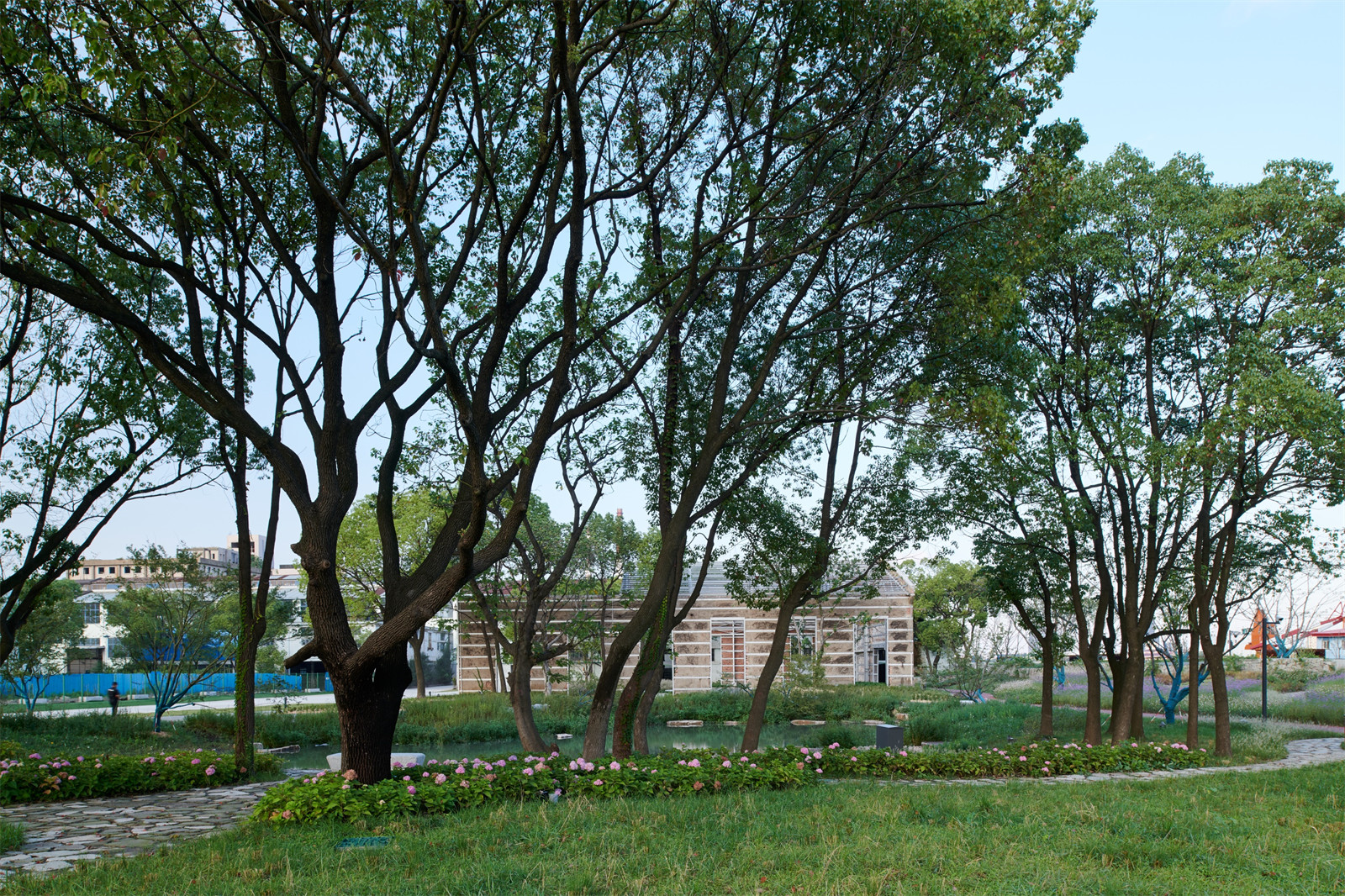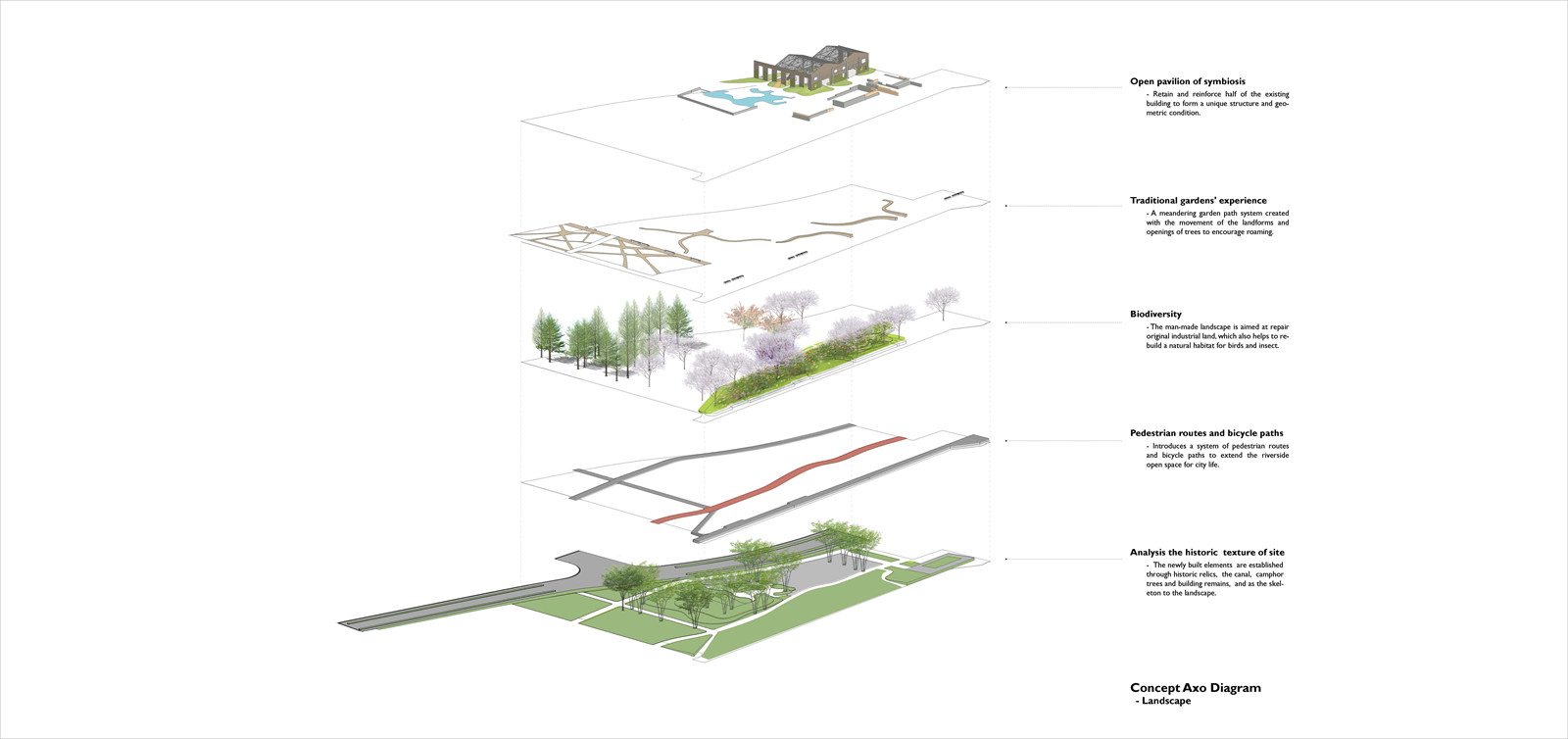 The design aims to preserve the wildness, freshness, nature and downshifting character of the site by adopting the concept of limited disturbance. The existing camphor trees are retained and one of the former warehouses is transformed into an open Pavilion of Symbiosis. The design also takes into consideration the historical texture of the site and introduces a system of pedestrian routes and bicycle paths. The newly built elements, Garden of Vestige, Meadow in Succession and Eco Pond, are established through historic relics, the canal and building remains, and as the skeleton to the landscape. As an ensemble, the site provides visitors different touches of landscape when strolling inside, and together they make the East Campus an everyday landscape which not only functions as the riverside open space for city life, but also offers fun and diversity similar to traditional gardens in the Yangtze River Delta.