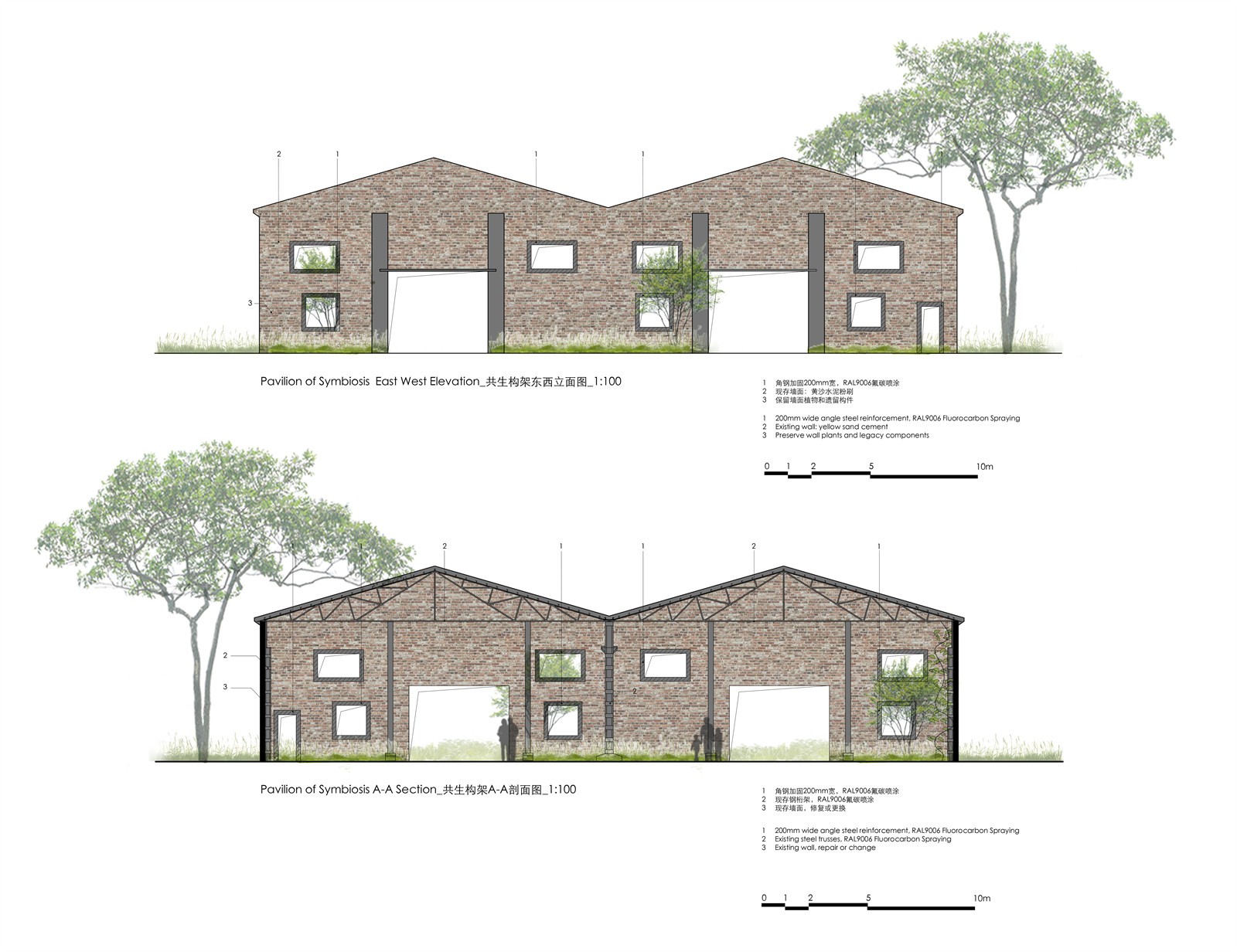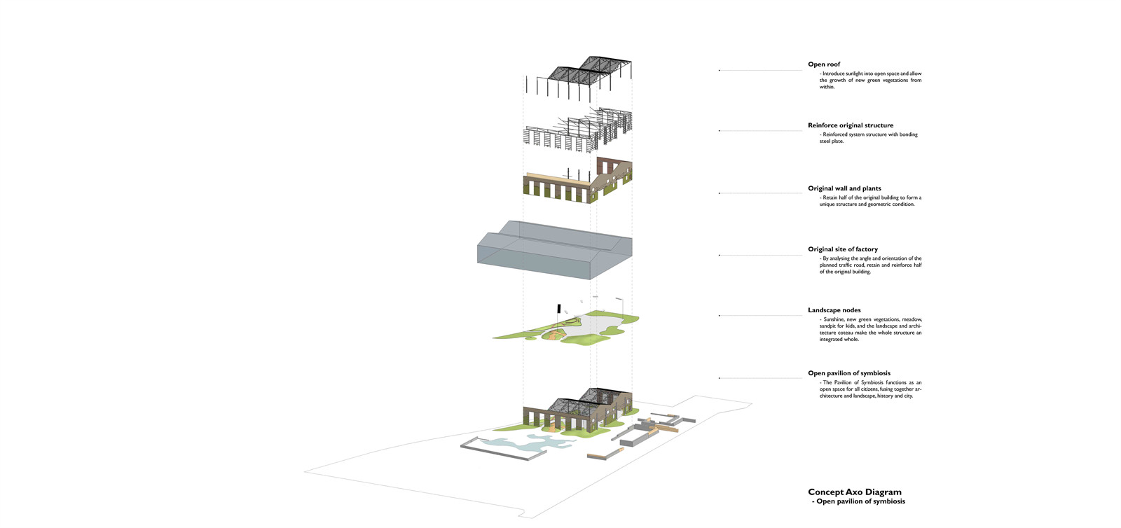 An old factory building of Shanghai Boiler Works (1953-1979) was set for demolition due to road planning. By analyzing the angle and orientation of the planned traffic road, the design proposed to retain and reinforce half of the original building to form a unique structure and geometric condition. The roof was opened up to let in sunshine and to allow the growth of new green vegetation from within. Preserved as well as newly installed doors and windows, sandpit for kids, and the landscape coteau make the whole structure an integrated whole. By preserving and restoring the original space and partial structure of the Boiler Works, the Pavilion of Symbiosis functions as an open space for all citizens, fusing together architecture and landscape, history and city.