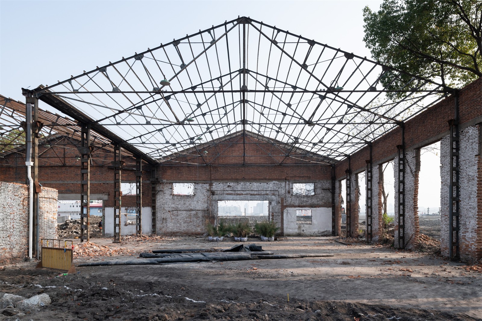 共生構(gòu)架原為鍋爐廠(1953-1979)期間建成的老廠房,因安浦路通過而需要被拆除; 設(shè)計(jì)利用道路斜切角度,對原結(jié)構(gòu)采取一半拆除、一半保留的加固策略,所形成的特殊形態(tài)和幾何關(guān)系,結(jié)合新舊門窗洞口,打開屋頂,引入陽光和綠化, 加入親子沙坑、景觀造坡,使墻里墻外形成一體。既保留了老鍋爐廠的空間樣貌, 又轉(zhuǎn)化成了供市民休憩活動的開放場所,成為建筑與景觀、歷史與城市的共生構(gòu)架。