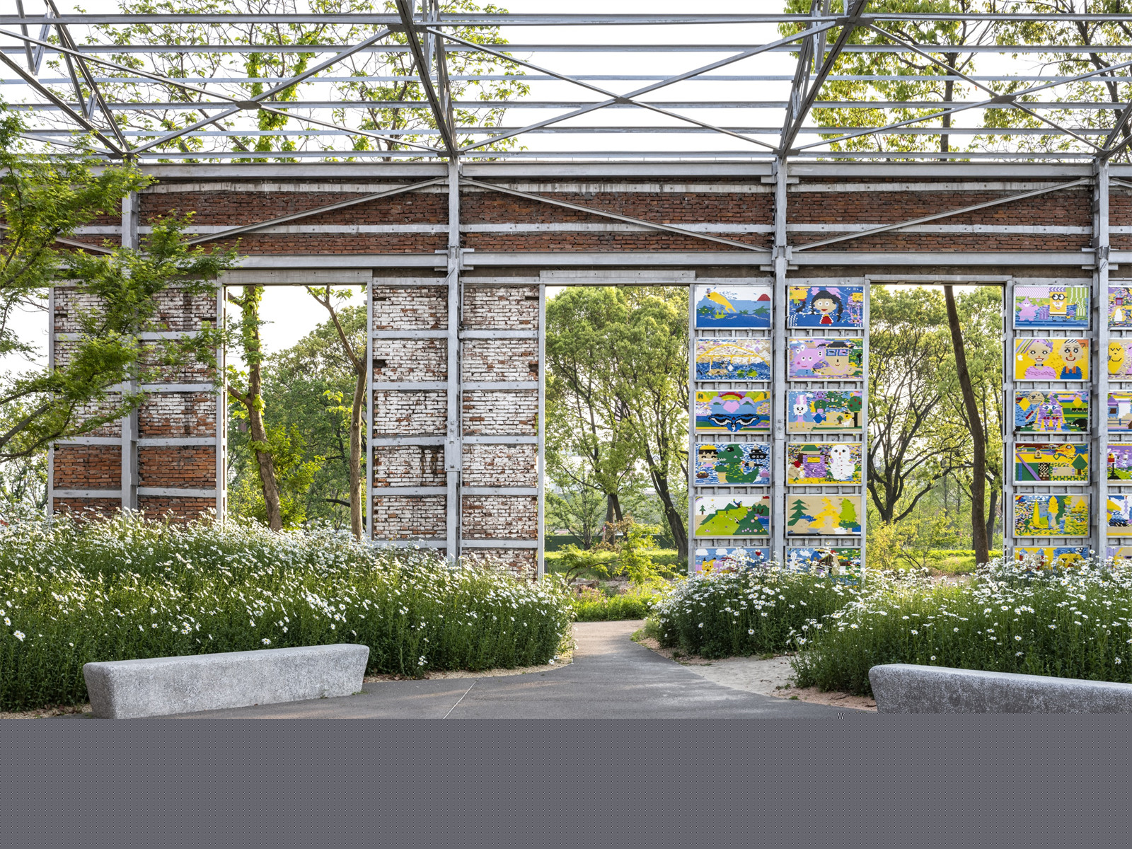 在原內(nèi)河及廠房遺址上, 以混凝土砌塊牆的手法重現(xiàn)原廠房空間, 并透過人工化草甸概念, 鼓勵參與與觀察, 在草甸變遷與演化的過程中,體會上海的四季。