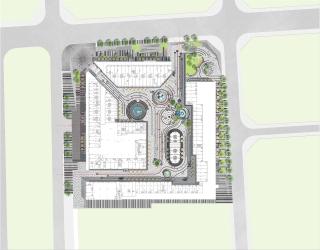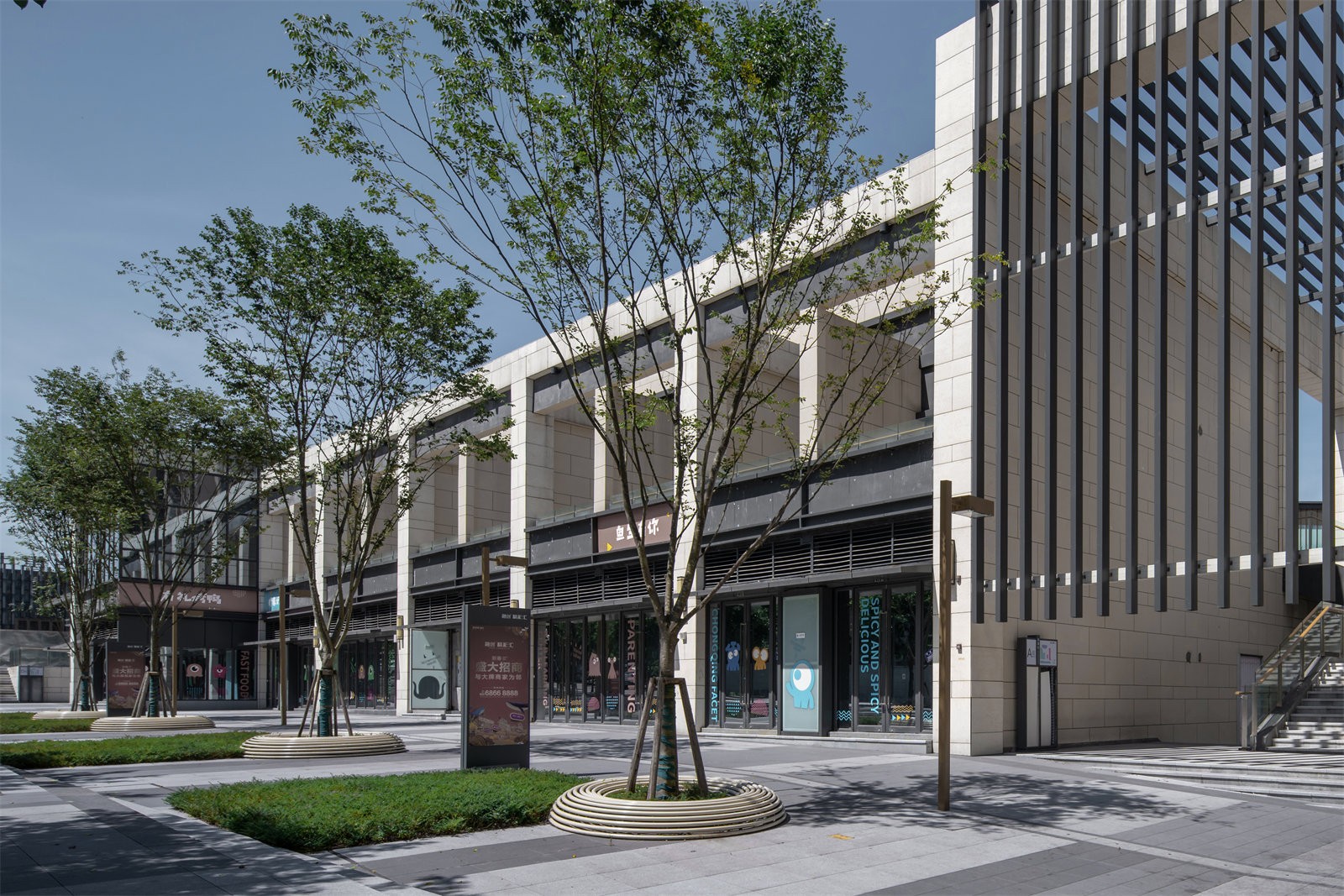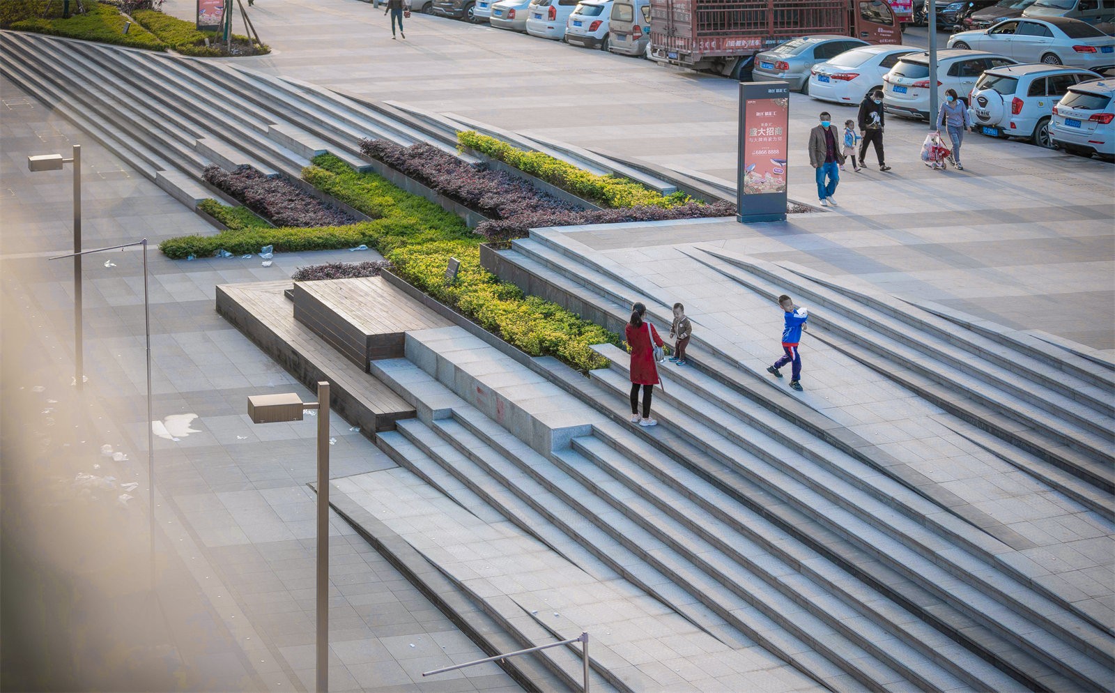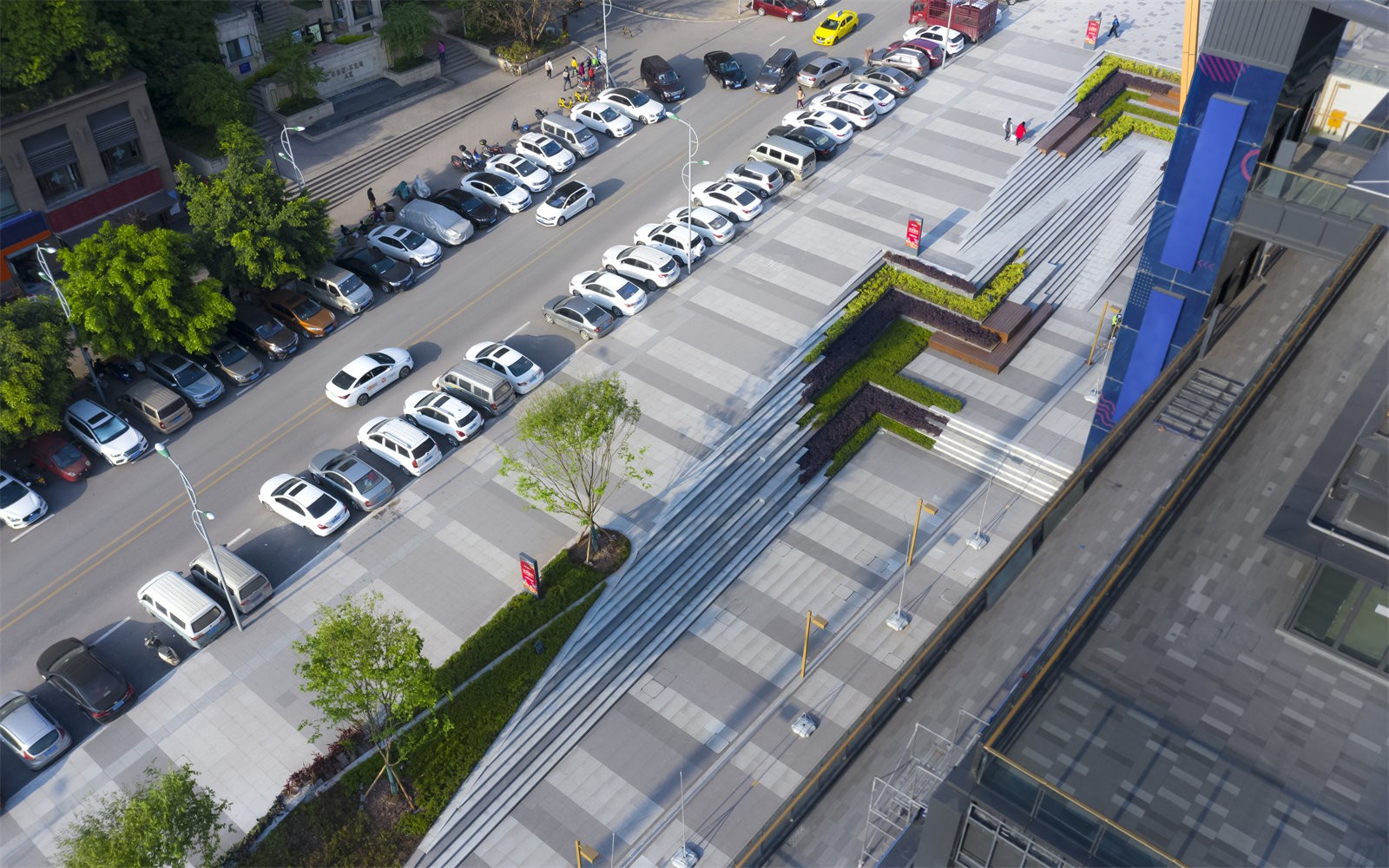 Retail frontage on the north, east and west sides, each get its different value.The retail frontage on the north side is the focus of our design. The height difference from east to west and the height difference from the civic road on the north side to the building are the difficulties for designers.We digest the height difference through the steps and the flower terraces where the shrubs are planted. We guide the pedestrian circulation into the commercial district through paving pattern.
