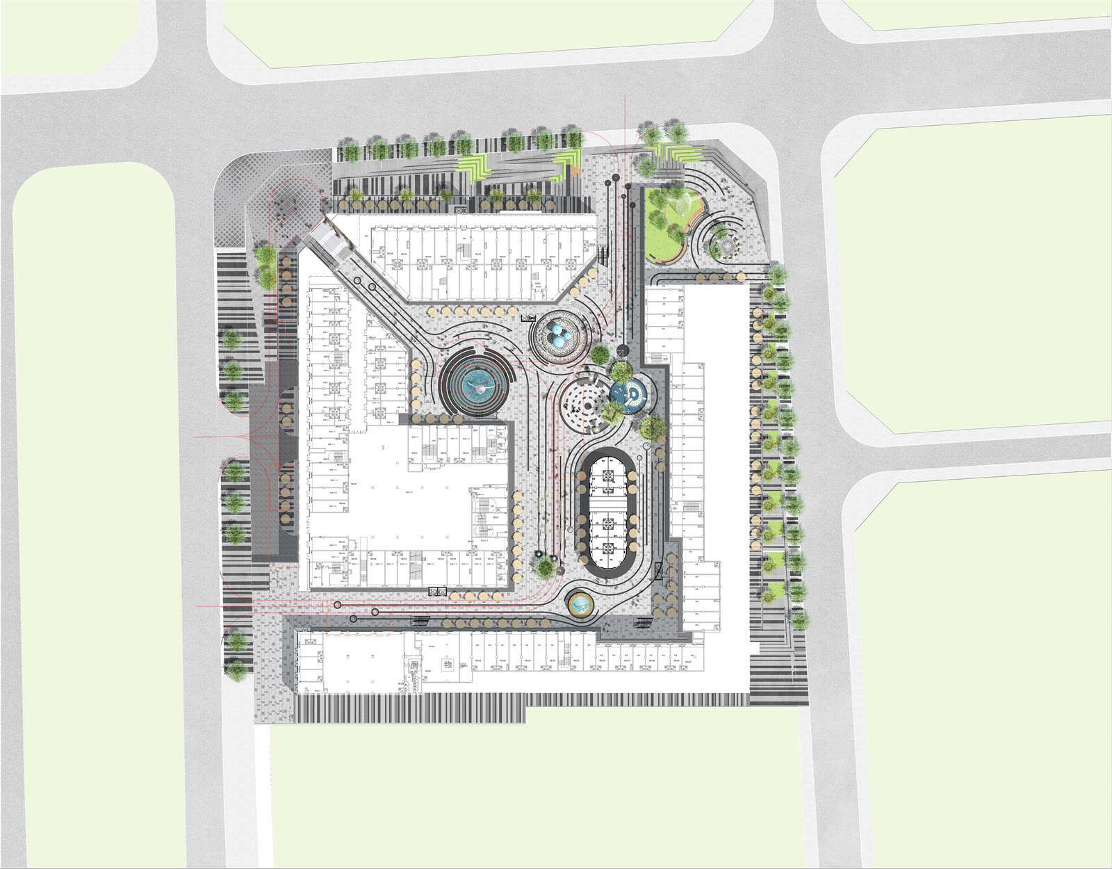 北側(cè)、東側(cè)、西側(cè)的商業(yè)街,其商業(yè)街展示面的價值依次降低. 北側(cè)的商業(yè)街是我們設(shè)計的重心,從東到西的高差,從北側(cè)市政道路到建筑的高差,是設(shè)計的難點。我們通過層級臺階,種植整形灌木的花池臺地消化高差。我們通過引導(dǎo)性的鋪裝,引導(dǎo)人流進(jìn)入商業(yè)街區(qū)。