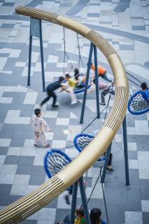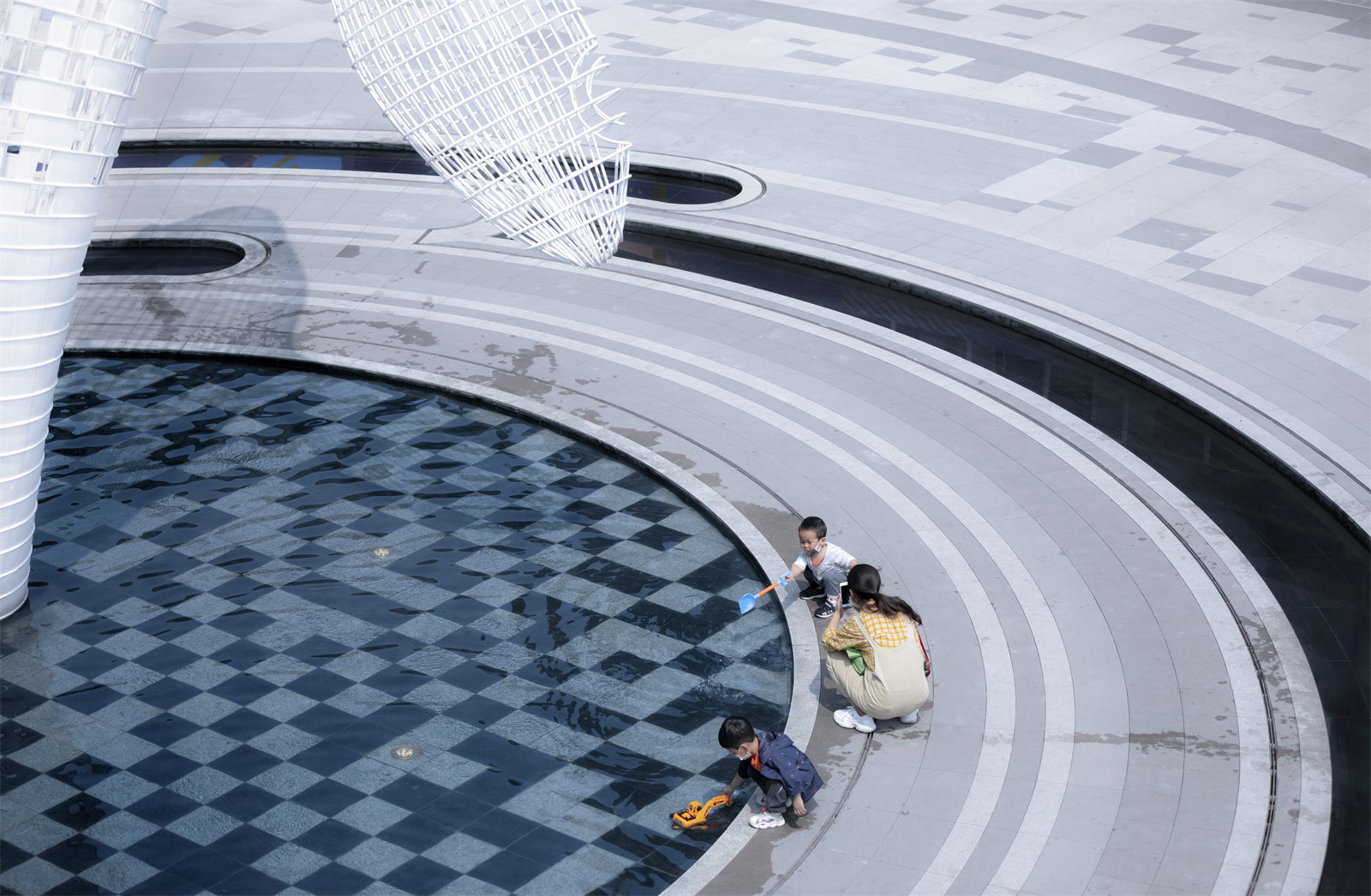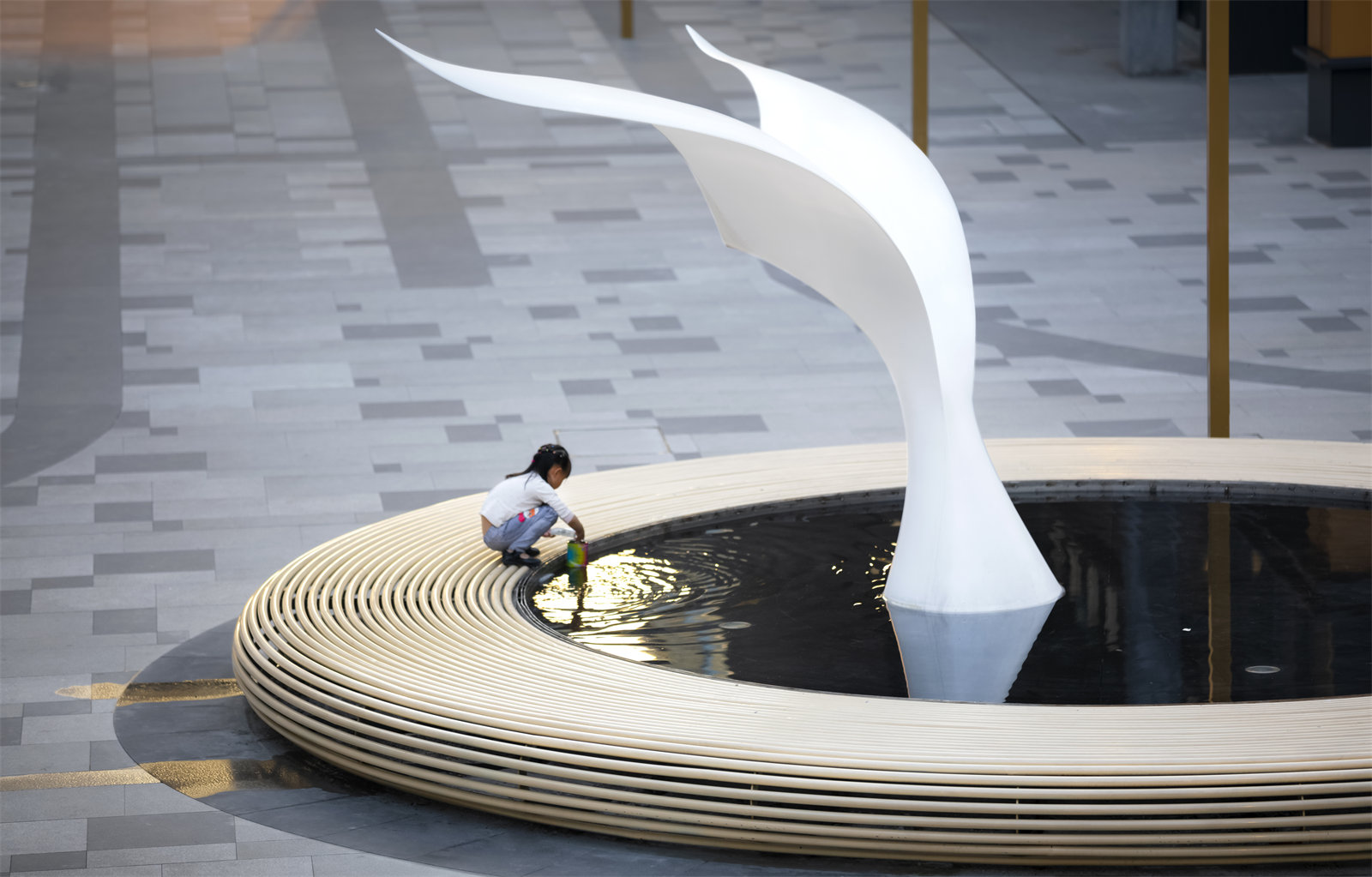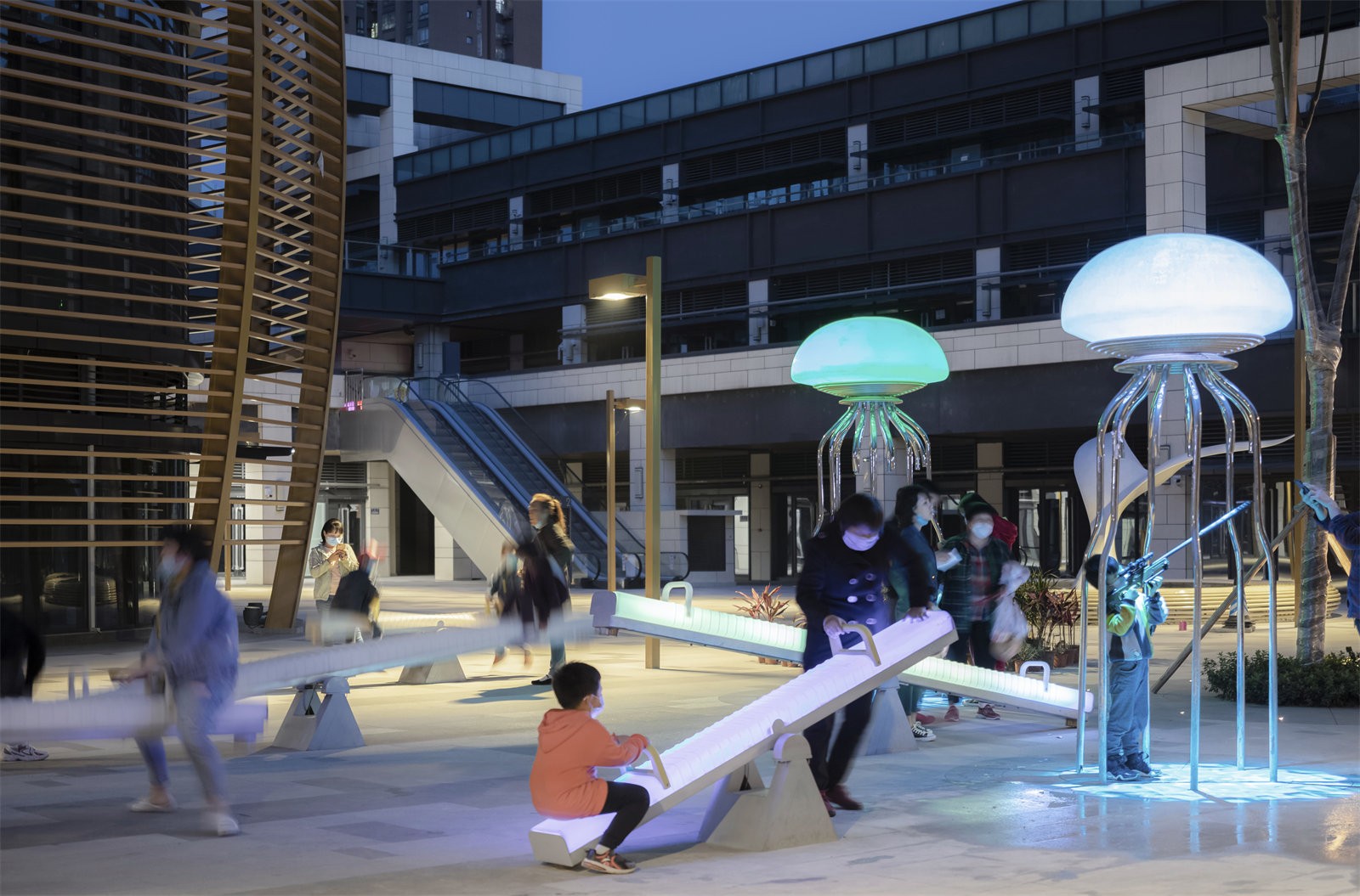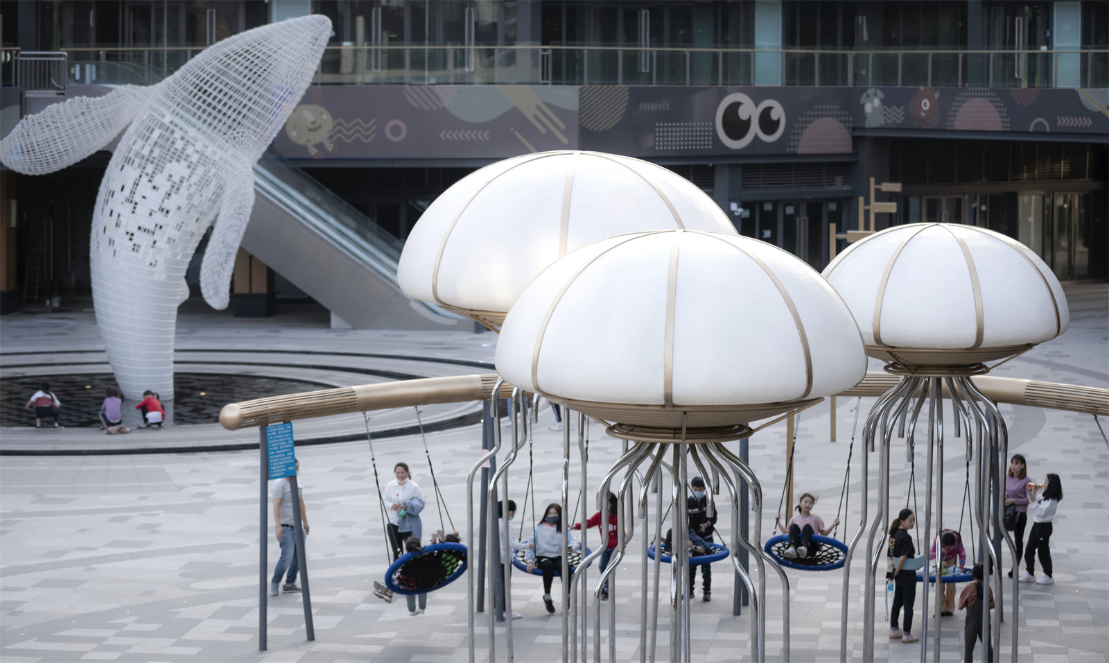 We designed a whale tail pool for children to enjoy water; and jellyfish luminous sculptures, and movable luminous seesaws at a childlike space in the commercial inner street, We activate the commercial inner street space with a simple and modern sculptural water feature and characteristic play facilities.