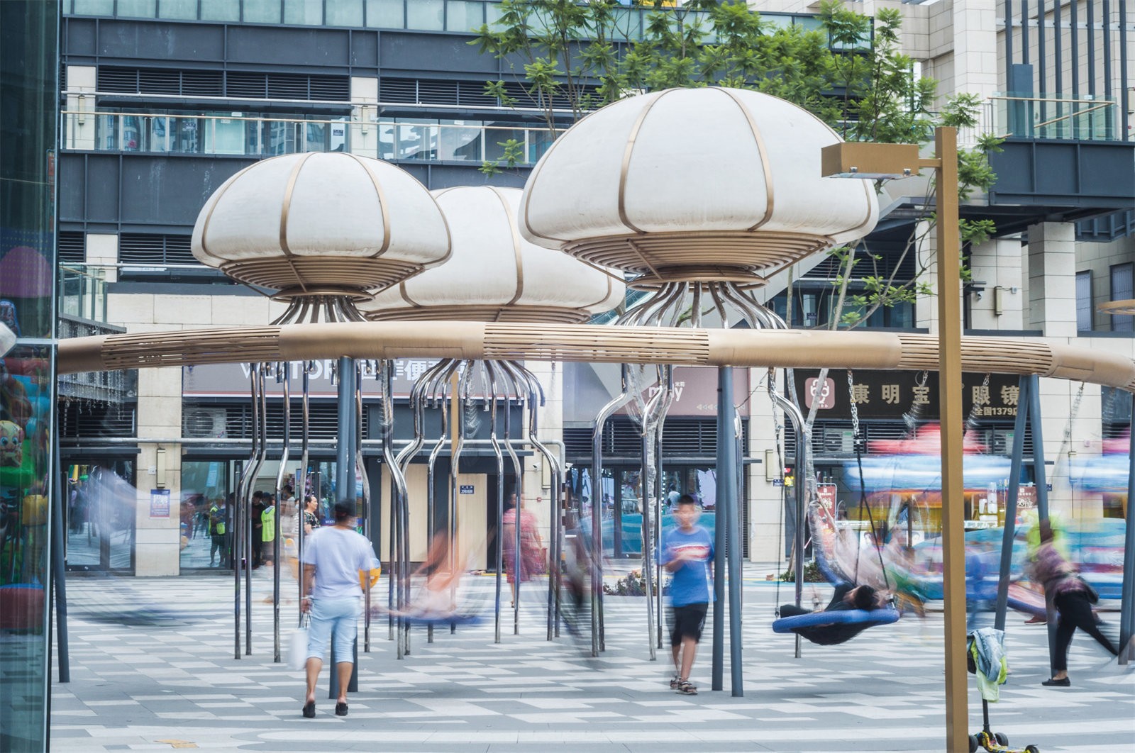 The Ocean Forest Plaza is divided into three sections, namely the jellyfish swing game circle, the fountain square circle light square, and the whale game circle square.