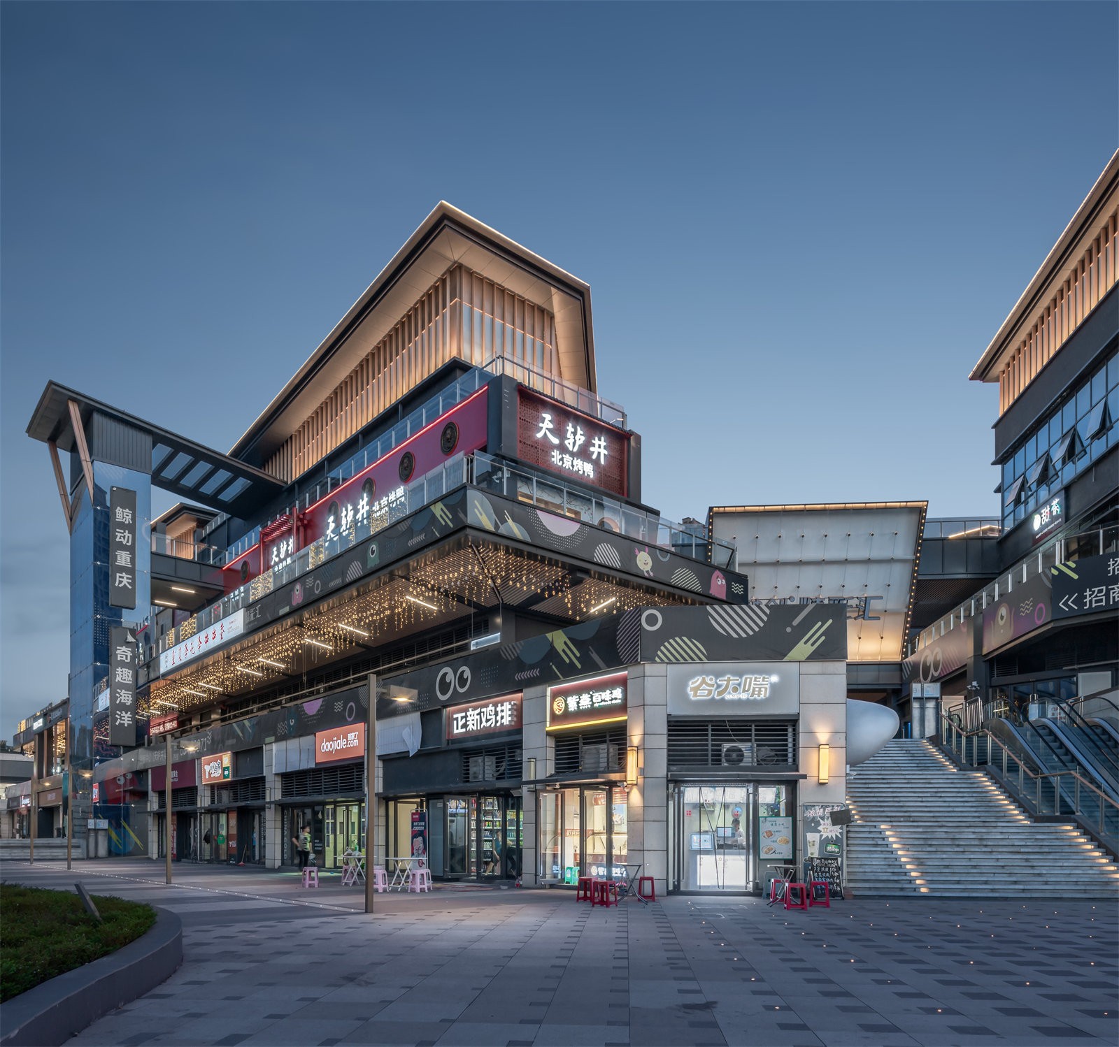 Through appropriate landscape scale, neighborhood center of the block, high-quality green garden, and multi-level landscape experience, we build a happy life scene and create an immersive LOHAS business community. We hope to subvert the traditional commercial landscape design and make it more like a park rather than a commercial complex just for shopping. We implanted the theme of the “ocean” to create a landmark IP-themed commercial block in Chongqing - Sunac Wonderful Exchange.