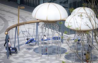 作為商業(yè)內(nèi)街的童趣空間,我們設(shè)置鯨魚魚尾水池,供兒童親水;設(shè)置多個水母發(fā)光雕塑,可移動的發(fā)光蹺蹺板,用簡潔的雕塑水景和特色游戲設(shè)施,激活商業(yè)內(nèi)街空間。