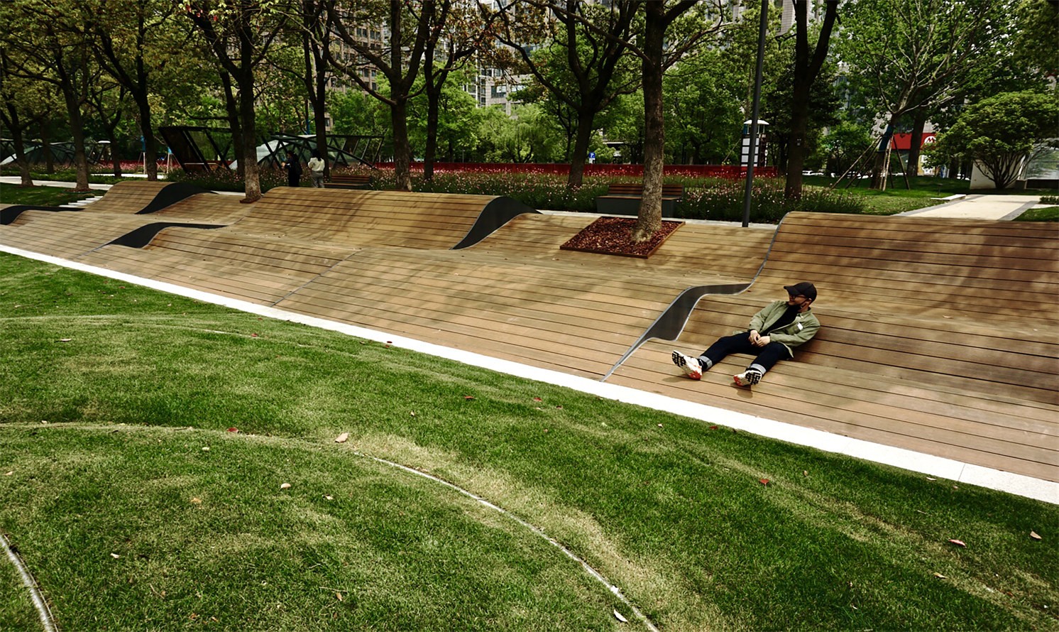 The swirl landforms give a dynamic and soft contrast to the surrounding CBD.