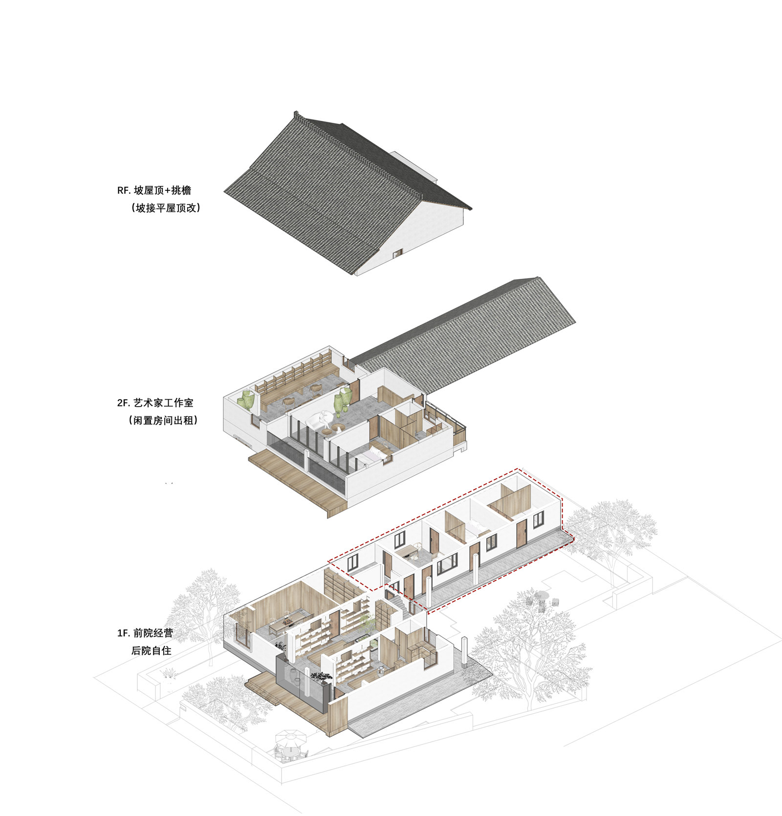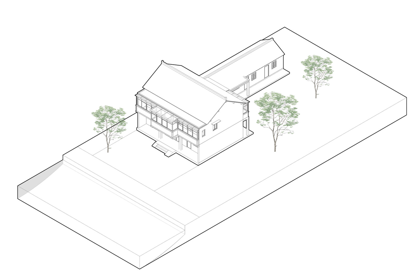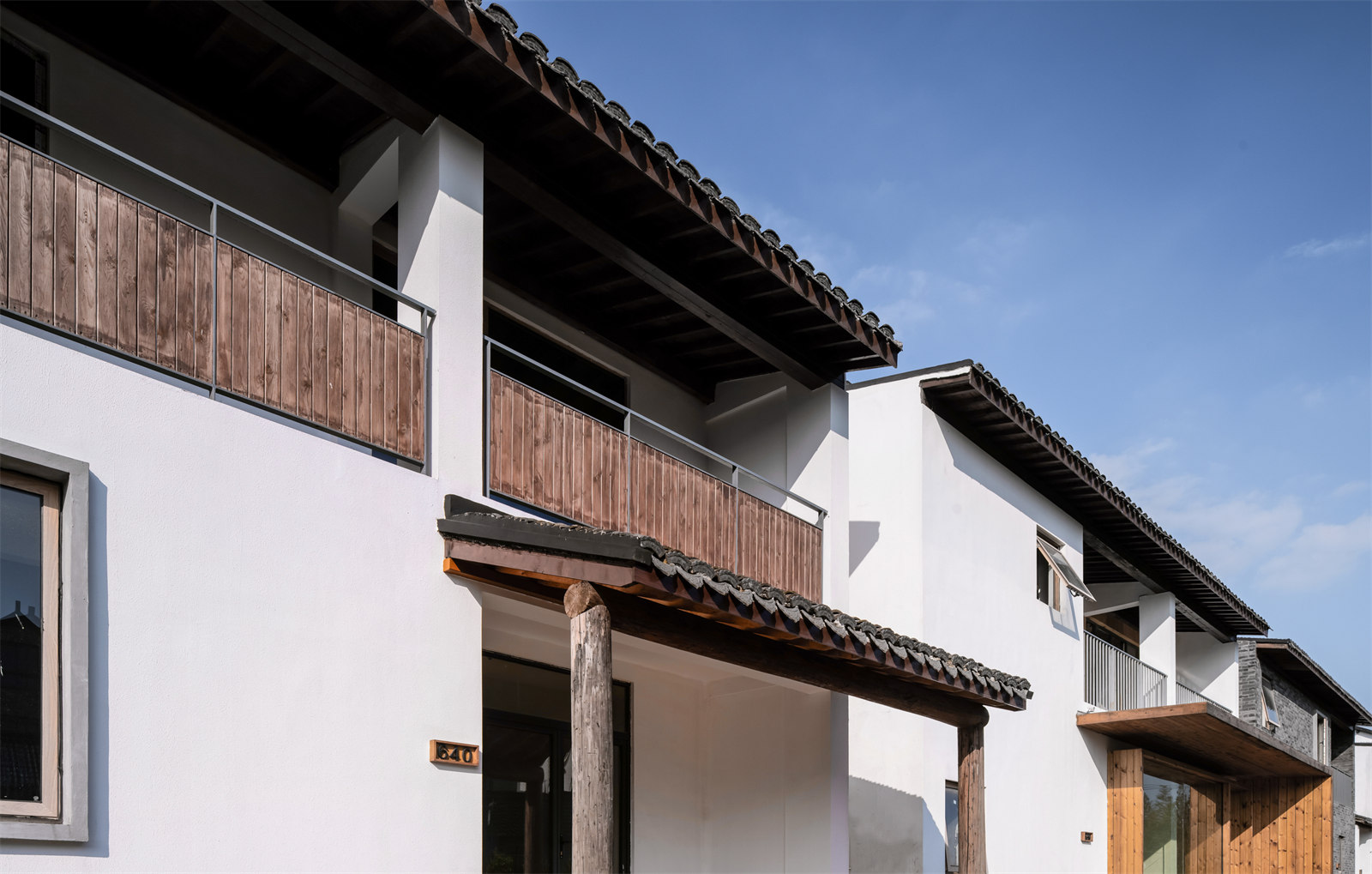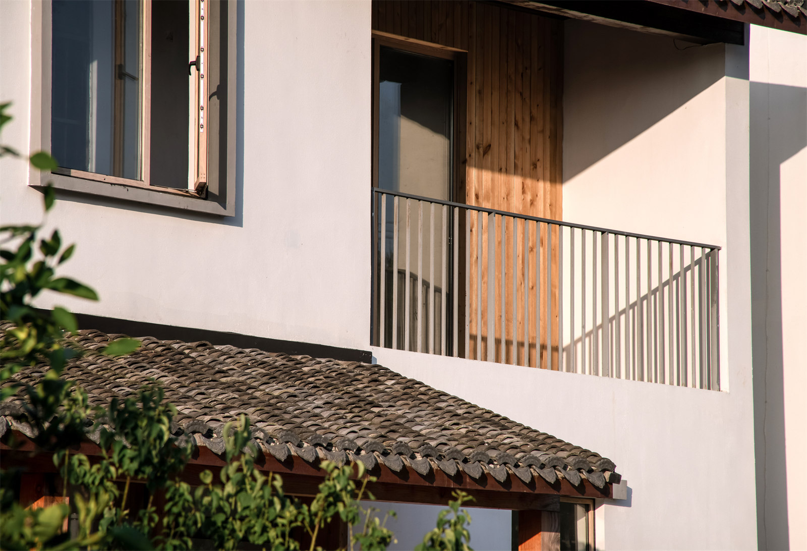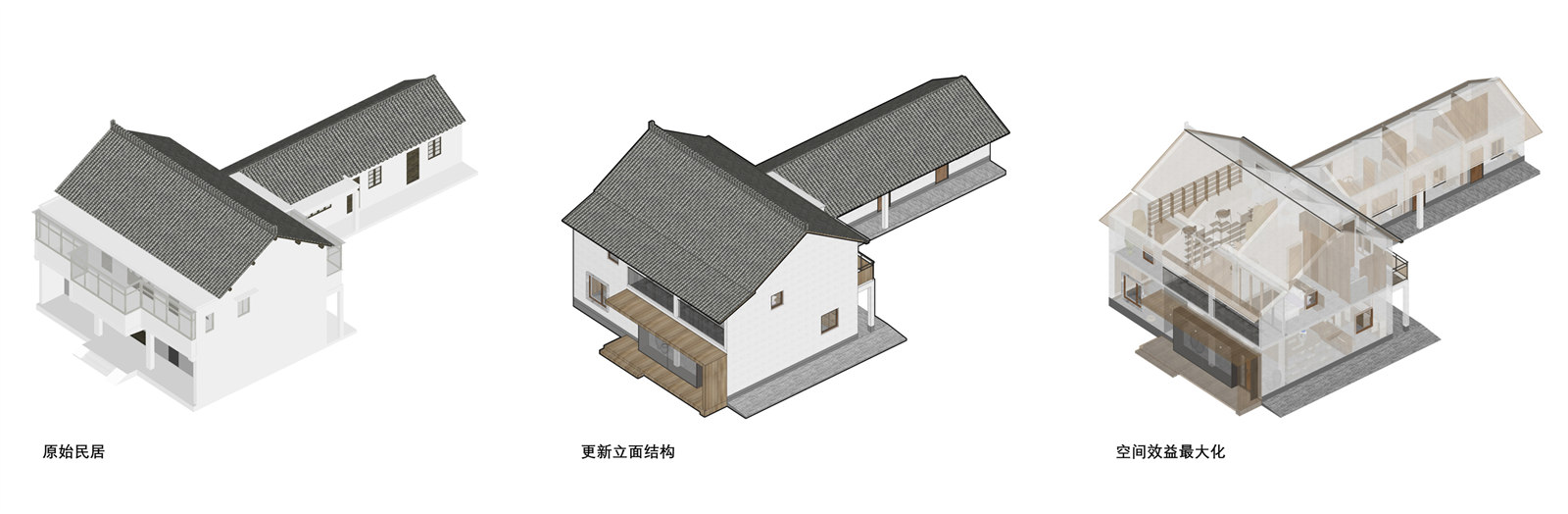 這批民房多為磚混結(jié)構(gòu)空斗墻體,三開間,二層或三層,局部挑出樓板以及屋面板為預(yù)制板,整體結(jié)構(gòu)性能難以滿足日后運(yùn)營功能以及村民日常生活。改造的重點(diǎn)是南立面,因此屋頂和陽臺(tái)的關(guān)系,成了我們主要要解決的問題。