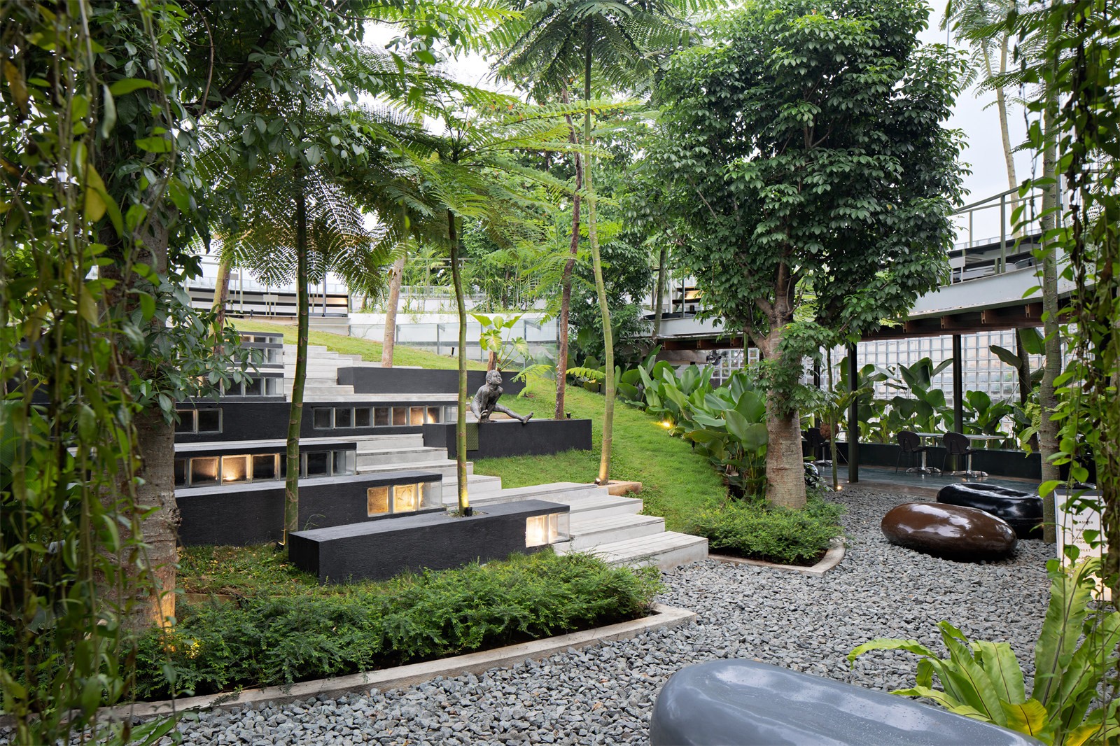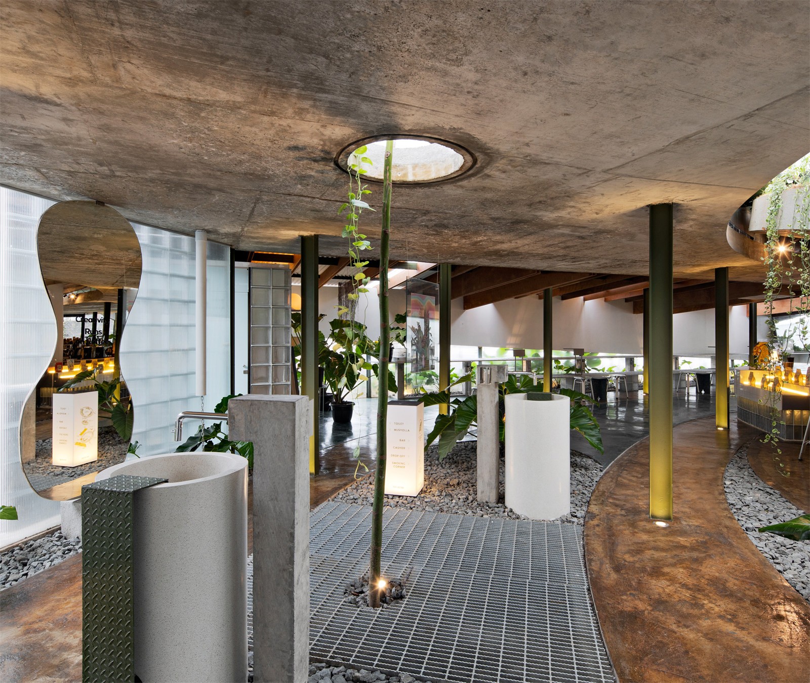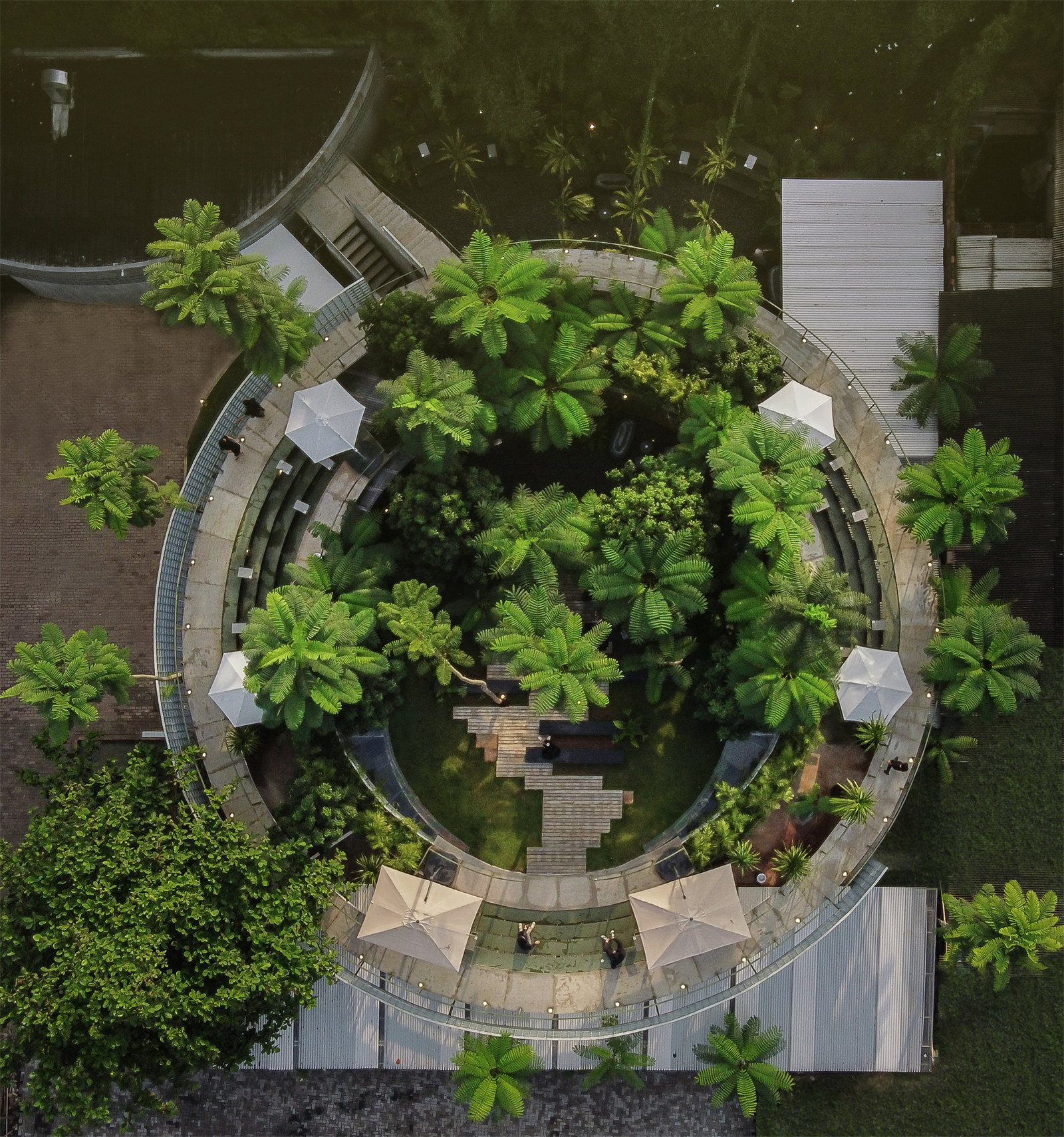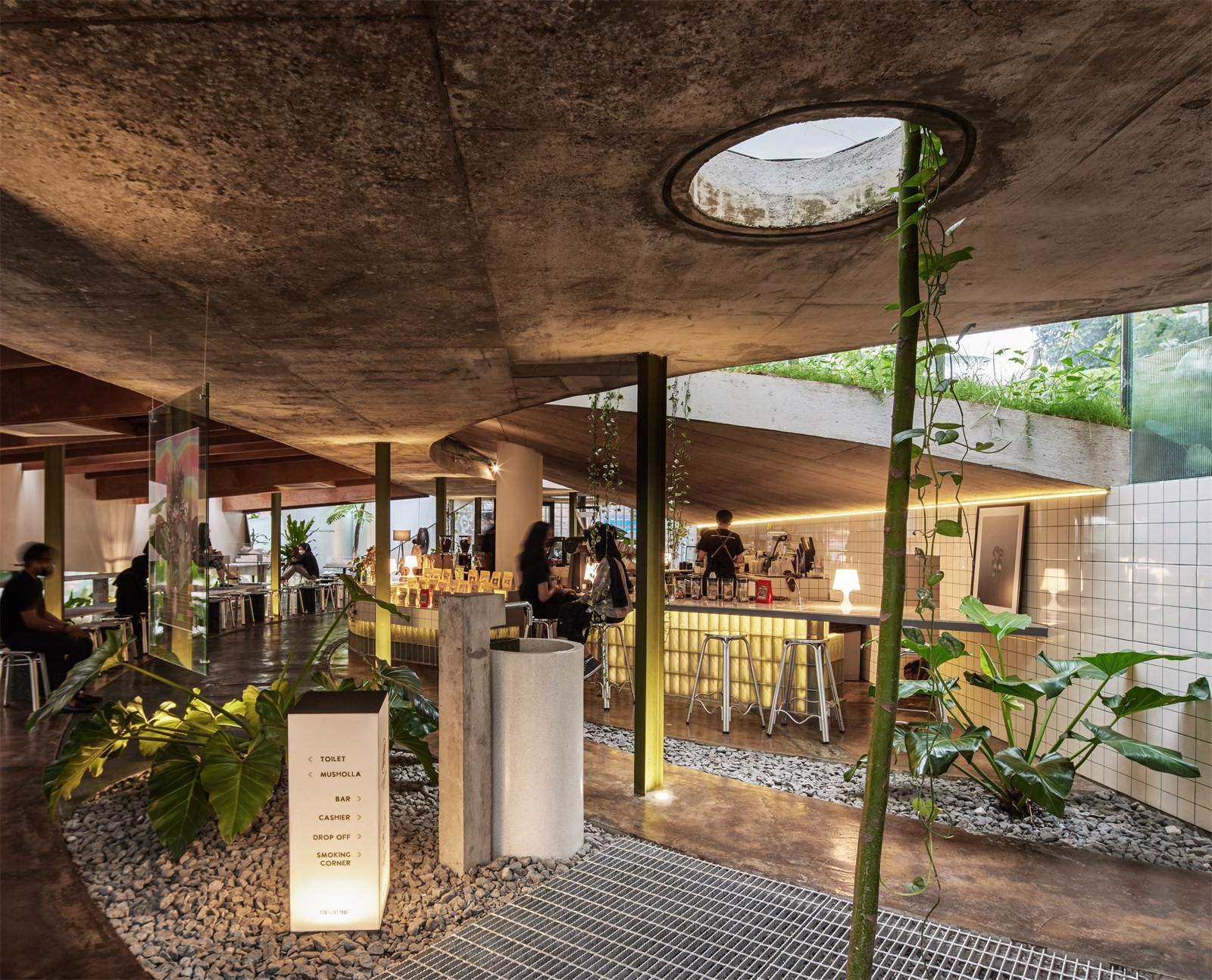 The architects developed three strategies to create a functional integrated cafe space within the nature. The first approach is to connect all the existing tree as means of circulation for the visitor. Secondly, stringing all the structure to create an underground intimate scale experience in the main entrance. Next, is to create a contrast experience in scale, color, density of nature, and amount of natural sunlight penetration hidden in conceal doors in both wings in the lobby/bar area. This dynamic intervention into the existing landscape to ensure that the new landscape intervention performs aesthetically in harmony with the garden as a whole.