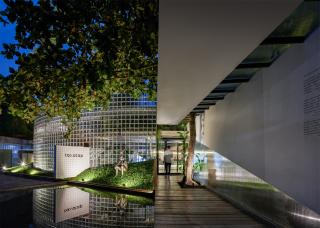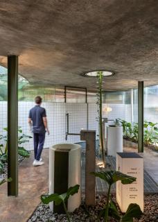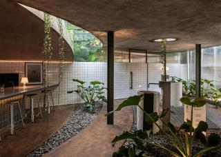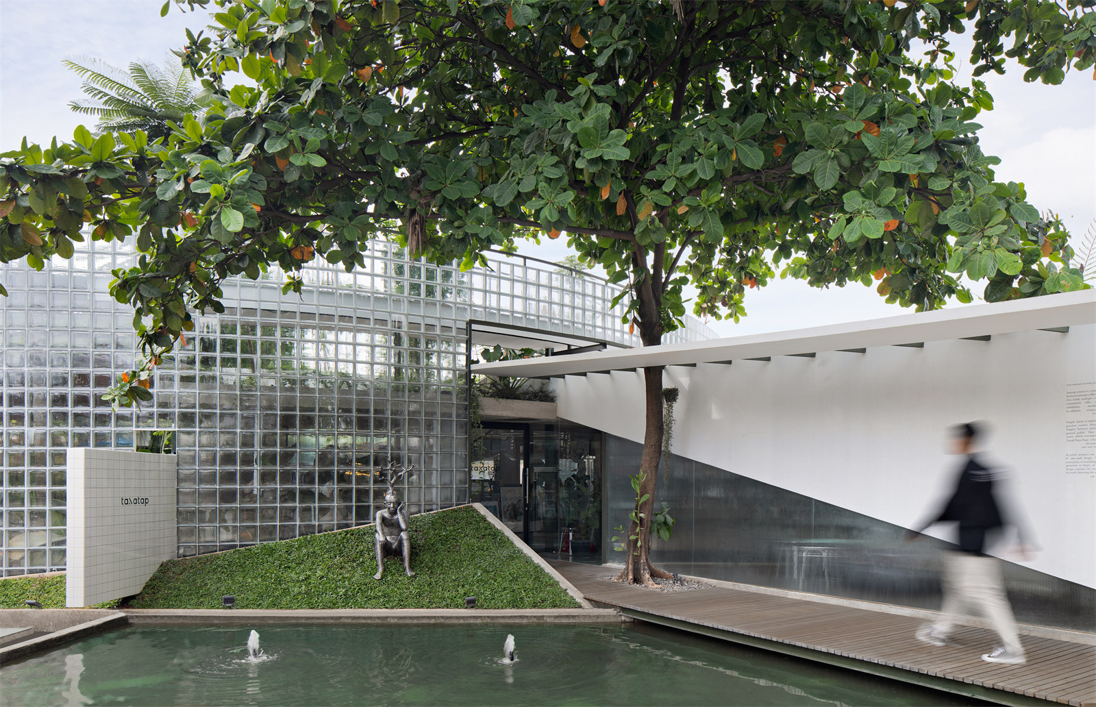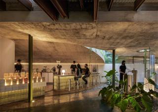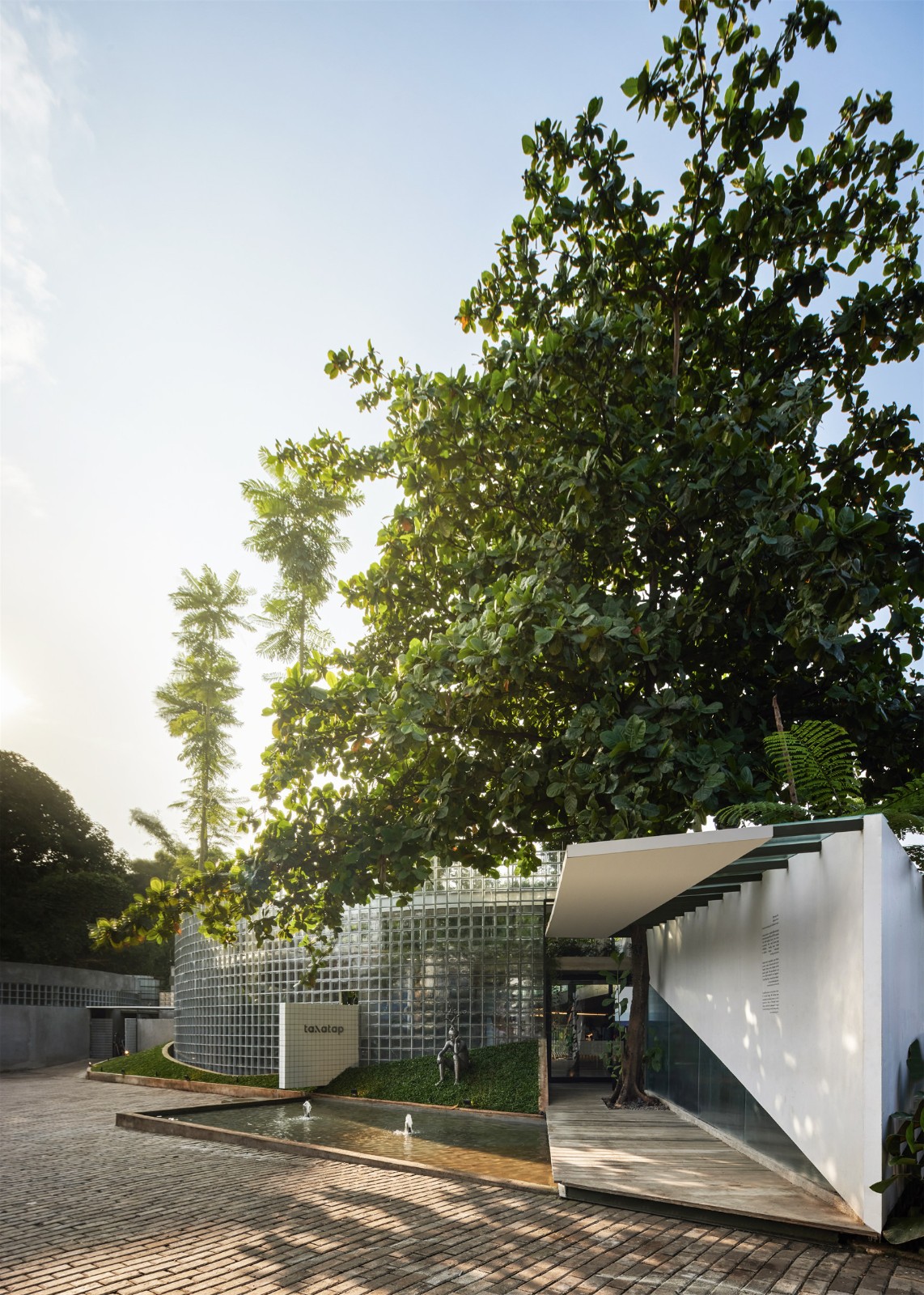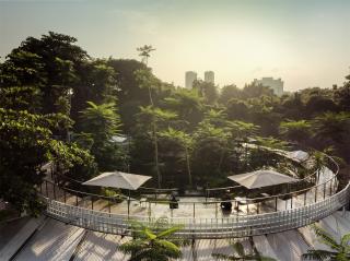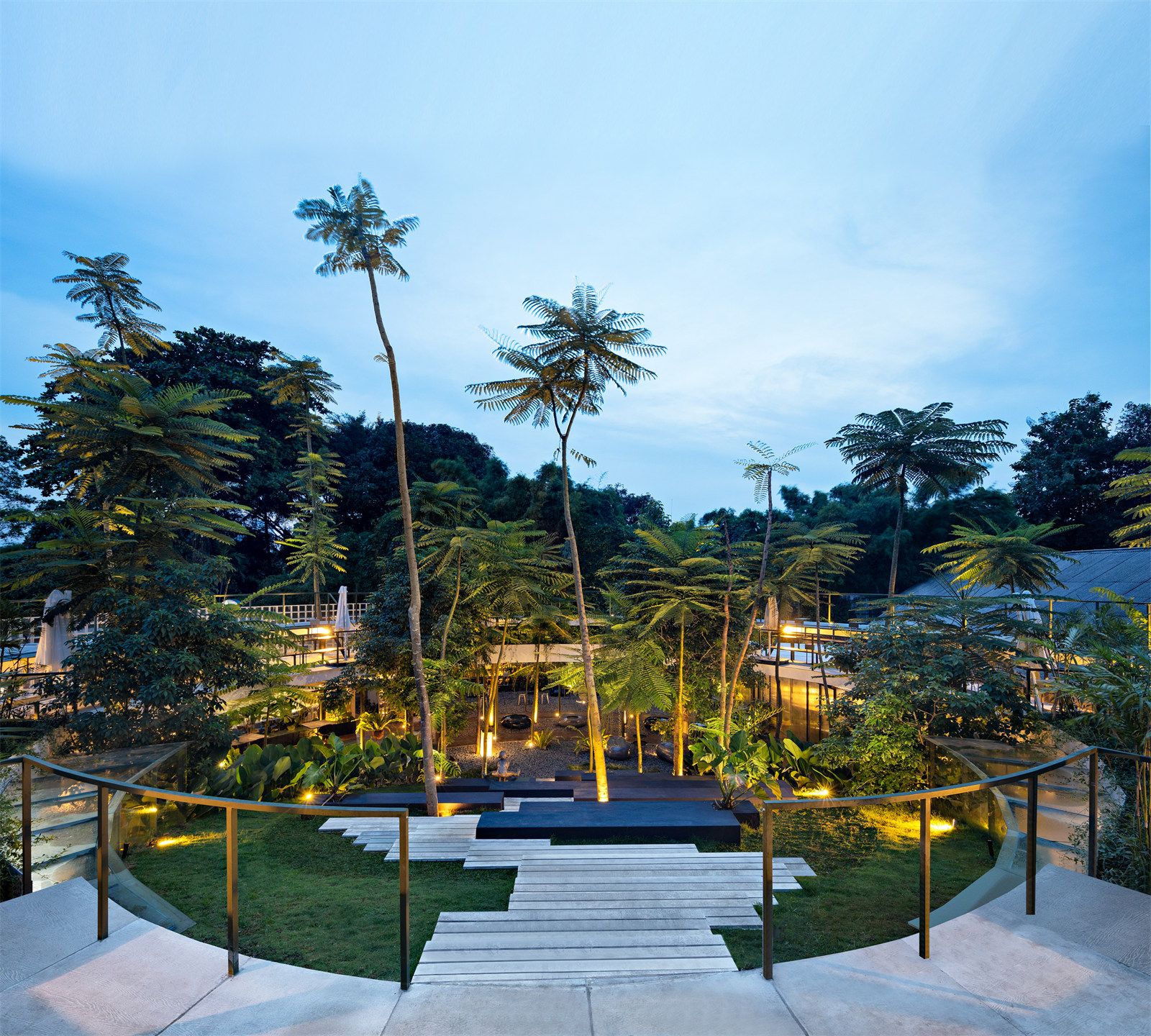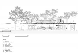 The architects developed three strategies to create a functional integrated cafe space within the nature. The first approach is to connect all the existing tree as means of circulation for the visitor. Secondly, stringing all the structure to create an underground intimate scale experience in the main entrance. Next, is to create a contrast experience in scale, color, density of nature, and amount of natural sunlight penetration hidden in conceal doors in both wings in the lobby/bar area. This dynamic intervention into the existing landscape to ensure that the new landscape intervention performs aesthetically in harmony with the garden as a whole.