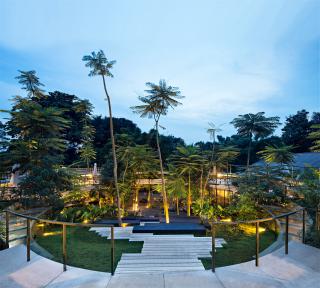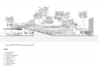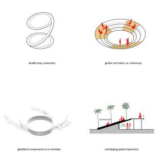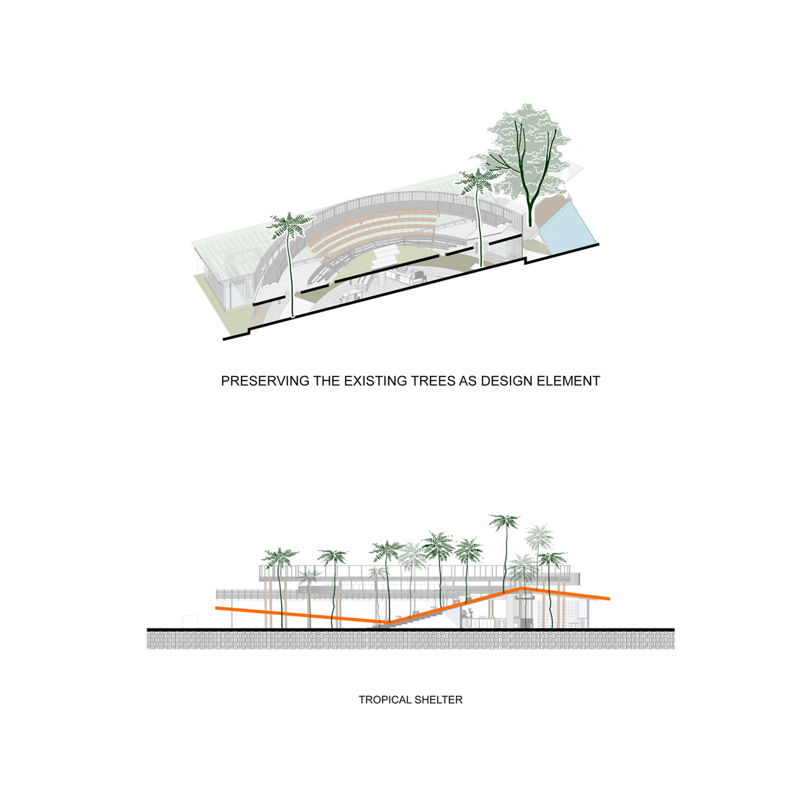 As visitors enter the Ring Garden, they are surrounded pathway bridge that connects 2 existing trees that blurs the definition of indoor and outdoor space. Upon entering the spaces, they were teased by what appears to be sliced of skylight and people activities in garden above. Concentric space with coffee bar in the middle, space branches into 2 spaces behind the concealed door that gradually become less intimate and flooded with more natural light penetrating. Both spaces are leading to the main spacious multi-leveled garden area as the ending and indirectly persuading visitor to enjoy more of what tropical garden could be.