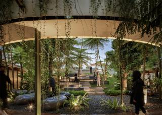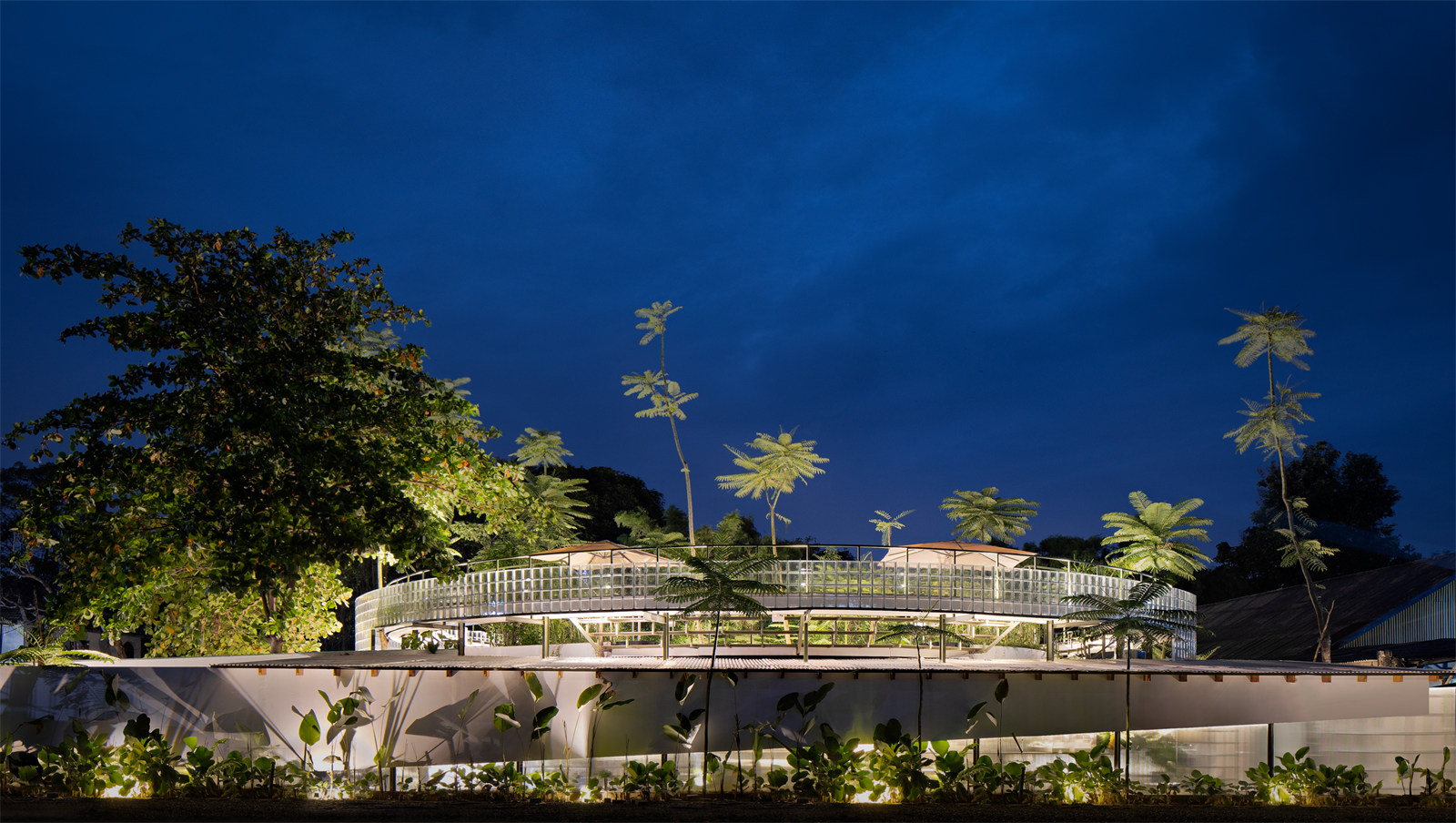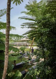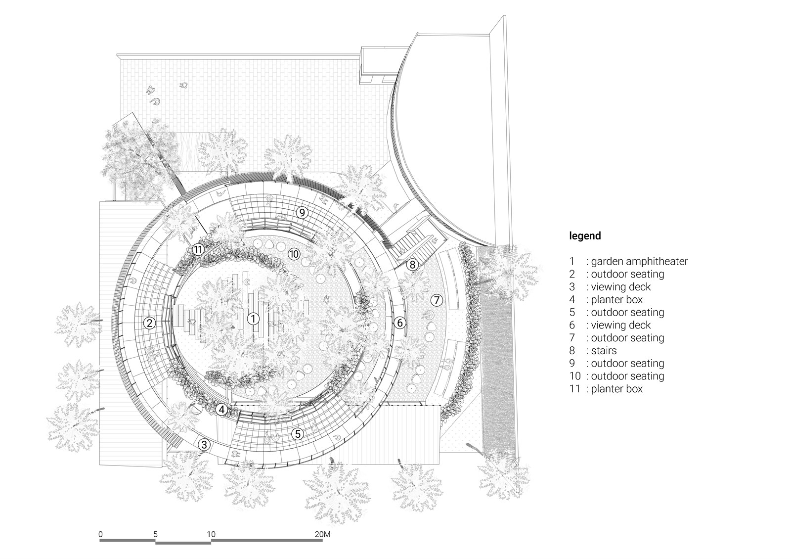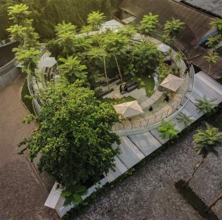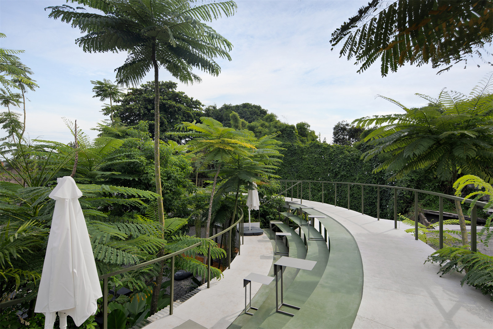 Tanatap環(huán)形花園咖啡廳是微縮的多層次綠色空間,其平臺(tái)在起落之間構(gòu)建出可暢通步行的屋頂景觀空間。連接成片的多個(gè)平臺(tái),如同一系列漂浮式的圓形劇場(chǎng),包圍著中間的綠色空間與具有熱帶氛圍的戶外活動(dòng)場(chǎng)地。