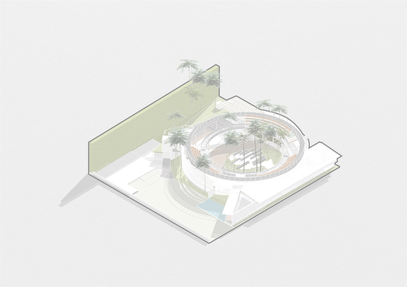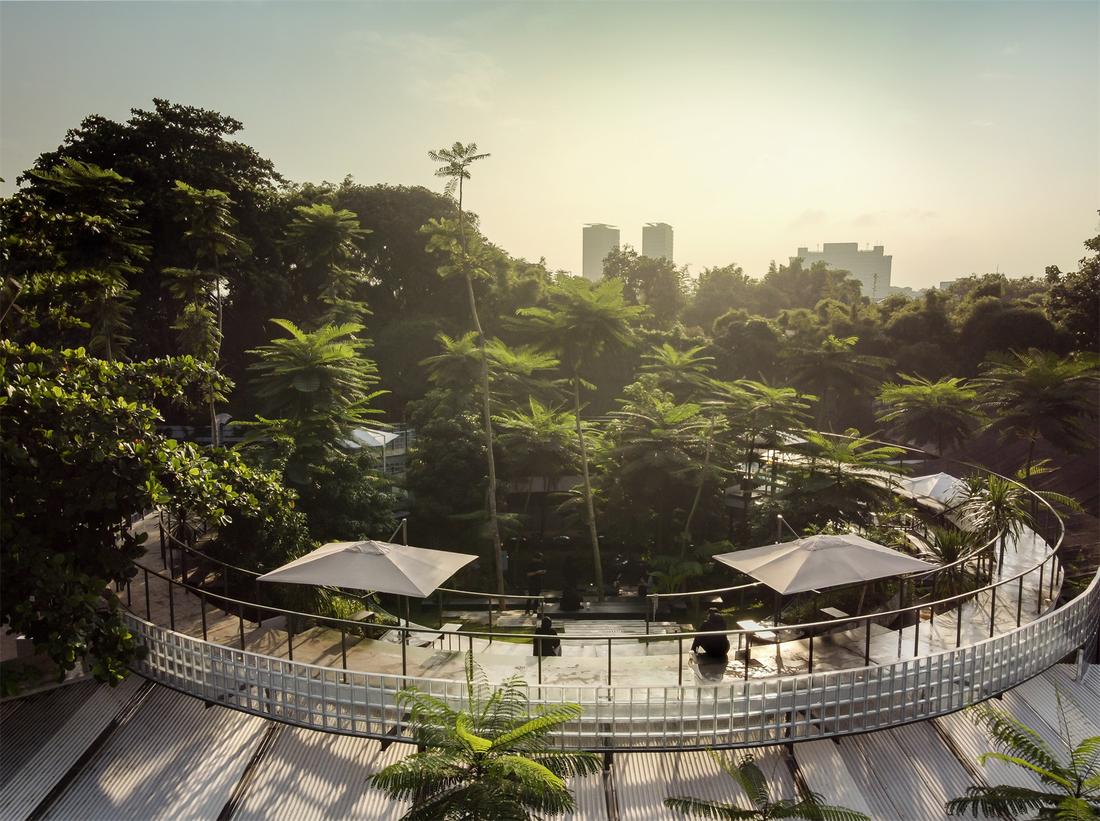 設(shè)計(jì)始于一個(gè)問(wèn)題:如果功能性空間和建筑僅僅被定義為開(kāi)放式花園的外殼,將會(huì)怎么樣?設(shè)計(jì)旨在打造一處隱藏在簡(jiǎn)單的多層花園中的、近乎“消失”的室內(nèi)空間。被創(chuàng)建的空間具有連續(xù)性,不再是單一的初始空間。項(xiàng)目的核心理念是“歡樂(lè)相聚”。我們希望這是一個(gè)令人耳目一新的、充滿活力的、具有持續(xù)發(fā)展動(dòng)力的城市空間——在像雅加達(dá)這樣的發(fā)展中國(guó)家城市,政府運(yùn)營(yíng)的公共空間往往并不可靠。