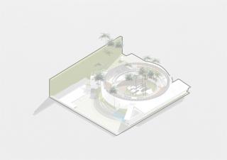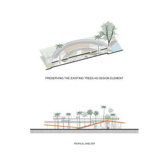 Ring Garden Café called Tanatap is a small prototype of multi-leveled greenspace with dynamic platforms that rise and fall to create a walkable roofscape. The structure will be connected to create series of floating amphitheater surrounding green spaces and tropical outdoor activities in the middle.