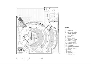 該項(xiàng)目被設(shè)定成實(shí)驗(yàn)性的探索,用以觀察和了解在建筑師重構(gòu)空間層次后,訪客運(yùn)用空間的方式。RAD+ar團(tuán)隊(duì)利用這個(gè)項(xiàng)目來(lái)深入了解訪客們?cè)诓皇煜さ目臻g中的行為表現(xiàn),因此咖啡廳中的大多數(shù)家具都未被定義,并與硬質(zhì)景觀和其他景觀特征融合在一起,從而作為一項(xiàng)實(shí)驗(yàn),來(lái)觀察不同的訪客在使用這些家具時(shí),如何自定義舒適感的。整個(gè)項(xiàng)目也被看作是一項(xiàng)社會(huì)實(shí)驗(yàn),研究人們?nèi)绾卧陂_(kāi)放空間/花園中不斷重新定義對(duì)第三空間的感覺(jué),以及這份感覺(jué)如何在每天不同時(shí)段的不同人流量中持續(xù)改變的。