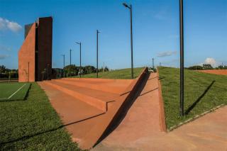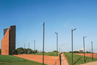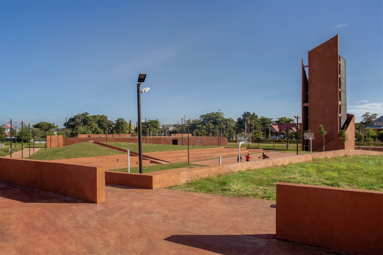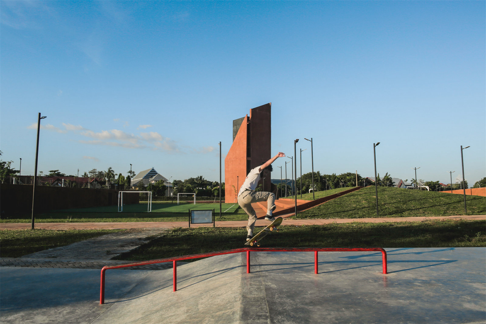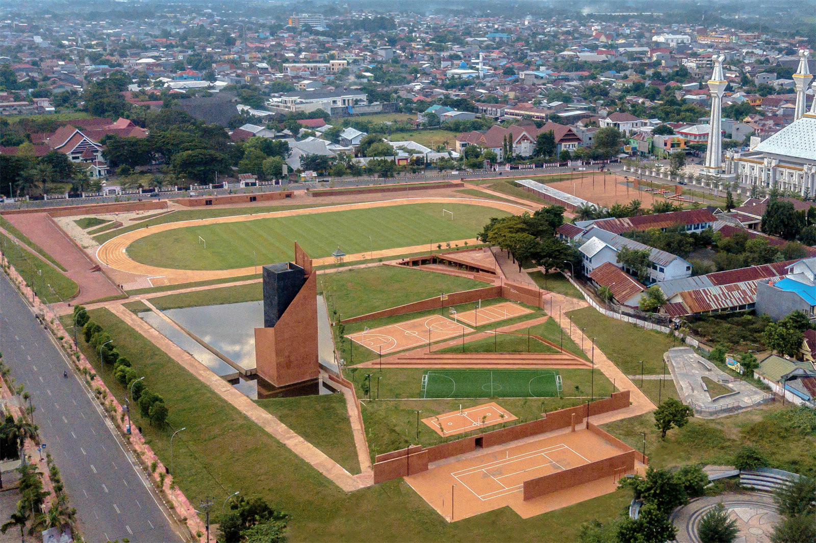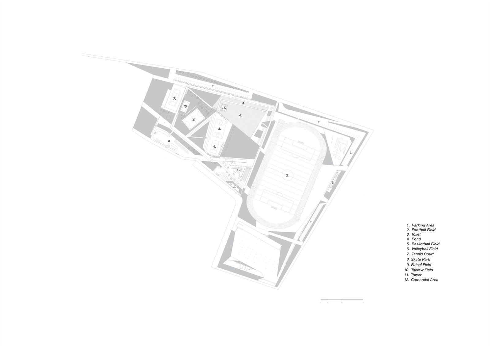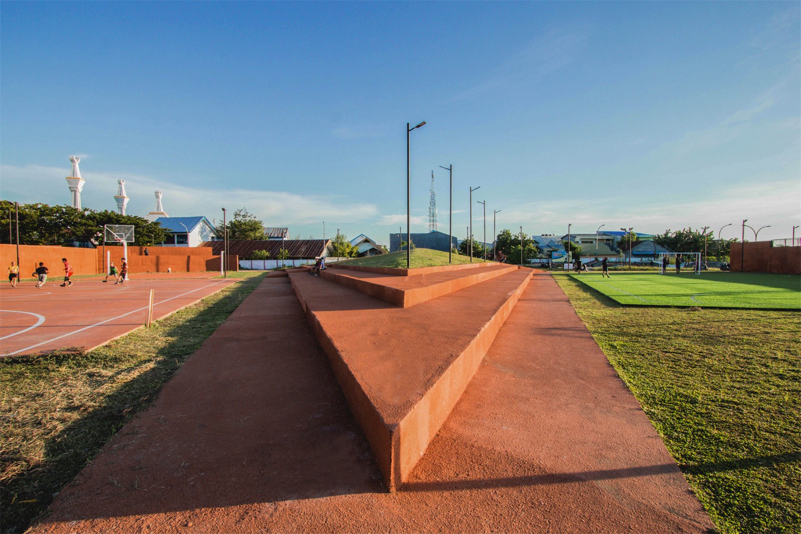 本項(xiàng)目由印度尼西亞戈瓦市政府發(fā)起,以期由此振興Syech Yusuf Discovery區(qū)域。場地毗鄰大清真寺和市長辦公室在內(nèi)的市政大樓,該地區(qū)也因此成為當(dāng)?shù)厥姓顒拥闹行摹4送猓@里還有諸如慢跑道與運(yùn)動場之類的豐富運(yùn)動設(shè)施,使它成為市民喜愛的去處,甚至周邊城市的居民也會在周末來此游憩?;趫龅氐闹苓叚h(huán)境及設(shè)施,設(shè)計(jì)著眼于運(yùn)用軸線將各處場所串聯(lián)起來,創(chuàng)造一條貫穿整個(gè)場地的路徑。