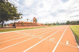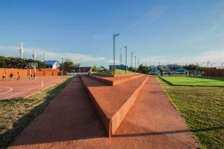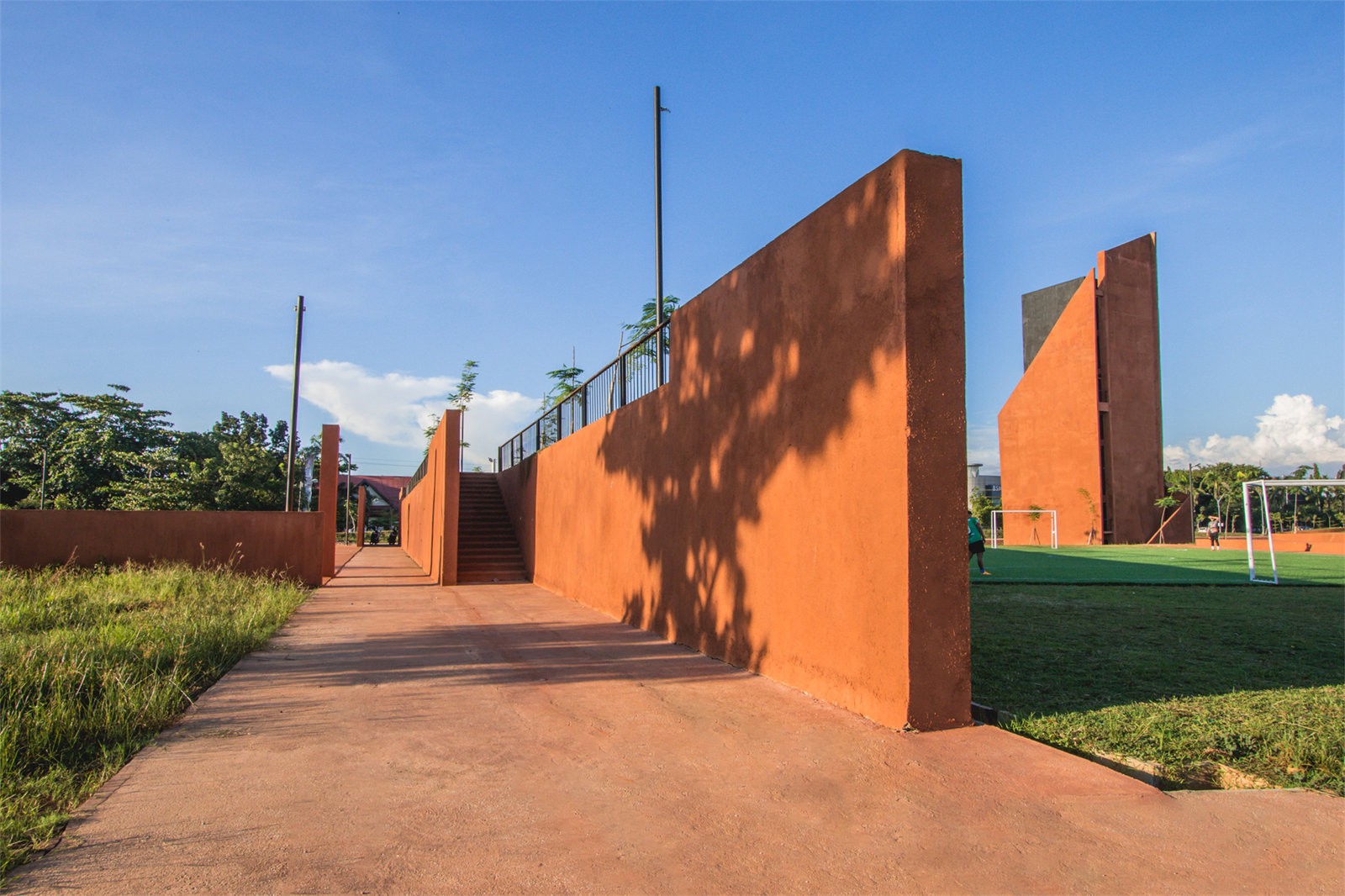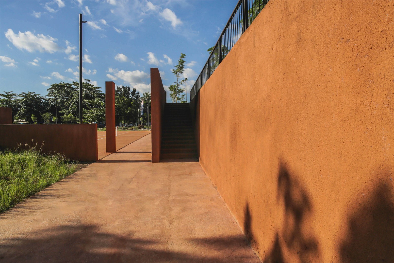 Slopping tracks were not only meant as viewpoints to enjoy the scenery, but these elevated slopping tracks also functions as high walls that replaces the functions of fence to keep any kind of balls inbound so the user won’t bother other zones. The usage of gravels was meant to reduce ball rebounds. Both of this intervention allows the zone meant for sport to stay open without any fence around it.