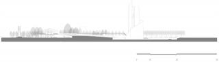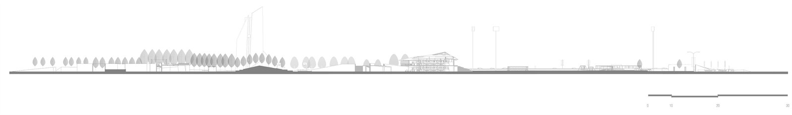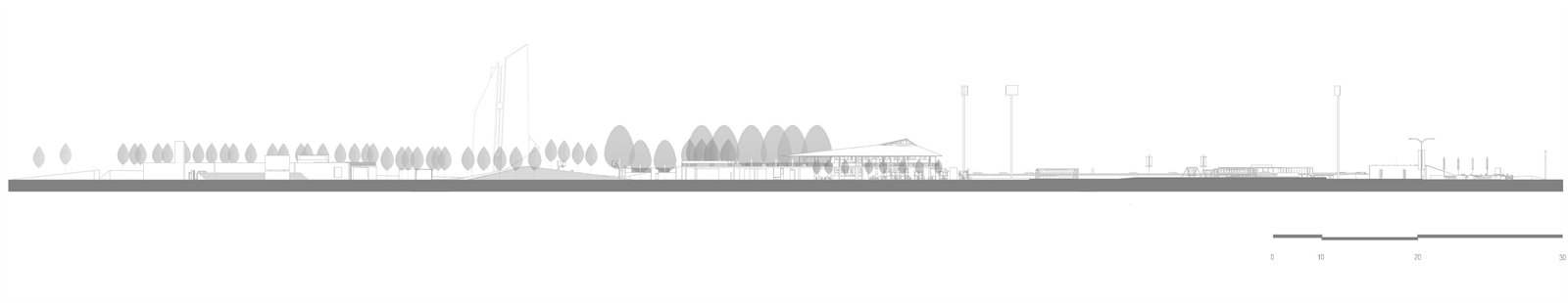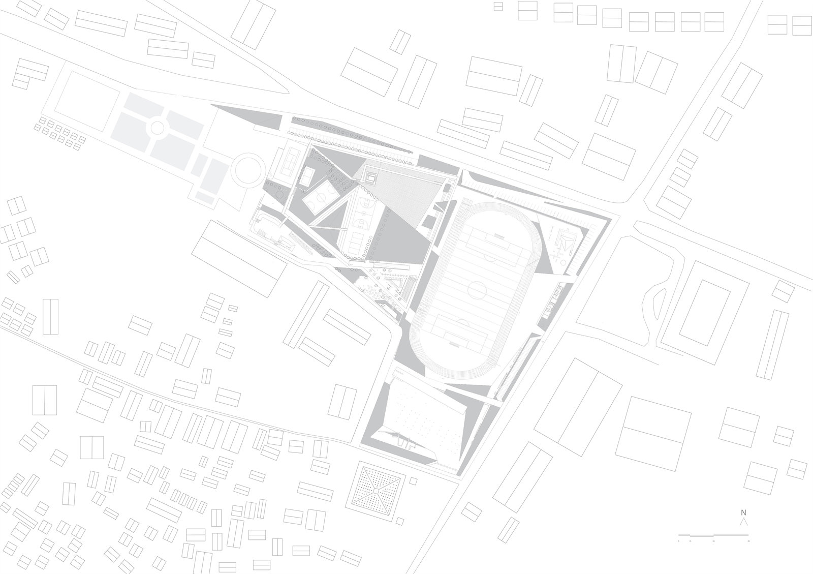 由于北部集市區(qū)與公園直接相連,為了避免大量人流造成的交通堵塞,設(shè)計(jì)師結(jié)合交叉流線與斜坡地形,在場地內(nèi)創(chuàng)造出不同層次的視角。交叉環(huán)路在多處與場地邊界相交,形成豐富的空間節(jié)點(diǎn),不同高度的視角與帶有坡度的跑道也為使用者提供了更為自由的路線與使用選擇。