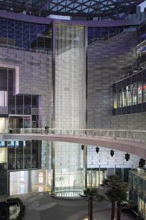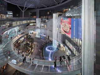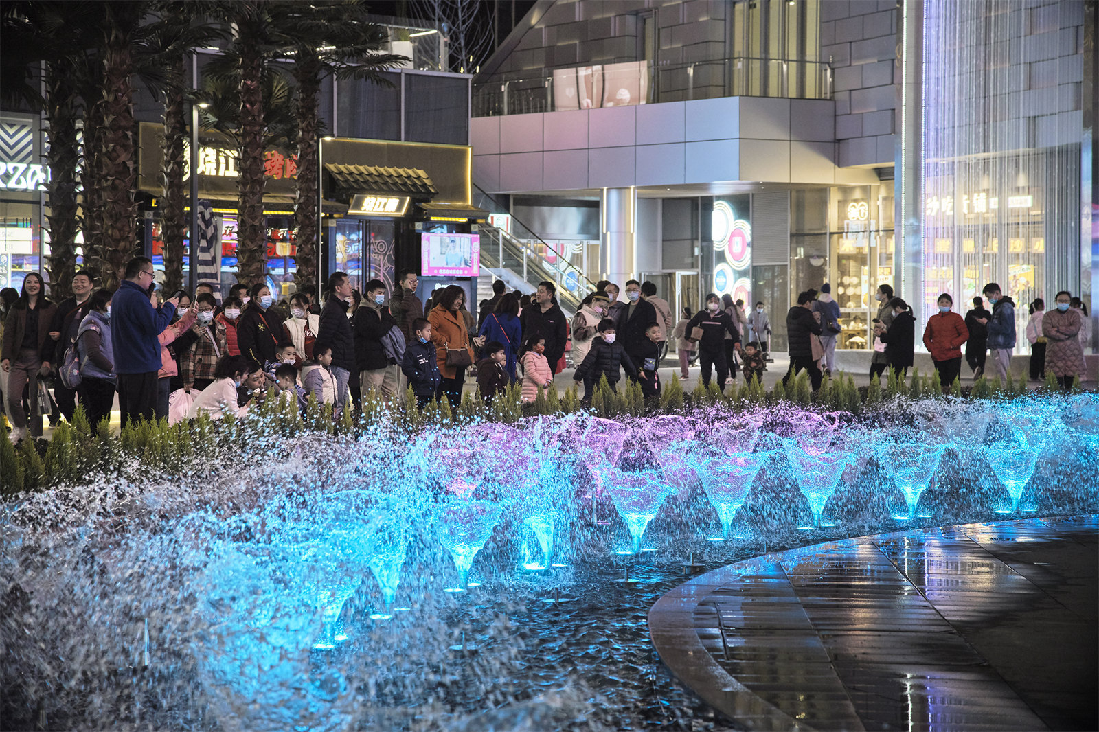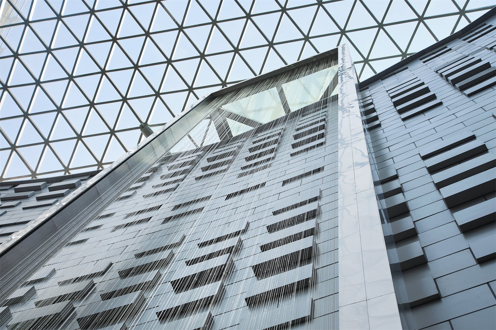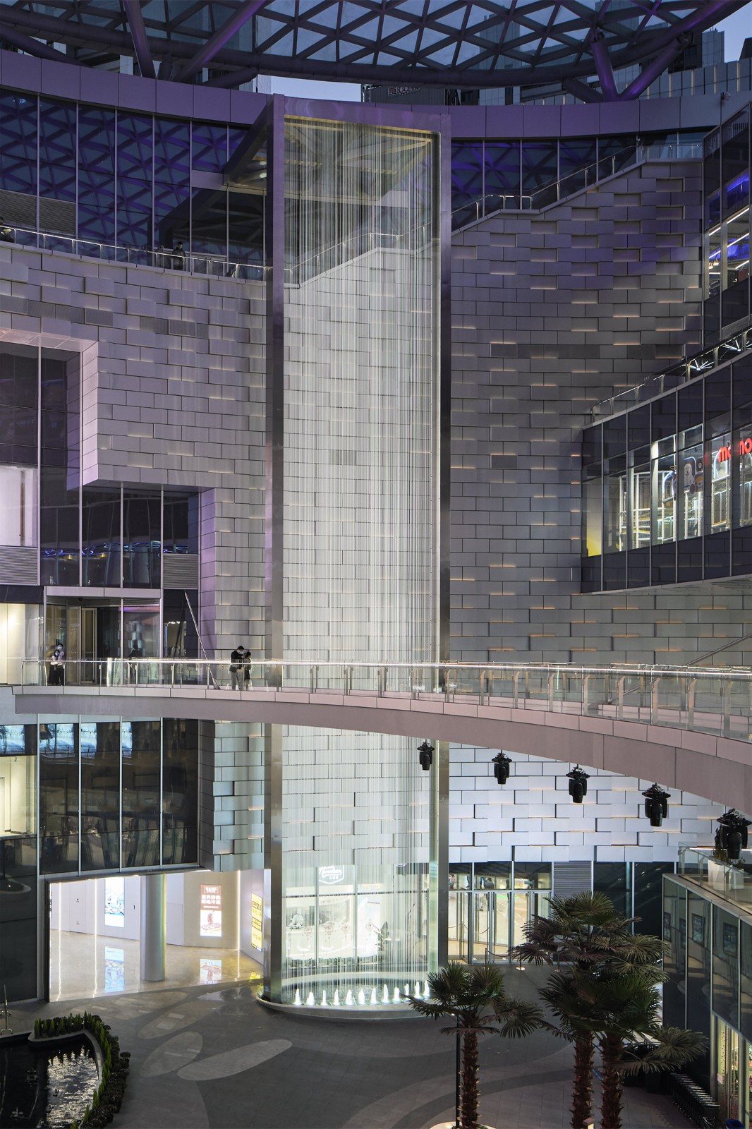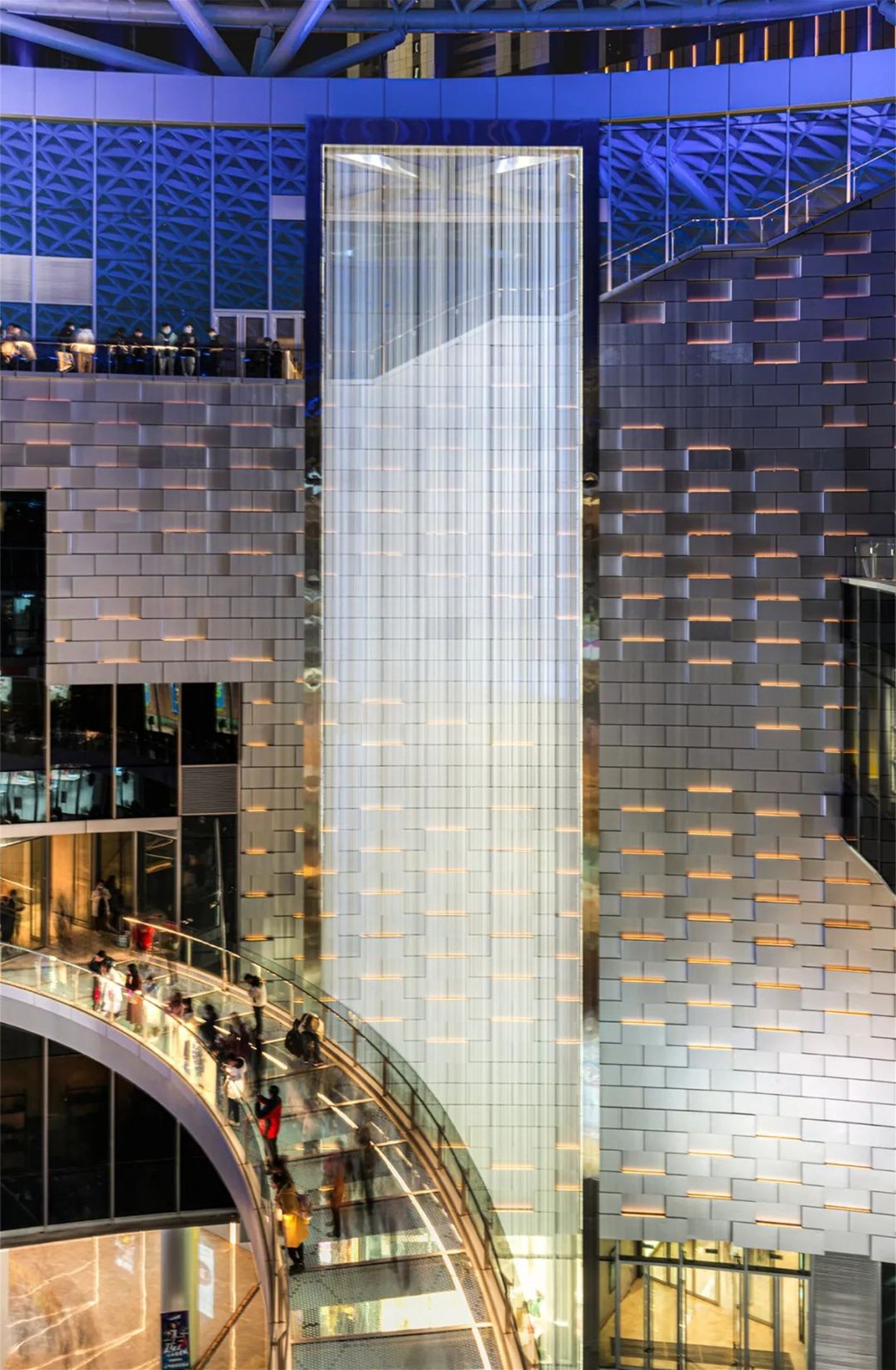 The highlight of Jiangbei Wondercity is three huge water curtains, which are 36 meters, 29 meters and 24 meters high, breaking the world record for linear water curtain height. When the exquisite and translucent water drops fall from the sky along the transparent polyester tape, it creates a dreamlike architectural space. From the height of 36 meters, the water drops shine under the ever-changing lights and shadows, just like crystals on a bead curtain.