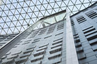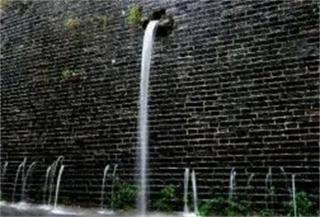 The waterfall runs through the whole building facade, reproducing the unique landscape of "dragon spit water". "Dragon spit water" is a wonder of Nanjing Ming City Wall, which has a history of more than 600 years. It was created when the rainwater needed to be discharged from the drainage system or the drainage gap formed by the water flow, which especially spectacular in the "dragon neck" section of Taiping Gate. The water curtains fall down the facade of the building, combined with brick pavement on the outer wall of the simulated city wall, which recreates this cultural symbol with Nanjing characteristics.